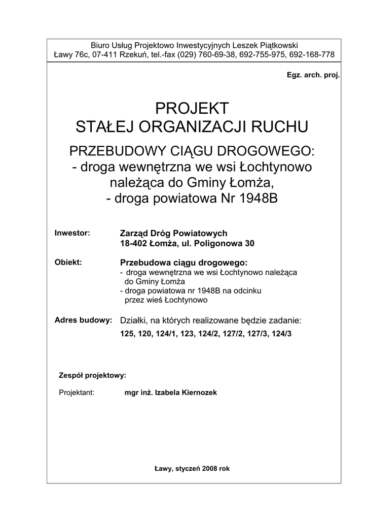 Biuro Usług Projektowo Inwestycyjnych Leszek Piątkowski Ławy 76c, 07-411 Rzekuń, tel.-fax (029) 760-69-38, 692-755-975, 692-168-778 Egz. arch. proj. PROJEKT STAŁEJ ORGANIZACJI RUCHU PRZEBUDOWY CIĄGU DROGOWEGO: - droga wewnętrzna we wsi Łochtynowo naleŜąca do Gminy ŁomŜa, - droga powiatowa Nr 1948B Inwestor: Zarząd Dróg Powiatowych 18-402 ŁomŜa, ul. Poligonowa 30 Obiekt: Przebudowa ciągu drogowego: - droga wewnętrzna we wsi Łochtynowo naleŜąca do Gminy ŁomŜa - droga powiatowa nr 1948B na odcinku przez wieś Łochtynowo Adres budowy: Działki, na których realizowane będzie zadanie: 125, 120, 124/1, 123, 124/2, 127/2, 127/3, 124/3 Zespół projektowy: Projektant: mgr inŜ. Izabela Kiernozek Ławy, styczeń 2008 rok PROJEKT STAŁEJ ORGANIZACJI RUCHU na drodze wewnętrznej naleŜącej do Gminy ŁomŜa oraz powiatowej nr 1948B przez wieś Łochtynowo od km 1+ 634,50 do km 2+489,90 Inwestor: Zarząd Dróg Powiatowych w ŁomŜy z/s ul. Poligonowa 30, 18-400 ŁomŜa Zawartość opracowania 1. Część opisowa - Karta uzgodnień 1 - Opis techniczny 2 2. Część graficzna - Rys. nr 1 – Lokalizacja szkic 4 - Rys. nr 2 – Projekt organizacji ruchu skala 1:500 5 Biuro Usług Projektowo – Inwestycyjnych Leszek Piątkowski, Ławy 76 c, 07-411 Rzekuń, tel./ fax (0-29) 760-69-38, 692-755975, 692-168-778 PROJEKT STAŁEJ ORGANIZACJI RUCHU na drodze wewnętrznej naleŜącej do Gminy ŁomŜa oraz powiatowej nr 1948B przez wieś Łochtynowo od km 1+ 634,50 do km 2+489,90 Inwestor: Zarząd Dróg Powiatowych w ŁomŜy z/s ul. Poligonowa 30, 18-400 ŁomŜa OPIS TECHNICZNY DO PROJEKTU STAŁEJ ORGANIZACJI RUCHU 1. PODSTAWA OPRACOWANIA: 1. 2. 3. 4. 5. Zlecenie Inwestora, tj. Zarządu Dróg Powiatowych w ŁomŜy, Projekt budowlany przebudowy drogi w skali 1:500. Inwentaryzacja oznakowania – sporządzone przez projektanta. Wstępne uzgodnienia oznakowania drogi z zarządami dróg. Rozporządzenie Ministrów Infrastruktury oraz Spraw Wewnętrznych i Administracji z dnia 31 lipca 2002r. w sprawie znaków i sygnałów drogowych. 6. Rozporządzenie Ministra Infrastruktury z dnia 03 lipca 2003r. w sprawie szczegółowych warunków technicznych dla znaków i sygnałów drogowych oraz urządzeń bezpieczeństwa ruchu drogowego i warunków ich umieszczania na drogach. 7. Rozporządzenie Ministra Infrastruktury z dnia 23 września 2003 r. w sprawie szczegółowych warunków zarządzania ruchem na drogach oraz wykonywania nadzoru nad tym zarządzaniem. 2. ZAKRES I PRZEDMIOT OPRACOWANIA : Opracowanie niniejsze dotyczy sporządzenia projektu stałej organizacji ruchu dla drogi wewnętrznej naleŜącej do Gminy ŁomŜa oraz drogi powiatowej nr 1948B przez wieś Łochtynowo od km 1 + 634,50 do km 2 + 489,90. Projekt przewiduje rozwiązanie oznakowania drogi w zakresie oznakowania pionowego. Istniejąca droga – przewidziana do przebudowy – znajduje się w sieci dróg gminnych gminy ŁomŜa powiatowych powiatu łomŜyńskiego, województwo podlaskie. 3. OPIS STANU ISTNIEJĄCEGO: Drogą przeznaczoną do przebudowy odbywa się ruch lokalny o natęŜeniu lekkim, ze szczególnym udziałem pojazdów osobowych – dojazd na posesje, oraz maszyn i sprzętów rolniczych – teren wiejski. Obecnie droga i wjazdy na posesje mają nawierzchnię gruntową Jezdnia ma zmienną szerokość od 5,29 do 9,01m. Projektowana droga ma skrzyŜowanie z drogą powiatową nr 1948B oraz drogą gminą, na skrzyŜowaniu z którą kończy się zakres opracowania projektu. Na projektowanym odcinku droga nie jest oznakowana znakami pionowymi ani poziomymi. 4. OPIS PRZYJĘTYCH ROZWIĄZAŃ: • • • Projektowana droga będzie miała następujące parametry: przekrój – szlakowy, szerokość jezdni – 5,5 m, spadek poprzeczny jezdni dwustronny, daszkowy – 2 %, pobocza szerokości 2 x 1,00 – 1,50 m – w zaleŜności od warunków i moŜliwości terenowych. 4.1. ZASADY I SPOSÓB OZNAKOWANIA DROGI: Po wykonaniu przebudowy zgodnie z projektem budowlanym stanowiącym odrębne opracowanie zmieni się status drogi, a szczególnie skrzyŜowań. Powstaną bowiem dwa skrzyŜowania o nawierzchni utwardzonej – w miejscu istniejącego skrzyŜowania o nawierzchni nieutwardzonej z drogą powiatową i z drogą gminną na końcu zakresu opracowania. To skrzyŜowanie ma obecnie nawierzchnie nieutwardzoną, z którą łączy się droga gminna o nawierzchni utwardzonej. Po przebudowie całe skrzyŜowanie będzie miało nawierzchnię utwardzoną na długości co najmniej 20 m, a więc takiej, która powoduje skutki w oznakowaniu drogi. Na całym odcinku znacznie poprawi się płynność ruchu i przejezdność drogi, a – co za tym idzie – bezpieczeństwo ruchu. Zostanie to osiągnięte przez wykonanie nawierzchni bitumicznej o szerokości 5,5 m na całej długości drogi i wykonanie dwustronnych poboczy szerokości od 1,00 do 1,5 m. Biuro Usług Projektowo – Inwestycyjnych Leszek Piątkowski, Ławy 76 c, 07-411 Rzekuń, tel./ fax (0-29) 760-69-38, 692-755975, 692-168-778 2 PROJEKT STAŁEJ ORGANIZACJI RUCHU na drodze wewnętrznej naleŜącej do Gminy ŁomŜa oraz powiatowej nr 1948B przez wieś Łochtynowo od km 1+ 634,50 do km 2+489,90 Inwestor: Zarząd Dróg Powiatowych w ŁomŜy z/s ul. Poligonowa 30, 18-400 ŁomŜa 4.2. OZNAKOWANIE PIONOWE: Projektowana droga będzie miała odcinku pierwszeństwo przejazdu na skrzyŜowaniu z drogą powiatową i będzie podporządkowana – na skrzyŜowaniu z drogą gminną – do tej właśnie drogi. Projektuje się – zgodnie z zasadami określonymi rozporządzeniu Ministrów Infrastruktury oraz Spraw Wewnętrznych i Administracji z dnia 31 lipca 2002r. w sprawie znaków i sygnałów drogowych oraz rozporządzeniu Ministra Infrastruktury z dnia 03 lipca 2003r. w sprawie szczegółowych warunków technicznych dla znaków i sygnałów drogowych oraz urządzeń bezpieczeństwa ruchu drogowego i warunków ich umieszczania na drogach – ustawienie następujących znaków drogowych: • Podporządkow