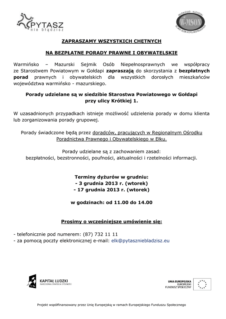 ZAPRASZAMY WSZYSTKICH CHĘTNYCH NA BEZPŁATNE PORADY PRAWNE I OBYWATELSKIE Warmińsko – Mazurski Sejmik Osób Niepełnosprawnych we współpracy ze Starostwem Powiatowym w Gołdapi zapraszają do skorzystania z bezpłatnych porad prawnych i obywatelskich dla wszystkich dorosłych mieszkańców województwa warmińsko - mazurskiego. Porady udzielane są w siedzibie Starostwa Powiatowego w Gołdapi przy ulicy Krótkiej 1. W uzasadnionych przypadkach istnieje możliwość udzielenia porady w domu klienta lub zorganizowania porady grupowej. Porady świadczone będą przez doradców, pracujących w Regionalnym Ośrodku Poradnictwa Prawnego i Obywatelskiego w Ełku. Porady udzielane są z zachowaniem zasad: bezpłatności, bezstronności, poufności, aktualności i rzetelności informacji. Terminy dyżurów w grudniu: - 3 grudnia 2013 r. (wtorek) - 17 grudnia 2013 r. (wtorek) w godzinach: od 11.00 do 14.00 Prosimy o wcześniejsze umówienie się: - telefonicznie pod numerem: (87) 732 11 11 - za pomocą poczty elektronicznej e-mail: [email protected] Projekt współfinansowany przez Unię Europejską w ramach Europejskiego Funduszu Społecznego