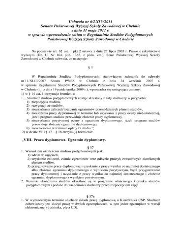 Uchwała nr 6/LXIV/2011 Senatu Państwowej Wyższej Szkoły Zawodowej w Chełmie z dnia 31 maja 2011 r. w sprawie wprowadzenia zmian w Regulaminie Studiów Podyplomowych Państwowej Wyższej Szkoły Zawodowej w Chełmie Na podstawie art. 62 ust. 1 pkt 2 ustawy z dnia 27 lipca 2005 r. Prawo o szkolnictwie wyższym (Dz. U. Nr 164, poz. 1365, z późn. zm.), Senat Państwowej Wyższej Szkoły Zawodowej w Chełmie uchwala, co następuje: §1 W Regulaminie Studiów Podyplomowych, stanowiącym załącznik do uchwały nr 11/XLIII/2007 Senatu PWSZ w Chełmie z dnia 24 września 2007 r. w sprawie Regulaminu Studiów Podyplomowych Państwowej Wyższej Szkoły Zawodowej w Chełmie (t.j. z dnia 19 października 2009 r.), wprowadza się następujące zmiany: 1) w § 14 ust. 1 otrzymuje brzmienie: 1. „Słuchacz studiów podyplomowych zostaje skreślony z listy słuchaczy w przypadku: 1) niepodjęcia studiów, 2) rezygnacji ze studiów, 3) nieuzyskania zaliczeń/niezdania egzaminów przewidzianych planem studiów, 4) niezłożenia pracy dyplomowej w terminie lub uzyskania z pracy oceny niedostatecznej, jeżeli program studiów przewiduje złożenie pracy dyplomowej, 5) nieuzyskania pozytywnej oceny z egzaminu dyplomowego, jeżeli program studiów przewiduje złożenie egzaminu dyplomowego, 6) niewniesienia w terminie opłaty za studia.”; 2) w dziale VIII § 17 – § 18 otrzymują brzmienie: „VIII. Praca dyplomowa. Egzamin dyplomowy. § 17 1. Warunkiem ukończenia studiów podyplomowych jest: 1) udział w zajęciach, 2) uzyskanie zaliczeń, zdanie egzaminów oraz odbycie praktyk zawodowych określonych planem studiów, 3) przygotowanie pracy dyplomowej i uzyskanie z pracy wyniku co najmniej dostatecznego albo złożenie egzaminu dyplomowego z wynikiem pozytywnym, bądź przygotowanie pracy dyplomowej i uzyskanie z pracy wyniku co najmniej dostatecznego i złożenie egzaminu dyplomowego z wynikiem pozytywnym. 2. Warunki ukończenia studiów określone są w programie właściwego kierunku studiów podyplomowych i podane do wiadomości słuchaczy przed rozpoczęciem zajęć. § 17a 1. W wyznaczonym terminie słuchacz składa pracę dyplomową u Kierownika CSP. Słuchacz zobowiązany jest złożyć pracę w dwóch egzemplarzach, w tym jeden egzemplarz w wersji elektronicznej (dyskietka, płyta CD). 2. Na uzasadniony wniosek słuchacza, Kierownik CSP działając z upoważnienia Rektora, może przedłużyć termin złożenia pracy. 3. Pracę dyplomową ocenia promotor pracy. 4. Słuchacz, który został skreślony z listy słuchaczy studiów podyplomowych z powodu niezłożenia pracy dyplomowej lub uzyskał z pracy ocenę negatywną może wznowić studia celem przygotowania pracy. 5. Słuchacz, może wznowić studia, celem przygotowania i złożenia pracy dyplomowej w terminie nie dłuższym niż 3 lata od planowanego terminu zakończenia studiów, o ile studia są nadal prowadzone. Wznowienie wiąże się z dodatkową opłatą. 1. 2. 3. 4. 5. 6. § 17b Egzamin dyplomowy odbywa się przed komisją powołaną przez Prorektora ds. Rozwoju i Współpracy z Zagranicą lub Kierownika CSP. W skład komisji wchodzą: przewodniczący i dwóch nauczycieli prowadzących zajęcia na danym kierunku studiów podyplomowych. Przewodniczący powinien posiadać co najmniej stopień naukowy doktora. Termin egzaminu wyznacza Kierownik CSP. W przypadku uzyskania z egzaminu dyplomowego oceny niedostatecznej, słuchaczowi przysługuje prawo powtórnego przystąpienia do tego egzaminu. Termin powtórnego egzaminu wyznacza Kierownik CSP, jednakże nie później niż w terminie 3 miesięcy od daty egzaminu pierwszego. W przypadku otrzymania oceny niedostatecznej lub nieprzystąpienia do egzaminu dyplomowego w drugim terminie, słuchacz zostaje skreślony z listy studentów. Słuchacz może wznowić studia, celem złożenia egzaminu dyplomowego w terminie nie dłuższym niż 3 lata. § 18 1. Przy obliczaniu oceny końcowej z ukończenia studiów podyplomowych bierze się po uwagę: 1) średnią arytmetyczną z uzyskanych wyników zaliczeń i egzaminów, 2) ocenę z pracy dyplomowej albo egzaminu dyplomowego, bądź ocenę z pracy dyplomowej i egzaminu dyplomowego. 2. Ocena końcowa stanowi sumę: ¾ oceny wymienionej w ust. 1 pkt 1 i ¼ oceny wymienionej w pkt 2. 3. Na świadectwie ukończenia studiów podyplomowych wpisuje się wynik według następującej zasady: do 3,25 – dostateczny (3) 3,26 – 3,75 – dostateczny plus (3,5) 3,76 – 4,25 – dobry (4) 4,26 – 4,50 – dobry plus (4,5) 4,51 – 5,00 – bardzo dobry (5)”. §2 Tekst jednolity Regulaminu Studiów Podyplomowych Państwowej Wyższej Szkoły Zawodowej w Chełmie stanowi załącznik do niniejszej uchwały. §3 Uchwała wchodzi w życie z dniem podjęcia. Przewodniczący Senatu Państwowej Wyższej Szkoły Zawodowej w Chełmie Prof. dr hab. Józef Zając