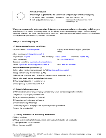 Unia Europejska Publikacja Suplementu do Dziennika Urzędowego Unii Europejskiej 2, rue Mercier, 2985 Luxembourg, Luksemburg Faks: +352 29 29 42 670 E-mail: [email protected] Informacje i formularze on-line: http:// simap.europa.eu Wstępne ogłoszenie informacyjne dotyczące umowy o świadczenie usług publicznych Standardowy formularz na potrzeby publikacji w Suplemencie do Dziennika Urzędowego Unii Europejskiej informacji zgodnie z art. 7 ust. 2 rozporządzenia 1370/2007 na rok przed rozpoczęciem procedury przetargowej lub rok przed bezpośrednim przyznaniem zamówienia. Sekcja I: Właściwy organ I.1) Nazwa, adresy i punkty kontaktowe: Krajowy numer identyfikacyjny: (jeżeli jest znany) _____ Oficjalna nazwa: Powiat Gryfiński Adres pocztowy: ul. Sprzymierzonych 4 Miejscowość: Gryfino Kod pocztowy: 74-100 Gryfino Punkt kontaktowy: _____ Państwo: Polska (PL) Tel.: +48 0914045000 Osoba do kontaktów: Agnieszka Madejak-Saków E-mail: [email protected] Faks: +48 0914045000 Adresy internetowe: (jeżeli dotyczy) Ogólny adres instytucji zamawiającej: (URL) http://bip.gryfino.powiat.pl Dostęp elektroniczny do informacji: (URL) _____ Elektroniczne składanie ofert i wniosków o dopuszczenie do udziału: (URL) _____ Więcej informacji można uzyskać pod adresem Powyższy(-e) punkt(-y) kontaktowy(-e) Inny (proszę wypełnić załącznik A.I) I.2) Rodzaj właściwego organu Ministerstwo lub inny organ krajowy lub federalny, w tym jednostki regionalne i lokalne Agencja/urząd krajowy lub federalny Organ władzy regionalnej lub lokalnej Agencja/urząd regionalny lub lokalny Podmiot prawa publicznego Instytucja/agencja europejska lub organizacja międzynarodowa Inna: (proszę określić) I.3) Główny przedmiot lub przedmioty działalności Usługi kolejowe Usługi kolei miejskiej/kolei lekkiej, metra, tramwajów, trolejbusów lub autobusów Żegluga morska lub śródlądowa Inny: (proszę określić) PL Formularz standardowy T01 - 1370/07 – art. 7 ust. 2 - Wstępne ogłoszenie informacyjne dotyczące umowy o świadczenie usług publicznych 1 / 11 Administracja publiczna I.4) Udzielenie zamówienia w imieniu innych właściwych organów Właściwy organ dokonuje zakupu w imieniu innych właściwych organów: tak nie (jeżeli tak, więcej informacji o tych właściwych organach można podać w załączniku A.II) PL Formularz standardowy T01 - 1370/07 – art. 7 ust. 2 - Wstępne ogłoszenie informacyjne dotyczące umowy o świadczenie usług publicznych 2 / 11 Sekcja II: Przedmiot zamówienia II.1) Opis: II.1.1) Nazwa nadana zamówieniu: Organizowanie publicznego transportu zbiorowego na podstawie art. 15 ust. 1 pkt 12 ustawy z dnia 16 grudnia 2010 roku o publicznym transporcie zbiorowym (Dz. U. z 2011 r. nr 5, poz. 13), w związku z art. 7 ust. 2 rozporządzenia (WE) nr 1370/2007 Parlamentu Europejskiego i Rady z dnia 23 października 2007r dotyczące usług publicznych w zakresie drogowego transportu pasażerskiego oraz uchylające rozporządzenie Rady (EWG) nr 1191/69 i (EWG) nr 1107/70. II.1.2) Rodzaj zamówienia, dziedzina(-y), której(-ych) dotyczą usługi transportu publicznego: Kategoria usług: nr: T-05 (Zob. kategorie usług w załączniku B) Dziedziny, których dotyczą usługi transportu publicznego: Transport pasażerski Kod NUTS: PL425 II.1.3) Krótki opis zamówienia: Dokonanie wyboru operatora w trybie art. 19 ust. 1 pkt 2 ustawy o publicznym transporcie zbiorowym, tj. ustawy z dnia 9 stycznia 2009r. o koncesji na roboty budowlane lub usługi (Dz. U. z 2015r. poz. 113) na sieć komunikacyjną w transporcie drogowym Powiatu Gryfińskiego zawartej w uchwale Rady Powiatu nr XL/285/2014 z dnia 30.X.2014r. II.1.4) Wspólny Słownik Zamówień (CPV) Główny przedmiot Słownik główny 60112000 Słownik uzupełniający (jeżeli dotyczy) II.1.5) Informacje na temat podwykonawstwa Przewidywane jest zlecenie podwykonawstwa: tak nie (jeżeli tak) Wartość lub część zamówienia, które prawdopodobnie będzie zlecone stronom trzecim: minimalny procent: _____ (%), maksymalny procent: _____ (%) wartości zamówienia albo Nieznana Krótki opis wartości/części zamówienia, które będzie zlecone podwykonawcom: _____ II.2) Ilość i/lub wartość usług Opis: _____ km usług publicznych w zakresie transportu pasażerskiego: _____ Szacunkowy koszt bez VAT: (proszę podać wyłącznie dane liczbowe) _____ albo Zakres: między _____ i _____ Waluta: Waluta: II.3) Planowana data rozpoczęcia i czas trwania zamówienia lub termin realizacji Rozpoczęcie: 01/01/2017 (dd/mm/rrrr) Okres w miesiącach: 36 albo w dniach: _____ (od udzielenia zamówienia) PL Formularz standardowy T01 - 1370/07 – art. 7 ust. 2 - Wstępne ogłoszenie informacyjne dotyczące umowy o świadczenie usług publicznych 3 / 11 Sekcja III: Informacje o charakterze prawnym, ekonomicznym, finansowym i technicznym III.1) Warunki dotyczące zamówienia: III.1.1) Parametry kosztów w celu obliczenia rekompensaty: _____ III.1.2) Informacje o wyłącznych prawach: Przyznano wyłączne prawa tak nie (jeżeli tak) Wyszczególnienie przyznanych wyłącznych praw: _____ III.1.3) Podział przychodów ze sprzedaży biletów: Odsetek przydzielony podmiotowi świadczącemu usługi publiczne: _____ (%) (uznaje się, że pozostała część jest przyznawana właściwemu organowi) III.1.4) Standardy socjalne: (przejęcie personelu zgodnie z dyrektywą 2001/23/WE) Wykaz wymaganych standardów (w tym lista pracowników, których to dotyczy, szczegółowe informacje na temat umownych praw i zobowiązań pracowników oraz warunków, na jakich pracowników uznaje się za związanych ze świadczonymi usługami): _____ III.1.5) Zobowiązania do świadczenia usług publicznych: Wyszczególnienie: _____ III.1.6) Inne szczególne warunki: Wykonanie zamówienia podlega szczególnym warunkom (jeżeli tak) Opis szczególnych warunków: _____ tak nie III.2) Warunki udziału: III.2.1) Zdolność ekonomiczna i finansowa: Informacje i formalności koni