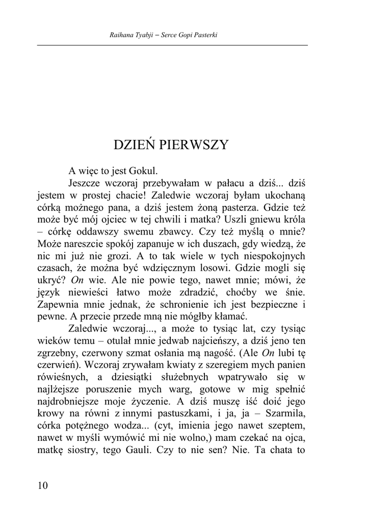 Raihana Tyabji – Serce Gopi Pasterki DZIEŃ PIERWSZY A więc to jest Gokul. Jeszcze wczoraj przebywałam w pałacu a dziś... dziś jestem w prostej chacie! Zaledwie wczoraj byłam ukochaną córką możnego pana, a dziś jestem żoną pasterza. Gdzie też może być mój ojciec w tej chwili i matka? Uszli gniewu króla – córkę oddawszy swemu zbawcy. Czy też myślą o mnie? Może nareszcie spokój zapanuje w ich duszach, gdy wiedzą, że nic mi już nie grozi. A to tak wiele w tych niespokojnych czasach, że można być wdzięcznym losowi. Gdzie mogli się ukryć? On wie. Ale nie powie tego, nawet mnie; mówi, że język niewieści łatwo może zdradzić, choćby we śnie. Zapewnia mnie jednak, że schronienie ich jest bezpieczne i pewne. A przecie przede mną nie mógłby kłamać. Zaledwie wczoraj..., a może to tysiąc lat, czy tysiąc wieków temu – otulał mnie jedwab najcieńszy, a dziś jeno ten zgrzebny, czerwony szmat osłania mą nagość. (Ale On lubi tę czerwień). Wczoraj zrywałam kwiaty z szeregiem mych panien rówieśnych, a dziesiątki służebnych wpatrywało się w najlżejsze poruszenie mych warg, gotowe w mig spełnić najdrobniejsze moje życzenie. A dziś muszę iść doić jego krowy na równi z innymi pastuszkami, i ja, ja – Szarmila, córka potężnego wodza... (cyt, imienia jego nawet szeptem, nawet w myśli wymówić mi nie wolno,) mam czekać na ojca, matkę siostry, tego Gauli. Czy to nie sen? Nie. Ta chata to 10 Raihana Tyabji – Serce Gopi Pasterki rzecywistość. I to czerwone sari, co mnie okrywa jest też rzeczywiste i ziemia na której spałam... Zaledwie wczoraj... Ach po cóż wspominać wczoraj? Nasz Guru mądrze mówił, gdy radził memu ojcu przeszłość uważać za niebyłą, bowiem już nie istnieje, a przyszłość też za nie rzeczywistą, gdyż jeszcze jej niema. Ten Gokul jest jednak przyjemny. On, ten pasterz, co uratował mi życie i wziął je sobie na własność, jest dla mnie łaskawy. I ojciec jego jest pełen dobroci. Matka... ach, dla niej jestem obca. Kocha syna; jakżeby więc mogła kochać mnie, która – jak sądzi – odebrałam go jej na zawsze. A siostry... Nie, nie będę myśleć o jego siostrach. Dobrze pamiętam słowa naszego Guru: „Staraj się nie widzieć przywar i usterek ludzi, a jeśli je widzisz, nie mów o nich.“ Ach Gurudżi drogi, nigdy już chyba nie usłyszę słów twej mądrości. Jednak, jeśli je chociaż raz słyszałam, powinnam żyć wedle nich, a może przyjdzie spokój. O, bo serce me zdaje się pękać, w głowie huczy i tętni, a pod powiekami palą niewypłakane łzy... No, no Szarmilo, odwagi! Przypomnij sobie, co mówił nasz Guru: „Tylko ten jest prawdziwie dzielny, który wśród największego mroku zdoła myśleć o światłości.“ A ja wszak jestem mężna. Czyż nie pochodzę z prastarego rodu wodzów, z których każdy słynął z odwagi i orężnej dzielności? A może jeszcze jakiś dar nieznany ukrywa tu dla mnie życie? Kto wie. Czyż nie zapewniał nasz Guru zawsze, iż Bóg odbiera nam dary jedną ręką, tylko po to by nas drugą jeszcze szczodrzej obdarzyć? Więc odwagi Szarmilo! Staraj się myśleć o tym, co dobre i jasne. Gokul jest przecie piękny. Tak ślicznie śpiewają tu ptaki... „Pijii, pijii, pijii“ i „Pijuu, pijuu, pijuu.“ Wciąż „piji“ i „piju.“ Ale cóż one mogą wiedzieć o miłości i bólu? A coż wiedziała o nich Szarmila? Jeszcze wczoraj nie wiedziała nic. A dziś...? O, dziś..., dziś wie dobrze. Jak dzielnie drzewa opierają się wiatrom i ochoczo chwieją gałązkami. Spójrz jak delikatne witki pnącza Madhu-Malati, otaczają pień drzewa 11 Raihana Tyabji – Serce Gopi Pasterki swym zielonym oplotem, podobne wiotkim ramionom kochającej kobiety, otaczającym miłośnie silne barki pana jej serca... A papaja śpiewa miłość krążącą sokami w jej żyłach zielonych. A wietrzyk jest jak dziecko figlarne, co bawi się raz jedną, raz drugą rozkwieconą gałązką. A kwiaty są jak tkliwe myśli matki o swym dzieciątku... . Tak, ten Gokul jest jednak piękny. Lecz cóż to znaczy? Czyż cała przyroda nie jest tylko zwierciadłem duszy człowieka? Nowe, nieznane mi dotąd myśli tłoczą się do głowy i zdają się ją rozsadzać. O, nie spostrzegłam, że mam sari podarte. On się zmartwi. Nie chcę, aby się martwił, nie chcę, aby był smutny. Jeszcze wczoraj nie wiedziałam o jego istnieniu, a dziś nie chcę go widzieć smutnym. Dziwne zaiste jest serce dziewczęce. O wschodzie zastał mnie dziś klęczącą nad strumykiem, co biegnie przez pobliski gaj. Rozpuściłam właśnie włosy, a świeży „tilak“ świecił na mym czole. Patrzył na mnie długo i rzekł: „Zaprawdę, jesteś jak ten wiotki pnącz i jak kwiat i jak ten strumyk i rzeka.... Sam nie wiem, do czego cię przyrównać, bowiem całe piękno ziemi zawarło się w tobie.“ Rumieniec zalał mą twarz i spuściłam głowę. A wówczas dodał łagodnie i w zamyśleniu, a jednak głosem dziwnie radosnym: „A tilak na twym czole jest jak słońce czerwone na szafirze nieba, a brwi twoje jak dwa odwrócone sierpeczki księżyca wpośród nocy czarnej, a usta twe chyba sam Madan stworzył, na zatracenie takich biednych śniertelników jak ja...“ Nigdy nie słyszałam podobnych słów. Oniemiałam i lęk mnie jakiś ogarnął a zarazem radość nieznana, choć nie wiem, jak mogą one istnieć w sercu jednocześnie. Prawie ukradkiem rzuciłam nań wzrokiem, przez rozpuszczone warkocze, a widok tego wspaniałego, jak młody bóg bohatera, na kolanach przed kobietą, napełnił mnie nagle dumą i poczuciem własnej siły. Czułam, że słabość moja jest zarazem potęgą. I z sercem pełnym najsprzeczniejszych uczuć – co jest chyba przyrodzoną cechą natury kobiecej – uśmiechnęłam się. A on zatoczył się i 12 Raihana Tyabji – Serce Gopi Pasterki wykrzyknął zasłaniając oczy: „Ach zwyciężyłaś mnie, zwyciężyłaś...“ 