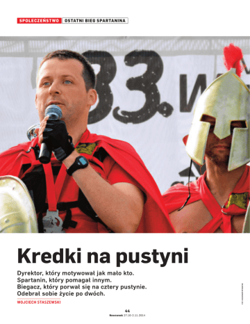 SPOŁECZEŃSTWO OSTATNI BIEG SPARTANINA Dyrektor, który motywował jak mało kto. Spartanin, który pomagał innym. Biegacz, który porwał się na cztery pustynie. Odebrał sobie życie po dwóch. WOJCIECH STASZEWSKI 44 Newsweek 2 7. 1 0 - 2 . 1 1 . 2 0 1 4 FOT. ARCHIWUM PRYWATNE Kredki na pustyni REKLAMA MARCIN ŻUK na konferencji prasowej przed 33. Maratonem Warszawskim, 21 września 2011 roku Kula z trupią czaszką – Wybieram się na Mont Blanc – mówi jej w tańcu. Jest 1999 rok, impreza pracownicza w korporacji. Marcin jest już specjalistą z sześcioletnim stażem, a Małgorzata dziewczyną z infolinii. Zakochuje się w dorosłym mężczyźnie. Dopiero co skończył studia (zarządzanie UW), ale od pierwszego roku pracował, był najmłodszym agentem ubezpieczeniowym w historii firmy. Wygadany, przystojny, z własnymi pasjami. Zwiedzają Polskę, bo Marcin jeździ po kraju ze szkoleniami motywacyjnymi dla agentów firmy, Małgorzata jeździ z nim. Na Mont Blanc Marcin wchodzi w lecie 2000 roku. Dwaj koledzy się wycofali, dociera do celu sam. Gra w kręgle. Walczy w mistrzostwach Polski. Daniel Lewczuk, z którym w liceum grali w koszykówkę, a potem biegali po pustyniach, pamięta budzącą lekkie przerażenie kulę Marcina: przezroczysta z trójwymiarową trupią czaszką w środku. Rodzice Marcina budują się pod Warszawą, młodzi stawiają domek na tej samej działce. Biorą wspólny kredyt we frankach, waluta jest po 2 złote. Rodzina nawróciła się na protestantyzm, kiedy Marcin był w liceum. Przezywali go Pastor, bo chodził z pokreślonym Pismem Świętym, potrafił zagiąć księdza na religii. Wiosną 2005 roku biorą ślub z Małgosią. W firmie Marcin awansuje na dyrektora projektów sprzedażowych. To tak, jakby znów wszedł na Mont Blanc. D la Marcina Żuka nie ma rzeczy niemożliwych. Kiedy wiosną tego roku w czteroosobowej ekipie biegaczy lecą do Chin, Marcin prosi do siebie kapitana. Mówi: – Dla nas jest zaszczytem, że możemy lecieć Dreamlinerem, ale dla was jest zaszczytem, że możecie nas wieźć. Dlatego powinniśmy siedzieć w kabinie pilotów. Obciach? – Ale pięć minut później rzeczywiście siedzieliśmy w kabinie pilotów – opowiada Daniel. Ile złotych na jeden krok W przedszkolu specjalnym Orzeszek pod Poznaniem bieda aż piszczy. Brakuje sprzętu rehabilitacyjnego, a nawet papieru i kredek. Nie ma na materace, dzieci śpią na podłodze na kocach. To na Orzeszek zbierają Spartanie podczas poznańskiego maratonu w 2012 roku. Charytatywną grupę biegową założyli Michał Leśniewski (ma niepełnosprawną córkę) razem z trenerem Jackiem Gardenerem. Pomysł był prosty: będą biegać maratony w strojach Spartan, bo 45 Newsweek 2 7. 1 0 - 2 . 1 1 . 2 0 1 4 SPOŁECZEŃSTWO OSTATNI BIEG SPARTANINA dwa tysiące lat temu Spartanie nie zdążyli z pomocą Ateńczykom, a teraz zdążą z pomocą dla niepełnosprawnych dzieci. Ale medialny napęd daje im Marcin. Przed Maratonem Warszawskim ustala z dyrektorem biegu Markiem Troniną, że grupka Spartan pojawi się na konferencji prasowej przed imprezą. Nazajutrz wszystkie gazety o nich piszą. Bombarduje dziennikarzy e-mailami i esemesami: „Napisz o Spartanach”, często o świcie. Nie jest zbyt mocnym biegaczem, często chodzi w okolicy mety i opowiada o Spartanach. A ludzie wpłacają. Ciśnie też Spartan: – Zrób zbiórkę u siebie w pracy, namów ludzi, żeby przekazali naszym podopiecznym 1 procent. Wprowadza styl korporacyjny. Wymaga, żeby ludzie przygotowywali raporty o przeprowadzonych przez siebie zbiórkach. Każdą zbiórkę podsumowuje: ile wyszło pieniędzy na jedno dziecko, ile na jeden kilometr biegu, ile na jeden krok. Egzekwuje relacje, które przesyła do PAP, do gazet i telewizji. Roztacza wizje: – Zbieramy 3 tysiące złotych? To będziemy zbierać 300 tys.! Jest nas 30? To za rok będzie nas 300! Spartanie mają dosyć. Zaangażowali się w projekt z potrzeby serca, żeby uciec od korporacyjnego drylu, nadać swojemu bieganiu dodatkowy sens. Chcą cieszyć się swoim towarzystwem, a nie – realizować cele. – Marcin był ofiarą korporacji – ocenia jeden z nich. – Zrobiła z niego guru, napompowała do granic możliwości, a potem spuściła z niego powietrze. 13 miesięcy w łóżku W firmie jest na szczycie, ale nie wszystko mu pasuje. Zwierza się żonie, że musi motywować ludzi do sprzedaży produktów, których sam by nie chciał kupić. Ale i tak wypowiedzenie trafia go jak grom z jasnego nieba. Jakby go nagle strącili z Olimpu. Jest grudzień 2012 roku. Marcin po 19 latach pracy kładzie się na kanapie. – Masz dwie ręce, dwie nogi, sprawny mózg, doświadczenie zawodowe, obłędną wiedzę ekonomiczną, możesz pracować wszędzie – motywuje go Małgorzata. – Racjonalnie czuję, że masz rację, ale fizycznie i mentalnie nie mam siły – odpowiada Marcin. Wstaje rano, sprząta w domu, robi zakupy i tyle. Uświadamiają sobie, że to może być choroba. Marcin idzie do specjalisty, leczy się, zaczyna szukać pracy. – Masz trudne CV. Widać, że nie można ci zaproponować trzech tysięcy, ale kandydatów na dyrektorów jest w Polsce wielu – mówi znajomy. Zaprasza go na rozmowę w firmie doradztwa finansowego. Po 13 miesiącach Marcin wraca do pracy. Bliskim znajomym prezesa firmy okazuje się Daniel od koszykówki. Danielowi ( jest dziś przedsiębiorcą) od kilku lat chodzi po głowie wielkie wyzwanie: cykl 4deserts, kilkudniowe ultramaratony na pustyniach. Sahara, Gobi, Atakama i Antarktyda. Nie ukończył go dotąd żaden Polak. Marcin zapala się natychmiast. Na jednym ze zdjęć z pustyni Gobi Marcin daje mongolskiej dziewczynce pudełko kredek. Biegł z tymi kredkami przez pięć dni, żeby je zanieść tam, gdzie cywilizacja nie dociera Małgorzata wie, nie mają na to pieniędzy (koszt jednego biegu to 20-25 tys. zł, a Antarktydy dwa razy tyle), bo oszczędności się skończyły, a dusi ich ciągle kredyt (fr