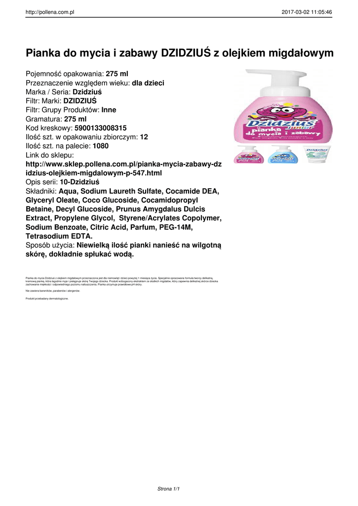http://pollena.com.pl 2017-03-02 11:05:46 Pianka do mycia i zabawy DZIDZIUŚ z olejkiem migdałowym Pojemność opakowania: 275 ml Przeznaczenie względem wieku: dla dzieci Marka / Seria: Dzidziuś Filtr: Marki: DZIDZIUŚ Filtr: Grupy Produktów: Inne Gramatura: 275 ml Kod kreskowy: 5900133008315 Ilość szt. w opakowaniu zbiorczym: 12 Ilość szt. na palecie: 1080 Link do sklepu: http://www.sklep.pollena.com.pl/pianka-mycia-zabawy-dz idzius-olejkiem-migdalowym-p-547.html Opis serii: 10-Dzidziuś Składniki: Aqua, Sodium Laureth Sulfate, Cocamide DEA, Glyceryl Oleate, Coco Glucoside, Cocamidopropyl Betaine, Decyl Glucoside, Prunus Amygdalus Dulcis Extract, Propylene Glycol, Styrene/Acrylates Copolymer, Sodium Benzoate, Citric Acid, Parfum, PEG-14M, Tetrasodium EDTA. Sposób użycia: Niewielką ilość pianki nanieść na wilgotną skórę, dokładnie spłukać wodą. Pianka do mycia Dzidziuś z olejkiem migdałowym przeznaczona jest dla niemowląt i dzieci powyżej 1 miesiąca życia. Specjalnie opracowana formuła tworzy delikatną, kremową piankę, która łagodnie myje i pielęgnuje skórę Twojego dziecka. Produkt wzbogacony ekstraktem ze słodkich migdałów, który zapewnia delikatnej skórze dziecka zachowanie miękkości i odpowiedniego poziomu natłuszczenia. Pianka utrzymuje prawidłowe pH skóry. Nie zawiera barwników, parabenów i alergenów. Produkt przebadany dermatologiczne. Strona 1/1