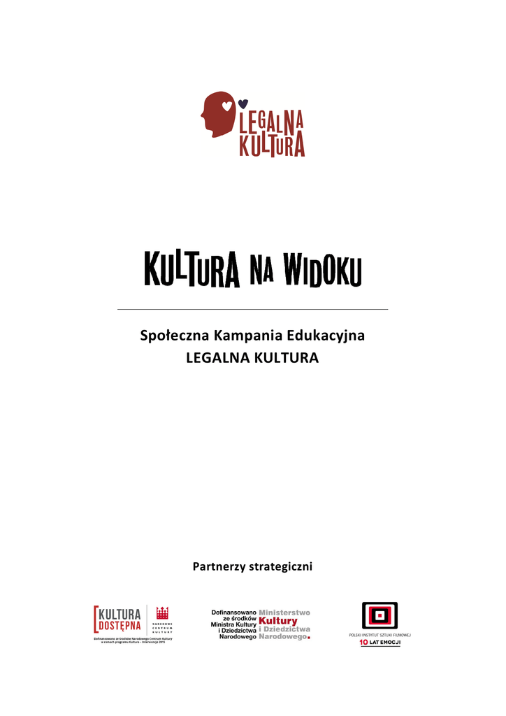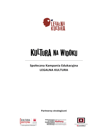 Społeczna Kampania Edukacyjna LEGALNA KULTURA Partnerzy strategiczni Spis treści Projekt Kultura Na Widoku ………………………………………………………………………………………………………………. 3 25 lat Samorządności ………………………………………………………………………………………………………………………... 7 O Legalnej Kulturze ………………………………………………………………………………………………………………………….. 8 Co nas nurtuje? …………………………………………………………………………………………………………………………………. 9 Edukacja Legalnej Kultury ………………………………………………………………………………………………………………….10 Prawo w kulturze …………………………………………………………………………………………………………………………….. 11 Prawo autorskie w działalności dziennikarskiej ………………………………………………………………………………… 12 Badania Legalnej Kultury …………………………………………………………………………………………………………………. 14 Wyszukiwarka Legalnych Treści ……………………………………………………………………………………………………….. 16 Kontakt Marta Antczak, tel. 601 440 027, [email protected] Fundacja Legalna Kultura, tel. 22 891 04 19, [email protected], [email protected] lato 2015 2 KULTURA NA WIDOKU Filmy, muzyka, książki, gry i archiwalia – ponad 900 utworów w cyfrowej wersji można znaleźć na instalacjach Kultury Na Widoku. Projekt będzie dostępny do 11 października w całej Polsce. Multimedialne biblioteki odwiedzą 48 miejsc i 14 festiwali, podczas których posiadacze smartfonów, tabletów oraz użytkownicy Internetu w prosty sposób będą mogli pobierać interesujące ich utwory i poznawać bogactwo legalnych źródeł w sieci. Projekt realizuje Fundacja Legalna Kultura. Partnerami strategicznymi są Ministerstwo Kultury i Dziedzictwa Narodowego, Narodowe Centrum Kultury oraz Polski Instytut Sztuki Filmowej. Kultura Na Widoku to multimedialny projekt, który daje dostęp do bogactwa zasobów legalnych źródeł kultury w cyfrowym wydaniu, dosłownie i w przenośni, wychodząc naprzeciw współczesnemu odbiorcy. Regały Kultury Na Widoku to uliczne wirtualne biblioteki ustawione w centralnych punktach miast oraz w miejscach wydarzeń kulturalnych. Można z nich pobrać filmy, muzykę, książki i gry z legalnych źródeł. Sercem projektu jest strona internetowa. Niezależnie od preferencji i miejsca zamieszkania – ponad wszelkimi barierami – miliony odbiorców mogą korzystać z bogatej oferty kulturalnej, ponieważ wszystkie utwory są dostępne również na www.kulturanawidoku.pl. W tej edycji Kultura Na Widoku rozszerza swój zasięg dzięki plakatom, z których – podobnie jak z multimedialnych regałów – można pozyskiwać udostępniane utwory. Do kilkuset miast i miasteczek z utrudnionym dostępem do kultury dotrze kilkadziesiąt tysięcy plakatów Kultury Na Widoku, które goszcząc w przestrzeni publicznej oraz w bibliotekach, domach kultury i szkołach, będą zachęcać do sięgania po kulturę z legalnych źródeł. Projekt ma na celu budowanie świadomego uczestnictwa w kulturze i jest skierowany do wszystkich – nigdy nie jest za wcześnie i nigdy nie jest za późno, żeby wyrobić w sobie nawyk sięgania po kulturę z legalnych źródeł. „Bardzo podoba mi się to, że kultura z legalnych źródeł wyszła odbiorcy na spotkanie. Stanęła na trotuarze i czeka na niego. To jest fantastyczna idea!” – mówi Danuta Stenka. „Oglądałbym filmy z legalnych źródeł, gdyby były dostępne i gdybym wiedział, gdzie ich szukać” – często argumentują internauci. Fundacja Legalna Kultura za pomocą tego projektu postanowiła pokazać w praktyce, że kultura pochodząca z legalnych źródeł jest dostępna, jest na widoku i na wyciągnięcie ręki. BOGACTWO ZASOBÓW Z LEGALNYCH ŹRÓDEŁ Kultura Na Widoku to ponad 900 utworów skatalogowanych w pięciu kategoriach: FILM, MUZYKA, KSIĄŻKI, GRY, HISTORIA W KULTURZE. Wśród tytułów wymienić można m.in. albumy muzyczne nagradzanych polskich artystów – Natalii Przybysz, Artura Rojka, Afromental, Meli Koteluk, Natalii Kukulskiej, Lemona czy Voo Voo, literackie bestsellery, takie jak powieść Olgi Tokarczuk „Księgi Jakubowe”, „Ziarno prawdy” Zygmunta Miłoszewskiego czy audiobook wg powieści Philipa K. Dicka „Blade Runner” z udziałem m.in. Roberta Więckiewicza, Andrzeja Chyry i Agnieszki Grochowskiej. Regał „Film” to kino na wyciągnięcie ręki. Znajdują się tu polskie produkcje filmowe ostatnich lat – filmy fabularne, dokumentalne, animowane, międzynarodowe koprodukcje – które powstały dzięki wsparciu finansowemu Polskiego Instytutu Sztuki Filmowej. W projekcie przedstawione zostały wybrane dzieła kinematografii, które dają świadectwo sukcesu polskiego kina ostatniej dekady. Wszyscy zainteresowani mogą tu znaleźć oscarową „Idę” oraz ponad 100 największych przebojów filmowych ostatnich dziesięciu lat, jak na przykład „Rezerwat”, „Bogowie”, „Jack Strong” czy „Obława”. lato 2015 3 Jeden z regałów poświęcony jest historii Polski w kulturze. Odbiorcy Kultury Na Widoku otrzymują dostęp do filmów, książek i muzyki, prezentujących historię Polski. Szczególne miejsce zajmuje kolekcja zdjęć i plakatów dokumentująca 25-lecie Samorządności w Polsce (z zasobów Ośrodka Karta i Europejskiego Centrum Solidarności). - Mija właśnie 25 lat, odkąd Polacy w pierwszych, powojennych, w pełni wolnych wyborach, mogli wybrać swoich przedstawicieli. Po przywróceniu s