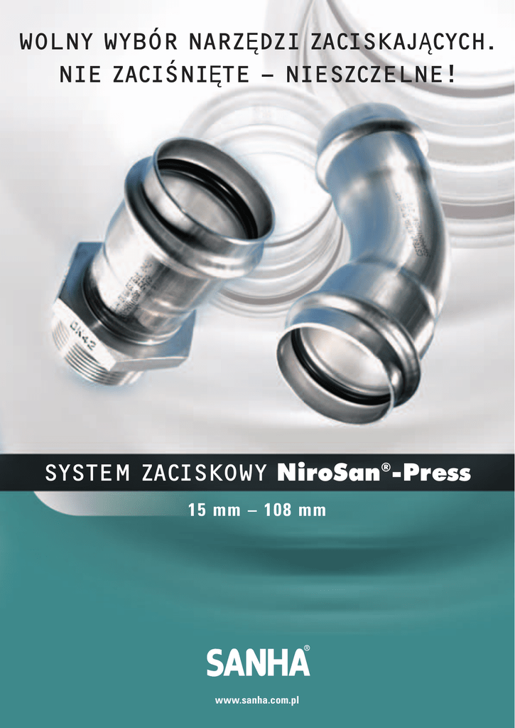 WOLNY WYBÓR NARZ¢DZI ZACISKAJÑCYCH. NIE ZACIŚNI¢TE – NIESZCZELNE! SYSTEM ZACISKOWY NiroSan®-Press 15 mm – 108 mm www.sanha.com.pl SYSTEM ZACISKOWY NiroSan®-Press PE¸ NA KOMPATYBILNOŚĆ NARZ¢DZI GWARANCJA SZCZELNOŚCI Pe∏na kompatybilnoÊç! Z∏àczki systemu zaciskowego NiroSan®-Press mo˝na zaciskaç wszystkimi dost´pnymi szcz´kami oraz maszynami zaciskajàcymi przeznaczonymi do zaciskowych systemów metalowych typu M-MM (∏àcznie z 54 mm). Nie zaciÊni´te nieszczelne! System zaciskowy NiroSan®-Press jest tak skonstruowany, ˝e podczas próby ciÊnieniowej z∏àczki nie zaciÊni´te na pewno wyka˝à nieszczelnoÊç. To gwarantujemy! Szczególnie ∏agodny profil zaciÊni´cia! • 8 – kàtny do 35 mm • 9 – kàtny do 54 mm • Profil trochoidalny do 108 mm Przez sto˝kowe odkszta∏cenie rury system zaciskowy NiroSan®-Press zabezpieczony jest równie˝ przed nadzwyczaj du˝ymi udarami ciÊnienia. Obszerny zakres gwarancji! SANHA® ponosi w pe∏ni odpowiedzialnoÊç za szczelnoÊç po∏àczenia! JakoÊç potwierdzona wprzez wiele instytutów! System zaciskowy NiroSan®-Press posiada aprbat´ nie tylko COBRTI Instal oraz PZH lecz równie˝ wielu innych wa˝nych zagranicznych jednostek certyfikujàcych np. DVGW, SVGW itd. Szeroki asortyment produktów dla wody pitnej, C.O., gazów, instalacji solarnych, przemys∏u! SANHA® oferuje nie tylko ca∏kowità szczelnoÊç po∏àczeƒ oraz odpornoÊç na wyciàganie w zakresie od 15 mm do 108 mm bez stosowania Êrodków pomocniczych takich jak pierÊcienie zacinajàce lub podobne, ale równie˝ pe∏nà dost´pnoÊç towaru na magazynie Profil 8-kàtny 15 mm do 35 mm Profil 9-kàtny 42 mm i 54 mm Profil trochoidalny 76,1 mm do 108 mm ODPOWIEDNIA Z¸ÑCZKA DO KONKRETNEGO ZASTOSOWANIA! Czy to dla wody pitnej oraz C.O., techniki solarnej, przemys∏u (równie˝ w wersji wolnej od silikonu) SANHA® oferuje dedykowane rozwiàzanie do ka˝dego z obszarów zastosowania! NiroSan® Rury systemowe serii 9000 materia∏ nr 1.4404 wg PN-EN 10088, wyprodukowane zgodnie z PN-EN 10312 Rury systemowe NiroSan® serii 9000 stosuje si´ razem ze z∏àczkami systemu zaciskowego NiroSan®-Press serii 9000 (woda pitna), NiroSan®-Press Gas 17000 (gaz)* i NiroSan®-Press Industry 18000 (przemys∏). * Aktualnie nie ma mo˝liwoÊci stosowania tego typu po∏àczeƒ do instalacji gazów palnych w Polsce NiroSan® - Rury systemowe serii 19000 materia∏ nr 1.4404 wg PN-EN 10088, wolne od silikonu, pakowane pojedynczo, wyprodukowane zgodnie z PN-EN 10312. Rury systemowe- NiroSan® serii 19000 stosuje si´ razem ze z∏àczkami systemu zaciskowego NiroSan®-Press SF serii 19000 (wolne od silikonu). NiroSan®-Press - z∏àczki systemu zaciskowego seria 9000 (woda pitna) Gatunek materia∏u: 1.4404 (elementy formowane), 1.4408 (elementy gwintowane/ odlewy precyzyjne ze stali szlachetnej), o-ring z EPDM Certyfikowane przez COBRTI Instal oraz PZH jak równie˝ inne zagraniczne jednostki certyfikujàce jak DVGW, ÖVGW i SVGW. Z∏àczki systemu zaciskowego NiroSan®-Press - wraz z rurami systemowymi NiroSan® - serii 9000 mo˝na stosowaç do: • instalacja wody pitnej • instalacji C.O. • instalacji tryskaczowej mokrej (po indywidualnych uzgodnieniu z naszym Dzia∏em Doradztwa Technicznego oraz inwestorem) • wody cz´Êciowo i w ca∏kowicie zdemineralizowanej, wody osmotycznej, wody destylowanej • powietrza spr´˝onego przy zawartoÊci oleju do 25mg/m3 powietrza (klasa 5 wg ISO 8573-1) W razie dalszych pytaƒ dotyczàcych mo˝liwoÊci zastosowania systemów zaciskowych prosimy zwracaç si´ do naszego Dzia∏u Doradztwa Technicznego: tel. /+48/ 076 857-29-01 NiroSan®-Press Gas - z∏àczki systemu zaciskowego serii 17000 (gaz) Gatunek materia∏u: 1.4404 (elementy formowane), 1.4408 (elementy gwintowane/ odlewy precyzyjne ze stali szlachetnej), o-ring z HNBR Z∏àczki systemu zaciskowego NiroSan®-Press Gas serii 17000 sà dodatkowo oznakowane kolorem ˝ó∏tym na zewn´trznej stronie. Przebadane i certyfikowane przez DVGW, ÖVGW i SVGW oraz inne wa˝ne jednostki certyfikujàce. Z∏àczki te wraz z rurami systemowymi NiroSan® - serii 9000 nadajà si´ do: • instalacji gazowych wed∏ug DVGW- Arbeitsblatt G 260 (gaz ziemny, gaz p∏ynny) i G 262 (gaz biologiczny) • instalacji wewnàtrz budynków zgodnie z TRGI, TRF i TRR 100 do PN5 • wolno po∏o˝onych instalacji zewn´trznych wewnàtrz dzia∏ek zgodnie z TRGI, TRF i TRR 100 do PN5. UWAGA!!! W Polsce wg aktualnego stanu prawnego nie mo˝na stosowaç tego typu po∏àczeƒ do instalacji gazów palnych!! NiroSan®-Press Industry - z∏àczki systemu zaciskowego serii 18000 (przemys∏) Gatunek materia∏u: 1.4404 (elementy formowane), 1.4408 (elementy gwintowane/ odlewy precyzyjne ze stali szlachetnej), o-ring ze specjalnego elastomeru. Z∏àczki systemu zaciskowego NiroSan®-Press Industry serii 18000 sà dodatkowo oznakowane kolorem czerwonym na zewn´trznej stronie. Z∏àczki te wraz z rurami systemowymi NiroSan® - serii 9000 mo˝na stosowaç do: • instalacji powietrza spr´˝onego • instalacji solarnych do 200°C (krótkotrwale do 280°C) • instalacji tryskaczowej mokrej, suchej, mokrej/suchej (po indywidualnym uzgodnieniu z naszym Dzia∏em Doradztwa Technicznego oraz inwestorem) • przewodów do transportu materia∏ów sypkich • przemys∏u chemicznego (na zapytanie) NiroSan®-Press SF - z∏àczki systemu zaciskowego serii 19000 (wolne od silikonu) Gatunek materia∏u: 1.4404 (elementy formowane), 1.4408 (elementy gwintowane/ odlewy precyzyjne ze stali szlachetnej), o-ring ze specjalnego elastomeru Z∏àczki systemu zaciskowego NiroSan®-Press SF serii 19000 sà dodatkowo oznakowane kolorem zielonym na zewn´trznej stronie. Z∏àczki te wraz z rurami systemowymi NiroSan® - serii 19000 mo˝na stosowaç wtedy, kiedy instalacje muszà byç wolne od substancji szkodzàcych tworzeniu si´ pow∏ok lakierniczych (np.: w przemyÊle motoryzacyjnym, przemy