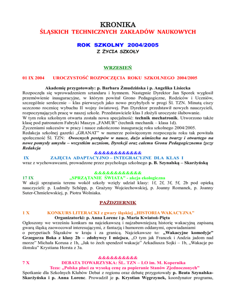 KRONIKA ŚLĄSKICH TECHNICZNYCH ZAKŁADÓW NAUKOWYCH ROK SZKOLNY 2004/2005 Z ŻYCIA SZKOŁY WRZESIEŃ 01 IX 2004 UROCZYSTOŚĆ ROZPOCZĘCIA ROKU SZKOLNEGO 2004/2005 Akademię przygotowały: p. Barbara Żmudzińska i p. Angelika Lisiecka Rozpoczęła się wprowadzeniem sztandaru i hymnem. Następnie Dyrektor Jan Sporek wygłosił przemówienie inauguracyjne, w którym powitał Grono Pedagogiczne, Rodziców i Uczniów, szczególnie serdecznie – klas pierwszych jako nowo przybyłych w progi Śl. TZN. Minutą ciszy uczczono rocznicę wybuchu II wojny światowej. Pan Dyrektor przedstawił nowych nauczycieli, rozpoczynających pracę w naszej szkole. Przedstawiciele klas I złożyli uroczyste ślubowanie. W tym roku szkolnym otwarta została nowa specjalność: technik mechatronik. Utworzono także klasę pod patronatem Fabryki Maszyn „FAMUR” (technik mechanik – klasa 1d). Życzeniami sukcesów w pracy i nauce zakończono inaugurację roku szkolnego 2004/2005. Redakcja szkolnej gazetki „GRANAT” w numerze poświęconym rozpoczęciu roku tak powitała społeczność Śl. TZN: Owocnych postępów w nauce, dużo uśmiechu na twarzy i otwartego na nowe pomysły umysłu – wszystkim uczniom, Dyrekcji oraz całemu Gronu Pedagogicznemu życzy Redakcja &&&&&&&&&&&& IX ZAJĘCIA ADAPTACYJNO – INTEGRACYJNE DLA KLAS I wraz z wychowawcami, prowadzone przez psychologa szkolnego p. B. Szynalską – Skarżyńską &&&&&&&&&&&& 17 IX „SPRZĄTANIE ŚWIATA” - akcja ekologiczna W akcji sprzątania terenu wokół szkoły wzięły udział klasy: 1f, 2f, 3f, 5f, 2b pod opieką nauczycieli: p. Ludmiły Schöpp, p. Grażyny Wojciechowskiej, p. Joanny Romanek, p. Joanny Suter-Chmielewskiej, p. Piotra Wolniaka. PAŹDZIERNIK 1X KONKURS LITERACKI z gwary śląskiej „HISTORIA WAKACYJNA” Organizatorki: p. Anna Lorenc i p. Maria Kwiatoń-Pięta Ogłoszony we wrześniu konkurs na najciekawszą i najzabawniejszą historię wakacyjną zapisaną gwarą śląską zaowocował interesującymi, z fantazją i humorem oddanymi, opowiadaniami o perypetiach Ślązaków w kraju i za granicą. Najciekawsze to: „Wakacyjne komedyje” Grzegorza Boka z klasy 2b – zdobywcy I miejsca, „O tym jak Francek i Andzia jadom nad morze” Michała Korusa z 1h, „Jak to żech spendzoł wakacje” Arkadiusza Sojki – 1b, „Wakacje po ślonsku” Krystiana Horsta z 3a. &&&&&&&&&& 7X DEBATA TOWARZYSKA: ŚL. TZN – LO im. M. Kopernika Teza: „Polska płaci za wysoką cenę za popieranie Stanów Zjednoczonych” Spotkanie dla Szkolnych Klubów Debat z regionu oraz debatę przygotowały p. Beata SzynalskaSkarżyńska i p. Anna Lorenc. Prowadził je p. Krystian Węgrzynek, koordynator programu, prezes Fundacji Młodzieżowej Przedsiębiorczości. Zwyciężyła drużyna Grelecki, Krzysztof Roczek, Krzysztof Sornek z klasy 5b. Śl. TZN - Tomasz &&&&&&&&& DZIEŃ NAUCZYCIELA - akademia z okazji Święta Edukacji Narodowej Uroczystość pod hasłem „Wszystko dla nauczycieli” przygotowana została przez p. Magdalenę Jawoszek i p. Marię Kwiatoń-Piętę Prowadziła ją Karolina Goik. Program artystyczny: 3 scenki z życia szkół podstawowej, gimnazjum i średniej W pierwszej wystąpili: K. Góra jako Nauczycielka i uczniowie – Piotr (R. Spychalski), Łobuz Krzysio (P. Waligóra), Lizus Tola (A. Kowalska), Beksa Ola (E. Gwiazda). Zaprezentowali lekcję na temat: „Moje ulubione zwierzę”. Do gimnazjum udał się Reporter lokalnej gazety, czyli Marcin Włosiński, przeprowadził wywiad z Uczennicami (B. Słupianek i A. Wach) i Uczniami (D. Bógdał i Ł. Ulbrych), którzy przedstawili swoje propozycje na język polski (uproszczenie ortografii i odmiany trudnych wyrazów oraz urozmaicenie zajęć poprzez rozwiązywanie krzyżówek). Następnie powędrowaliśmy do szkoły średniej na słynną lekcję j. polskiego wg „Ferdydurke” Witolda Gombrowicza z tezą „Słowacki słynnym poetą był” – uczestnicy to uczniowie z klas 2c i 3c w rolach: Narratora, Nauczyciela, Gałkiewicza, Syfona, Wałkiewicza i dwóch innych uczniów. „Co dzieje się w Śląskich?”, czyli: Występ cheerliderek Prezentacja Aktywnych – D. Filipek i M. Kruczek w hip-hopowej aranżacji wykonali sparafrazowaną „Odę do młodości” A. Mickiewicza: Zero klimatu/ Totalne próchno. (…) Małolaty! Dajcie czadu!/ Dajcie żaru!/ Totalnie! Optymalnie!.. Jako Ambitny inaczej wystąpił P. Cebula w recytacji nostalgicznego tekstu „Gdybym był Dyrektorem”. Piosenkę załamanego ucznia Śląskich – „Tak bardzo się starałem” zagrały i zaśpiewały Kasia Bimczok i Kinga Polak z towarzyszeniem chórku: Kto za panią w szkole ganiał Do dziennika kartki wkładał (z usprawiedliwieniami) Kto, no powiedz, kto?!? Ref.: Tak się staraliśmy Kto na ławce wyciął serce Że nockę zarwaliśmy I podpisał: Pani … !!! Dla Pani wkuwaliśmy Kto, no powiedz, kto?! I co??? Pokaz mody nauczycielskiej przygotowały uczennice klasy 2f. 18 X 2004 &&&&&&&&&&&& WIZYTA NORWEGÓW Kolejną wizytę uczniów i nauczycieli z Kongsvinger zorganizowały p. Barbara Żmudzińska i p. Angelika Lisiecka Plan pobytu obejmował: 18 X Dzień Nauczyciela; realizacja ścieżki europejskiej 19 X Projekt: „Lunch norweski dla nauczycieli” 20 X Wycieczka do Krakowa 21 X Zajęcia w szkole 22 X Wyjazd do Oświęcimia i podsumowanie pobytu 18 X – 22 X 2004 &&&&&&&&&& 21 X 2004 WYBORY PRZEWODNICZĄCEGO SAMORZĄDU SZKOLNEGO W bieżącym roku szkolnym opiekunami Samorządu Szkolnego zostali p. Katarzyna Ostrowska i p. Grzegorz Pinkowski Wybory przewodniczącego poprzedziła kampania połączona z prezentacją programów, uczniowie wzięli udział w głosowaniu. Zwyciężyła Ewa Krutysza z klasy 3c. &&&&&&&&&&& „NA OLIMPIJSKIM SZLAKU” – szkolne eliminacje turnieju „Od Aten do Aten” przeprowadzili nauczyciele wychowania fizycznego Ateny 2004 – 108 lat IGRZYSK Igrzyska wracają wreszcie do domu. Wszak ich korzenie sięgają nie tylko pierwszej nowożytnej olimpiady