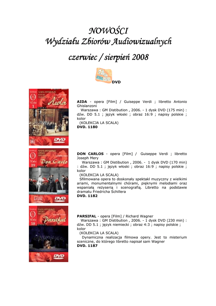NOWOŚCI Wydziału Zbiorów Audiowizualnych czerwiec / sierpień 2008 DVD AIDA - opera [Film] / Guiseppe Verdi ; libretto Antonio Ghislanzoni Warszawa : GM Distibution , 2006. - 1 dysk DVD (175 min) : dźw. DD 5.1 ; język włoski ; obraz 16:9 ; napisy polskie ; kolor (KOLEKCJA LA SCALA) DVD. 1180 DON CARLOS - opera [Film] / Guiseppe Verdi ; libretto Joseph Mery Warszawa : GM Distibution , 2006. - 1 dysk DVD (170 min) : dźw. DD 5.1 ; język włoski ; obraz 16:9 ; napisy polskie ; kolor (KOLEKCJA LA SCALA) Sfilmowana opera to doskonały spektakl muzyczny z wielkimi ariami, monumentalnymi chórami, pięknymi melodiami oraz wspaniałą reżyserią i scenografią. Libretto na podstawie dramatu Friedricha Schillera DVD. 1182 PARSIFAL - opera [Film] / Richard Wagner Warszawa : GM Distibution , 2006. - 1 dysk DVD (230 min) : dźw. DD 5.1 ; język niemiecki ; obraz 4:3 ; napisy polskie ; kolor (KOLEKCJA LA SCALA) Dynamiczna realizacja filmowa opery. Jest to misterium sceniczne, do którego libretto napisał sam Wagner DVD. 1187 POŁAWIACZE PEREŁ - opera [Film] / Georges Bizet ; libretto Michel de Carre, Eugene Cormon Warszawa : GM Distibution , 2006. - 1 dysk DVD (124 min) : dźw. DD 5.1 ; język francuski ; obraz 4:3 ; napisy polskie ; kolor (KOLEKCJA LA SCALA) Dynamiczna realizacja filmowa opery G. Bizeta. To doskonały spektakl muzyczny, w którym kamery pokazują scenę i grających aktorów w najlepszych ujęciach DVD. 1186 DON KICHOTE [Film] /reż. Peter Yates Dziekanów Polski : Media Service , 2007 ; prod. 2000. - 2 dyski DVD (130 min) : dźw. DD 5.1 ; polski lektor ; napisy polskie ; obraz 1:33 PAL ; kolor + interaktywne menu z dostępem do wybranych scen, galeria fotografii Ekranizacja powieści Miguela Cervantesa. Film jest klasyczną opowieścią o marzeniach, epickiej podróży i prawdziwej miłości DVD. 1090 /1-2 DZIESIĘĆ PRZYKAZAŃ [Film] / reż. Robert Dornhelm Warszawa : Monolith Film , 2007 ; prod. 2006. - 1 dysk DVD (170 min) : dźw. DD 5.1 ; polski lektor ; obraz 4:3 ; napisy polskie ; kolor + interaktywne menu z dostępem do wybranych scen Film fabularny na podstawie Pisma Świętego. Przedstawia dzieje Mojżesza, który staje się przywódcą Izraelitów i wyprowadza ich z Egiptu do ziemi obiecanej DVD. 1173 IZRAEL : ŚCIEŻKI WIARY - ZIEMIA ŚWIĘTA [Film] Warszawa : CASS Film Entertainment , 2007 ; prod. 2006. 1 dysk DVD (70 min) : dźw. DD 5.1 ; język polski ; obraz 4:3 ; kolor + interaktywne menu z dostępem do wybranych scen Film "Ścieżki wiary" jest kroniką życia Jezusa i prowadzi przez miejsca gdzie przebywał, nauczał i został ukrzyżowany. Film jest prezentacją ok. 40 niezwykłych miejsc i obiektów kultu: Bazylika Narodzenia Pańskiego, Betlejem, Nazaret, Jerycho, Jezioro Galilejskie, Golgota, Góra Oliwna i in. DVD. 1099 KOBIETY WINDSORU - Tajemnice rodziny królewskiej [Film] / reż. Steven Stern Warszawa : Demel , 2005 ; prod. 1992. - 1 dysk DVD (167 min) : dźw. DD 5.1 ; polski lektor ; obraz 4:3 ; kolor + interaktywne menu z dostępem do wybranych scen Dramatyczna opowieść o życiu dwóch młodych kobiet: Sary Ferguson i Diany Spencer, które weszły do Rodziny Królewskiej. Film przedstawia zaskakujące szczegóły, plotki, tajemnice i skandale DVD. 1098 WIRTUALNE UZALEŻNIENIE [Film] / reż. Paweł Nawrocki Kraków : Wydawnictwo WAM - Studio Inigo , 2008. - 1 dysk DVD (21 min) : dźw. DD ; obraz 4:3 ; kolor Film stanowi próbę odpowiedzi na pytanie jak umiejętnie korzystać z komputera, aby nie zostać ofiarą uzależnienia od Internetu i nie dopuścić do utraty kontroli nad czasem spędzanym w sieci. Film jest doskonałą pomocą dydaktyczną dla wychowawców w szkole oraz indywidualnych odbiorców, poszukujących odpowiedzi na nurtujące problemy współczesnego świata DVD. 1106 TELEWIZJA MIŁOŚĆ [Film] / reż. Jarosław Banaszek Kraków : Wydawnictwo WAM - Studio Inigo , 2008. - 1 dysk DVD (20 min) : dźw. DD ; obraz 4:3 ; kolor Film edukacyjny jest próbą pokazania bezduszności ludzi tworzących telewizyjne show, dla których nie liczy się człowiek, ale to jak zarobić na jego historii DVD. 1104 KTO NIGDY NIE ŻYŁ... [Film] / reż. Andrzej Seweryn Warszawa : Monolith Film , 2007 ; prod. 2006. - 1 dysk DVD (100 min) : dźw. DD. 5.1 ; obraz 16:9 ; napisy angielskie ; kolor + dodatki specjalne: interaktywne menu z dostępem do wybranych scen, informacje o filmie, zdjęcia z filmu Tłem filmu jest środowisko narkomanów. Kontrastem jest młody ksiądz będący jednak nosicielem wirusa HIV, który w swojej drodze kończącej życie odkrywa własne cele, pragnienia, ambicje i wiarę w drugiego człowieka DVD. 1123 KUPIEC WENECKI [Film] / scen i reż. Michael Radford Warszawa : SPI International , 2007 ; prod. 2004. - 1 dysk DVD (138 min) : dźw. DD 5.1 ; polski lektor ; napisy polskie obraz 16:9 ; kolor + interaktywne menu z dostępem do 32 scen Ekranizacja jednego z najwybitniejszych komediodramatów Williama Szekspira DVD. 1095 MEFISTO [Film] / reż. Istvan Szabo Warszawa : Solopan , 2008 ; prod. 1980. - 1 dysk DVD (137 min) : dźw. DD 2.0 ; napisy polskie ; obraz 4:3 ; kolor + dodatki: menu z wyborem 16 scen Adaptacja filmowa powieści Klausa Manna. Dogłębna analiza psychologiczna artysty wciągniętego w tryby faszystowskiej politycznej machiny DVD. 1125 ODKRYWAJĄC KOD DA VINCI [Film] / reż. Michael Bouson Warszawa : Kino Świat , 2006 ; prod. 2005. - 1 dysk DVD (60 min) : dźw. DD 2.0 ; polski lektor ; obraz 4:3 ; kolor + interaktywne menu z dostępem do wybranych scen Film dokumentalny nawiązujący do tajemnic i zagadek opisanych w książce Dana Browna "Kod Da Vinci". Naukowcy analizując poszczególne wątki poruszane przez Browna, odpowiadają na pytania co tu jest prawdą, a co literacką fikcją DVD. 1172 ONO [Film] / reż. Małgorzata Szumowska Warszawa : SPI International , 2007 ; prod. 2004. - 1 dysk DVD (94 min) : dźw. DD. 5.1 ; obraz 16:9 ; kolor + interaktywne menu zdostępem do 20 scen Film obyczajowy o dokon