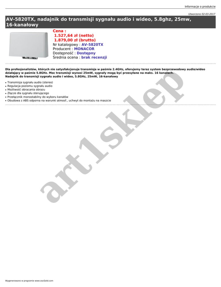 Informacje o produkcie Utworzono 02-03-2017 AV-5820TX, nadajnik do transmisji sygnału audio i wideo, 5.8ghz, 25mw, 16-kanałowy Cena : 1.527,64 zł (netto) 1.879,00 zł (brutto) Nr katalogowy : AV-5820TX Producent : MONACOR Dostępność : Dostępny Średnia ocena : brak recenzji Dla profesjonalistów, których nie satysfakcjonuje transmisja w paśmie 2.4GHz, oferujemy teraz system bezprzewodowy audio/wideo działający w paśmie 5.8GHz. Moc transmisji wynosi 25mW, sygnały mogą być przesyłane na maks. 16 kanałach. Nadajnik do transmisji sygnału audio i wideo, 5.8GHz, 25mW, 16-kanałowy ● ● ● ● ar t1 sk ● Transmisja sygnału audio (stereo) Regulacja poziomu sygnału audio Możliwość obracania obrazu Złącze dla sygnału sterującego Przełącznik monostabilny do wyboru kanałów Obudowa z ABS odporna na warunki atmosf., uchwyt do montażu na maszcie le p ● Wygenerowano w programie www.oscGold.com