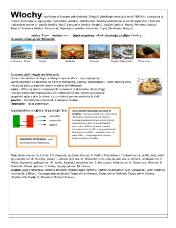 Włochy – paostwo w Europie południowej. Długośd włoskiego wybrzeża to aż 7600 km, a otaczają je morza: Śródziemne, Liguryjskie, Tyrreoskie, Jooskie i Adriatyckie. Włochy podzielone są na 20 regionów, z których najbardziej znane to: Apulia (stolica: Bari), Kampania (stolica: Neapol), Lacjum (stolica: Rzym), Piemont (stolica: Turyn) i Toskania (stolica: Florencja). Największe włoskie miasta to: Rzym, Mediolan i Neapol. stolica: Rzym waluta: euro Co warto zobaczyd we Włoszech: Koloseum – Rzym Neapol język urzędowy: włoski dominująca religia: katolicyzm Mediolan Pompeje Kaplica Sykstyńska Wezuwiusz Co warto zjeśd i wypid we Włoszech: pizza – niezależnie od tego, w którym rejonie Włoch się znajdujemy, warto pojechad do Neapolu na pizzę (z mozarellą, bazylią i pomidorami). Takiej dobrej pizzy nie da się zjeśd w żadnym innym mieście we Włoszech pasta – Włosi są znani z najlepszych na świecie makaronów; do każdego rodzaju makaronu dopasowany jest odpowiedni sos. Warto spróbowad: spaghetti aglio e olio (z oliwą i z czosnkiem), penne arabiatta (z chili) gnocchi – ziemniaczane kluseczki z różnymi sosami limoncello – likier cytrynowy NARODOWE BARWY WŁOSKIE TO: pomidory mozzarella bazylia KARNAWAŁ W WENECJI – pięd dni przed Środą Popielcową UROCZYSTOŚĆ PRZEMIENIENIA KRWI W NEAPOLU – pierwsza sobota maja, 10 września i 16 grudnia. Uważa się, że jeśli krew św. Januarego (wybawiciela i protektora miasta) nie zmieni się w płyn, na Neapol spadnie nieszczęście. W XX w. krew nie zmieniła konsystencji m.in. w 1941 r. i nastąpił wybuch Wezuwiusza, w 1980 r. - trzęsienie ziemi, i w maju 1988 r., - następnego dnia drużyna Napoli przegrała z AC Milan. film: Ojciec chrzestny 1-3 reż. F.F. Coppola, La Dolce Vita reż. F. Fellini, Pod słoocem Toskanii reż. A. Wells, Jedz, módl się i kochaj reż. R. Murphy, Genua – włoskie lato reż. M. Winterbottom, Listy do Julii reż. G. Winick, La Strada reż. F. Fellini, Rzymskie wakacje reż. W. Wyler, Rzymska opowieść reż. B. Bertolucci, Malena reż. G. Tornatore, Nine reż. R. Marshall, Osiem i pół reż. F. Fellini, Sycylijczyk reż. M. Cimino książka: Ojciec chrzestny, Rodzina Borgiów (Mario Puzo), Włochy. Podróż na południe (A.M. Goławska), Jedz, módl się i kochaj (E. Gillbert), Tamtego lata na Sycylii, Tysiąc dni w Wenecji, Tysiąc dni w Toskanii, Tysiąc dni w Orvieto (Marlena De Blasi), Ja, Klaudiusz (Robert Graves) MAŁY SŁOWNICZEK WŁOSKO-POLSKI BUONGIORNO (dzieo dobry) ARRIVEDERCI (do widzenia) CIAO (cześd) BUONA SERA (dobry wieczór) BUONANOTTE (dobranoc) COME TI CHIAMI? (Jak się nazywasz?) MI CHIAMO… (Nazywam się…) CHE ORE SONO? (Która godzina?) NON SO (nie wiem) QUANTO COSTA? (Ile to kosztuje?) COSTA CINQUE (To kosztuje pięd) SCUSI (przepraszam) PERMESSO! (Proszę mnie przepuścid!) GRAZIE (dziękuję) DESTRA (w prawo) PREGO (proszę) GRAZIE MILLE (dziękuję bardzo) SINISTRA (w lewo) JAK SIĘ MASZ? KTO TO JEST? (+) świetnie dobrze jako tako kiepsko źle KOBIETA (Femmina) STUDENTKA (Studentessa) (–) ++ benissimo + bene +/– cosi cosi – male – – malissimo MĘŻCZYZNA (Maschio) STUDENT (Studente) CO TO JEST? LAMPA (LAMPADA) TOREBKA (BORSA) sjikp.us.edu.pl OKNO (FINESTRA) DŁUGOPIS (PENNA) ZEGAREK (OROLOGIO) KOMÓRKA (CELLULARE) KSIĄŻKA (LIBRO) STÓŁ (TAVOLO) KRZESŁO (SEDIA)