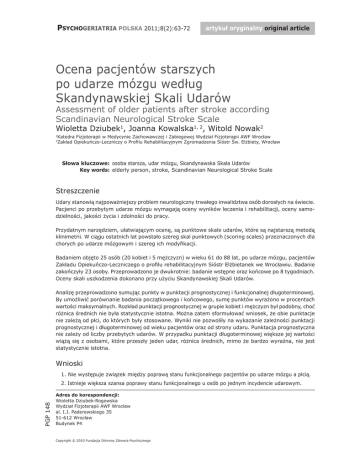 PSYCHOGERIATRIA POLSKA 2011;8(2):63-72 artykuł oryginalny original article Ocena pacjentów starszych po udarze mózgu według Skandynawskiej Skali Udarów Assessment of older patients after stroke according Scandinavian Neurological Stroke Scale Wioletta Dziubek1, Joanna Kowalska1, 2, Witold Nowak2 Katedra Fizjoterapii w Medycynie Zachowawczej i Zabiegowej Wydział Fizjoterapii AWF Wrocław Zakład Opiekuńczo-Leczniczy o Profilu Rehabilitacyjnym Zgromadzenia Sióstr Św. Elżbiety, Wrocław 1 2 Słowa kluczowe: osoba starsza, udar mózgu, Skandynawska Skala Udarów Key words: elderly person, stroke, Scandinavian Neurological Stroke Scale Streszczenie Udary stanowią najpoważniejszy problem neurologiczny trwałego inwalidztwa osób dorosłych na świecie. Pacjenci po przebytym udarze mózgu wymagają oceny wyników leczenia i rehabilitacji, oceny samodzielności, jakości życia i zdolności do pracy. Przydatnym narzędziem, ułatwiającym ocenę, są punktowe skale udarów, które są najstarszą metodą klinimetrii. W ciągu ostatnich lat powstało szereg skal punktowych (scoring scales) przeznaczonych dla chorych po udarze mózgowym i szereg ich modyfikacji. Badaniem objęto 25 osób (20 kobiet i 5 mężczyzn) w wieku 61 do 88 lat, po udarze mózgu, pacjentów Zakładu Opiekuńczo-Leczniczego o profilu rehabilitacyjnym Sióstr Elżbietanek we Wrocławiu. Badanie zakończyły 23 osoby. Przeprowadzono je dwukrotnie: badanie wstępne oraz końcowe po 8 tygodniach. Oceny skali uszkodzenia dokonano przy użyciu Skandynawskiej Skali Udarów. Analizę przeprowadzono sumując punkty w punktacji prognostycznej i funkcjonalnej długoterminowej. By umożliwić porównanie badania początkowego i końcowego, sumę punktów wyrażono w procentach wartości maksymalnych. Rozkład punktacji prognostycznej w grupie kobiet i mężczyzn był podobny, choć różnica średnich nie była statystycznie istotna. Można zatem sformułować wniosek, że obie punktacje nie zależą od płci, do których były stosowane. Wyniki nie pozwoliły na wykazanie zależności punktacji prognostycznej i długoterminowej od wieku pacjentów oraz od strony udaru. Punktacja prognostyczna nie zależy od liczby przebytych udarów. W przypadku punktacji długoterminowej większe jej wartości wiążą się z osobami, które przeszły jeden udar, różnica średnich, mimo że bardzo wyraźna, nie jest statystycznie istotna. Wnioski 1. Nie występuje związek między poprawą stanu funkcjonalnego pacjentów po udarze mózgu a płcią. PGP 148 2. Istnieje większa szansa poprawy stanu funkcjonalnego u osób po jednym incydencie udarowym. Adres do korespondencji: Wioletta Dziubek-Rogowska Wydział Fizjoterapii AWF Wrocław al. I.J. Paderewskiego 35 51-612 Wrocław Budynek P4 Copyright © 2010 Fundacja Ochrony Zdrowia Psychicznego 64 Wioletta Dziubek i wsp.: Skandynawska Skala Udarów Abstract Strokes are the most serious neurological problems, that couse permanent disability in adults worldwide. Stroke patients need an evaluation of treatment and rehabilitation, self-assessment, quality of life and ability to work. A useful tool to facilitate assessment are scoring scales, which are the oldest area of clinimetric. In the recent years was a series of scoring scales designed for patients after stroke. The study included 25 people (5 women and 20 men) aged 61 to 88 years after stroke, patients of Department of Caring with the profile of the rehabilitation of the Sisters of St. Elizabeth in Wroclaw. 23 people completed the survey. They performed twice: a preliminary study and the final after 8 weeks. Scale damage assessment was made using the Scandinavian Stroke Scale. The analysis was performed aggregating scoring points in the prognostic and functional long-term. To enable a comparison study of initial and final total score is expressed as a percentage of the maximum values. Distribution of prognostic scores in a group of men and women was similar, although average difference was not statistically significant. It can therefore be concluded that the two scores do not depend on gender, which have been applied. The results did not allow the demonstration of prognostic scores based on age and long-term patients and from side of stroke. Prognostic Scoring does not depend on the number of strokes. In the case of long-term scoring higher its value associated with people who have had a one stroke, although the average difference is not statistically significant. Conclusions 1. There is no relationship between the functional improvement of stroke patients and gender. 2. There is a greater opportunity to improve the functional status of patients after one stroke incident. Wstęp Udary stanowią najpoważniejszy problem neurologiczny trwałego inwalidztwa osób dorosłych na świecie. Pacjenci po przebytym udarze mózgu, wymagają oceny wyników leczenia i rehabilitacji, oceny samodzielności, jakości życia i zdolności do pracy. Przydatnym narzędziem, ułatwiającym ocenę, są punktowe skale udarów, które są najstarszą metodą klinimetrii. Klinimetria jest dziedziną wiedzy medycznej, której celem jest opracowywanie i stosowanie metod (skal) umożliwiających pomiar zjawisk klinicznych występujących u chorego [1]. Zapotrzebowanie na konieczność obiektywizacji zjawisk klinicznych wynika z określonych przez WHO definicji trzech podstawowych następstw choroby: uszkodzenia (impairment), niepełnosprawności (disability) i upośledzenia – zależności (handicap) [1-7]. Pociąga to za sobą potrzebę oceny stanu klinicznego i funkcjonalnego chorych. W ciągu ostatnich lat powstało szereg skal punktowych (scoring scales) przeznaczonych dla chorych po udarze mózgowym i cały szereg ich modyfikacji [5, 7, 8]. Skale stosowane w celu oceny stanu chorych z chorobami neurologicznymi dzieli się na skale uszkodzeń, skale funkcjonalne i skale oceniające jakość życia [1,7]. Wśród skal funkcjonalnych stosuje się wskaźnik Barth