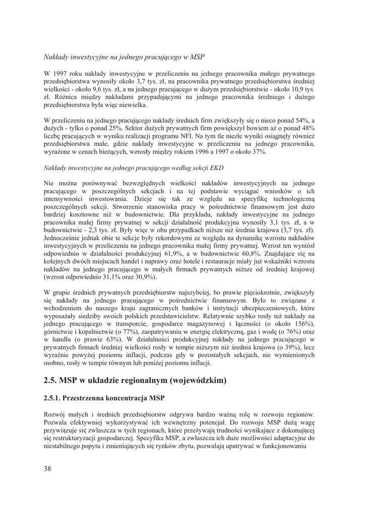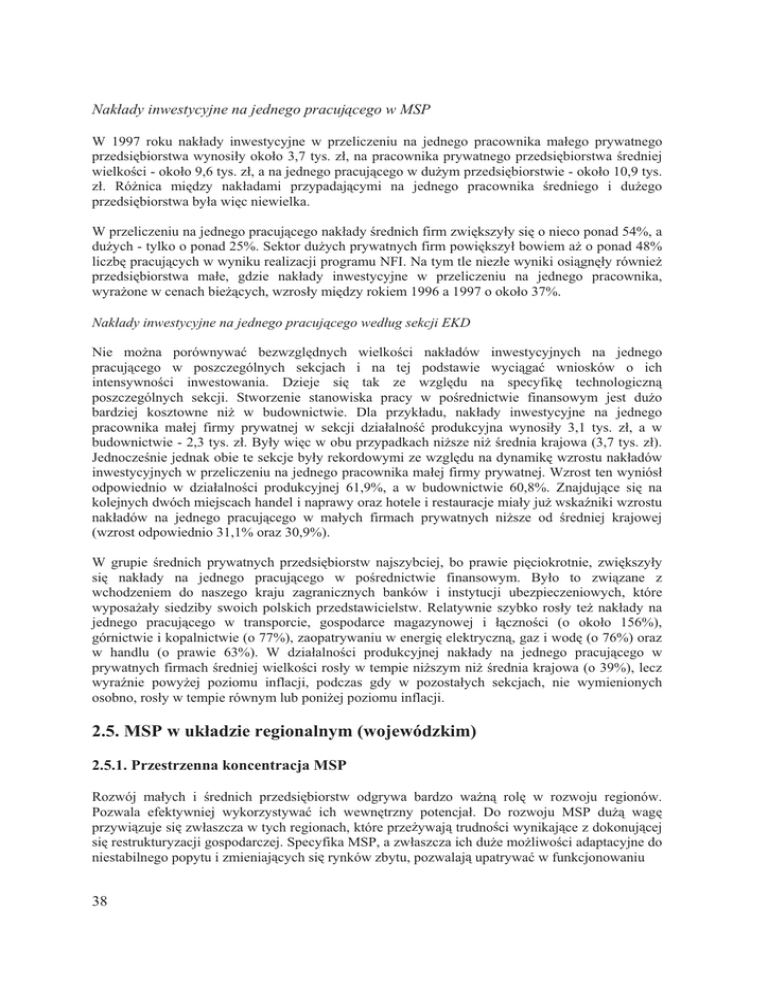 1DNáDG\LQZHVW\F\MQHQDMHGQHJRSUDFXMFHJRZ063 : URNX QDNáDG\ LQZHVW\F\MQH Z SU]HOLF]HQLX QD MHGQHJR SUDFRZQLND PDáHJR SU\ZDWQHJR SU]HGVL ELRUVWZDZ\QRVLá\RNRáRW\V]áQDSUDFRZQLNDSU\ZDWQHJRSU]HGVL ELRUVWZDUHGQLHM ZLHONRFLRNRáRW\V]áDQDMHGQHJRSUDFXMFHJRZGX*\PSU]HGVL ELRUVWZLHRNRáRW\V ]á 5y*QLFD PL G]\ QDNáDGDPL SU]\SDGDMF\PL QD MHGQHJR SUDFRZQLND UHGQLHJR L GX*HJR SU]HGVL ELRUVWZDE\áDZL FQLHZLHOND :SU]HOLF]HQLXQDMHGQHJRSUDFXMFHJRQDNáDG\UHGQLFKILUP]ZL NV]\á\VL RQLHFRSRQDGD GX*\FKW\ONRRSRQDG6HNWRUGX*\FKSU\ZDWQ\FKILUPSRZL NV]\áERZLHPD*RSRQDG OLF]E SUDFXMF\FKZZ\QLNXUHDOL]DFMLSURJUDPX1),1DW\PWOHQLH]áHZ\QLNLRVLJQ á\UyZQLH* SU]HGVL ELRUVWZD PDáH JG]LH QDNáDG\ LQZHVW\F\MQH Z SU]HOLF]HQLX QD MHGQHJR SUDFRZQLND Z\UD*RQHZFHQDFKELH*F\FKZ]URVá\PL G]\URNLHPDRRNRáR 1DNáDG\LQZHVW\F\MQHQDMHGQHJRSUDFXMFHJRZHGáXJVHNFML(.' 1LH PR*QD SRUyZQ\ZDü EH]Z]JO GQ\FK ZLHONRFL QDNáDGyZ LQZHVW\F\MQ\FK QD MHGQHJR SUDFXMFHJR Z SRV]F]HJyOQ\FK VHNFMDFK L QD WHM SRGVWDZLH Z\FLJDü ZQLRVNyZ R LFK LQWHQV\ZQRFL LQZHVWRZDQLD ']LHMH VL WDN ]H Z]JO GX QD VSHF\ILN WHFKQRORJLF]Q SRV]F]HJyOQ\FK VHNFML 6WZRU]HQLH VWDQRZLVND SUDF\ Z SRUHGQLFWZLH ILQDQVRZ\P MHVW GX*R EDUG]LHM NRV]WRZQH QL* Z EXGRZQLFWZLH 'OD SU]\NáDGX QDNáDG\ LQZHVW\F\MQH QD MHGQHJR SUDFRZQLND PDáHM ILUP\ SU\ZDWQHM Z VHNFML G]LDáDOQRü SURGXNF\MQD Z\QRVLá\ W\V ]á D Z EXGRZQLFWZLHW\V]á%\á\ZL FZREXSU]\SDGNDFKQL*V]HQL*UHGQLDNUDMRZDW\V]á -HGQRF]HQLHMHGQDNRELHWHVHNFMHE\á\UHNRUGRZ\PL]HZ]JO GXQDG\QDPLN Z]URVWXQDNáDGyZ LQZHVW\F\MQ\FKZSU]HOLF]HQLXQDMHGQHJRSUDFRZQLNDPDáHMILUP\SU\ZDWQHM:]URVWWHQZ\QLyVá RGSRZLHGQLR Z G]LDáDOQRFL SURGXNF\MQHM D Z EXGRZQLFWZLH =QDMGXMFH VL QD NROHMQ\FKGZyFKPLHMVFDFKKDQGHOLQDSUDZ\RUD]KRWHOHLUHVWDXUDFMHPLDá\MX*ZVND(QLNLZ]URVWX QDNáDGyZ QD MHGQHJR SUDFXMFHJR Z PDá\FK ILUPDFK SU\ZDWQ\FK QL*V]H RG UHGQLHM NUDMRZHM Z]URVWRGSRZLHGQLRRUD] : JUXSLH UHGQLFK SU\ZDWQ\FK SU]HGVL ELRUVWZ QDMV]\EFLHM ER SUDZLH SL FLRNURWQLH ]ZL NV]\á\ VL QDNáDG\ QD MHGQHJR SUDFXMFHJR Z SRUHGQLFWZLH ILQDQVRZ\P %\áR WR ]ZL]DQH ] ZFKRG]HQLHP GR QDV]HJR NUDMX ]DJUDQLF]Q\FK EDQNyZ L LQVW\WXFML XEH]SLHF]HQLRZ\FK NWyUH Z\SRVD*Dá\ VLHG]LE\ VZRLFK SROVNLFK SU]HGVWDZLFLHOVWZ 5HODW\ZQLH V]\ENR URVá\ WH* QDNáDG\ QD MHGQHJR SUDFXMFHJR Z WUDQVSRUFLH JRVSRGDUFH PDJD]\QRZHM L áF]QRFL R RNRáR JyUQLFWZLHLNRSDOQLFWZLHR]DRSDWU\ZDQLXZHQHUJL HOHNWU\F]QJD]LZRG RRUD] Z KDQGOX R SUDZLH : G]LDáDOQRFL SURGXNF\MQHM QDNáDG\ QD MHGQHJR SUDFXMFHJR Z SU\ZDWQ\FKILUPDFKUHGQLHMZLHONRFLURVá\ZWHPSLHQL*V]\PQL*UHGQLDNUDMRZDROHF] Z\UD(QLH SRZ\*HM SR]LRPX LQIODFML SRGF]DV JG\ Z SR]RVWDá\FK VHNFMDFK QLH Z\PLHQLRQ\FK RVREQRURVá\ZWHPSLHUyZQ\POXESRQL*HMSR]LRPXLQIODFML 063ZXNáDG]LHUHJLRQDOQ\PZRMHZyG]NLP 3U]HVWU]HQQDNRQFHQWUDFMD063 5R]ZyM PDá\FK L UHGQLFK SU]HGVL ELRUVWZ RGJU\ZD EDUG]R ZD*Q URO Z UR]ZRMX UHJLRQyZ 3R]ZDOD HIHNW\ZQLHM Z\NRU]\VW\ZDü LFK ZHZQ WU]Q\ SRWHQFMDá 'R UR]ZRMX 063 GX* ZDJ SU]\ZL]XMHVL ]ZáDV]F]DZW\FKUHJLRQDFKNWyUHSU]H*\ZDMWUXGQRFLZ\QLNDMFH]GRNRQXMFHM VL UHVWUXNWXU\]DFMLJRVSRGDUF]HM6SHF\ILND063D]ZáDV]F]DLFKGX*HPR*OLZRFLDGDSWDF\MQHGR QLHVWDELOQHJRSRS\WXL]PLHQLDMF\FKVL U\QNyZ]E\WXSR]ZDODMXSDWU\ZDüZIXQNFMRQRZDQLX WHM NDWHJRULL SU]HGVL ELRUVWZ UHPHGLXP ]DUyZQR QD VáDEQF ORNDOQ NRQLXQNWXU MDN WH* QD Z\VRNLSR]LRPORNDOQHJREH]URERFLD -HGQ]FHFKZ\Uy*QLDMF\FKZV]HONG]LDáDOQRüJRVSRGDUF]MHVWWHQGHQFMDGRMHMSU]HVWU]HQQHM NRQFHQWUDFML 'RW\F]\ WR ZV]\VWNLFK SU]HGVL ELRUVWZ QLH]DOH*QLH RG LFK ZLHONRFL /RNDOL]DFM SU]HGVL ELRUVWZ ]DUyZQR PDá\FK UHGQLFK MDN L GX*\FK FKDUDNWHU\]XMH SU]HVWU]HQQH ZVSyáZ\VW SRZDQLH FR R]QDF]D L* Z UHJLRQDFK Z NWyU\FK ]ORNDOL]RZDQD MHVW GX*D OLF]ED SU]HGVL ELRUVWZ GX*\FK ]QDMGXMH VL UyZQLH GX*D OLF]ED SU]HGVL ELRUVWZ UHGQLFK PDá\FK L YLFH YHUVD PDáHM OLF]ELH SU]HGVL ELRUVWZ GX*\FK WRZDU]\V]\ UHODW\ZQLH QLHZLHOND OLF]ED SU]HGVL ELRUVWZPDá\FKLUHGQLFK 3U]HVWU]HQQHVNXSLVND063SRZVWDMZREU ELHGX*\FKDJORPHUDFMLPLHMVNLFKRUD]ZRNU JDFKR GREU]H UR]ZLQL W\P L ]Uy*QLFRZDQ\P SU]HP\OH 3U]HP\Vá SU]HWZyUF]\ L OXGQRü DJORPHUDFML PLHMVNLFK RUD] RNU JyZ SU]HP\VáRZ\FK GHF\GXM R SRWHQFMDOQ\P SRS\FLH QD SURGXNFM 063 D UHODFMD PL G]\ OLF]E 063 L SU]HFL WQ OLF]E PLHV]NDFyZ RNUHOD SU]HVWU]HQQ GRVW SQRü VSRáHF]HVWZ ORNDOQ\FK 3ROVNL GR SURGXNFML RUD] XVáXJ ZLDGF]RQ\FK SU]H] 063 'RVW SQRü WD MHVW ]QDF]QLH ZL NV]D Z ]DFKRGQLHM F] FL NUDMX Z SRUyZQDQLX ] F] FL ZVFKRGQL RUD] QD REV]DUDFK]XUEDQL]RZDQ\FKZSRUyZQDQLX]REV]DUDPLZLHMVNLPL:UZWU]HFKQDMEDUG]LHM ]XUEDQL]RZDQ\FK ZRMHZyG]WZDFK 3ROVNL WM áyG]NLP ZDUV]DZVNLP L NDWRZLFNLP áF]QLH Z PLDVWDFKZ\*HMZ\PLHQLRQ\FKZRMHZyG]WZ]DPLHV]NLZDáRRJyáXOXGQRFLPLHMVNLHM3ROVNL QDRJyOQOLF]E RNPOQDNW\ZQ\FK063]ORNDOL]RZDQ\FKE\áRW\V063WMRNRáR RJyáXSU]HGVL ELRUVWZWHMZLHONRFL 0DSND 3U]HVWU]HQQD NRQFHQWUDFMD PDá\FK L UHGQLFK SU]HGVL ELRUVWZ Z 3ROVFH Z URNXOLF]ED063ZSU]HOLF]HQLXQDPLHV]ND FyZ : DQDOL]LH SU]HVWU]HQQHJR UR]PLHV]F]HQLD 063 Z 3ROVFH QD V]F]HJyOQ XZDJ ]DVáXJXM SU]HGVL ELRUVWZD PDáH R OLF]ELH SUDFXMF\FK GR RVyE -HGQRVWNL WH QLH GRü *H WZRU] QDMOLF]QLHMV]NODV SU]HGVL ELRUVWZWR]XZDJLQDGX*VZRERG ORNDOL]DF\MQV SU]HGVL ELRUVWZDPL SRZV]HFKQLH UHSUH]HQWRZDQ\PL QD WHU\WRULXP FDáHJR NUDMX Z\VRNL VWRSLH SU]HVWU]HQQHJR UR]SURV]HQLD 1LHFR LQQH SUHIHUHQFMH ORNDOL]DF\MQH VSUDZLDM *H ZL NV]Rü SU]HGVL ELRUVWZ PDá\FK OHF] ]DWUXGQLDMF\FK RG GR SUDFXMF\FK VNXSLD VL Z QLHZLHONLHM OLF]ELH ZRMHZyG]WZ : U W\V SU]HGVL ELRUVWZ WHM ZLHONRFL WM SUDZLH RJyOQHM OLF]E\ SU]HGVL ELRUVWZ PDá\FK R OLF]ELH SUDFXMF\FK RG GR RVyE NRQFHQWURZDáR VL QD REV]DU]H ZRMHZyG]WZ ZDUV]DZVNLHJR NDWRZLFNLHJR JGDVNLHJR SR]QDVNLHJR L NUDNRZVNLHJR:\GDMHVL *HSU]\F]\QVLOQHMWHQGHQFMLGRVNXSLDQLDVL SU]HGVL ELRUVWZROLF]ELH SUDFXMF\FK RG GR RVyE MHVW SURILO G]LDáDOQRFL SURZDG]RQHM SU]H] ILUP\ WHM ZLHONRFL : SU]HFLZLHVWZLH GR G]LDáDOQRFL SU]HGVL ELRUVWZ QDMPQLHMV]\FK Z\PDJD RQD ]QDF]QLH V]HUV]HJR ZVSyáG]LDáDQLD]SU]HGVL ELRUVWZDPLUHGQLPLLGX*\PL 'ODUR]ZRMXUHJLRQDOQHJRZD*QDMHVWQLHW\ONROLF]EDSU]HGVL ELRUVWZ]ORNDOL]RZDQ\FKQDGDQ\P WHUHQLH DOH WDN*H VWDQGDUG SURZDG]RQHM G]LDáDOQRFL 'X*D F] ü 063 ]ORNDOL]RZDQ\FK Z ZRMHZyG]WZDFK Z\VRFH ]XUEDQL]RZDQ\FK L R Z\VRNLP SR]LRPLH XSU]HP\Vá
