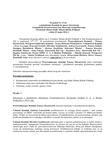 Protokół Nr 17/16 z posiedzenia Komisji do spraw Inwestycji, Gospodarki Przestrzennej oraz Rozwoju Gospodarczego i Promocji Miasta Rady Miasta Bielsk Podlaski z dnia 23 maja 2016 r. Posiedzenie Komisji odbyło się w Urzędzie Miasta Bielsk Podlaski w Sali Konferencyjnej nr 302 w godzinach 1100-1257. W posiedzeniu uczestniczyli: Przewodniczący Komisji – Tomasz Hryniewicki, Wiceprzewodnicząca Komisji – Iwona Bielecka-Włodzimirow, Członkowie Komisji - Jerzy Czeczuga, Krzysztof Grodzki, Mirosław Gołębiowski, Andrzej Leszczyński, Tomasz Sulima, Zastępca Burmistrza Miasta – Bożena Zwolińska, Sekretarz Miasta – Tamara Korycka, Skarbnik Miasta - Anna Szkoda, Kierownik Ref. Gp – Kazimierz Prus, Kierownik Ref. Gk – Bogdan Sokołowski, Prezes MPEC S. A. w Bielsku Podlaskim – Mikołaj Samocik, Wiceprezes PK Sp. z o.o. – Daniel Trofimiuk oraz mieszkańcy miasta: Wawrzeniuk Barbara, Moroz Tomasz, Brunkalla Artur (lista obecności stanowi załącznik nr 1 do protokołu). Obradom przewodniczył Przewodniczący Komisji Tomasz Hryniewicki, który otwierając posiedzenie Komisji powitał wszystkich zebranych i przedstawił porządek posiedzenia podany w zawiadomieniu. Odnośnie zaproponowanego porządku obrad uwag nie wniesiono. Porządek posiedzenia: 1. Rozpatrzenie materiałów przedkładanych pod obrady sesji Rady Miasta Bielsk Podlaski. 2. Informacja dotycząca obchodów Dni Bielska Podlaskiego. 3. Dyskusja, wolne wnioski, sprawy różne. Do pkt. 1 Informacja z działalności Miejskiego Przedsiębiorstwa Energetyki Cieplnej S. A. w Bielsku Podlaskim w 2015 roku. Przewodniczący Komisji Tomasz Hryniewicki otworzył dyskusję w przedmiotowej sprawie. Członek Komisji Andrzej Leszczyński poinformował, że czytając bilans zysków i strat można powiedzieć, że MPEC wskaźniki ma bardzo dobre. Uważa, że wynik w postaci 711 600zł jest bardzo dobry. Widać, że inwestycje są dobrze prowadzone, Przedsiębiorstwo się unowocześnia, niestety, jak każde przedsiębiorstwo emitujące szkodliwe czynniki do atmosfery, płacić za to pieniądze. Członek Komisji Mirosław Gołębiowski zabierając głos w sprawie poinformował, że jeżeli chodzi o funkcjonowanie, zarządzanie Przedsiębiorstwa, to również nie ma nic on do dodania. Rzeczywiście obserwując przez wiele lat, pod kierownictwem Mikołaja Samocika, firma jest dobrze zarządzana, wciąż się modernizuje, realizuje szereg inwestycji. Poinformował jednak, iż wiadomo jest, że są zaostrzone normy emisji, jest obowiązek uczestniczenia w systemie handlu uprawnieniami do emisji 2 dwutlenku węgla, zatem będzie wzrost kosztu produkcji energii, co w jednym z akapitów przedłożonej informacji wyszczególnia Przedsiębiorstwo, to są przyczyny niezależne. Interesuje go jaka jest perspektywa oraz jakie są źródła finansowania tego przedsięwzięcia? Jak zauważył zamierzenia też są ambitne, rozważane jest również częściowe zastąpienie energii z węgla energią biomasy. Zwrócił się z zapytaniem na czym to ma polegać oraz czy to się potem nie przełoży na koszty ciepła dostarczanego konsumentom? Prezes MPEC Mikołaj Samocik wyjaśnił, iż z wyniku oraz z sytuacji bieżącej można być zadowolonym. W sprawozdaniu zostało również ujęte zamierzenia o kierunkach rozwoju. Momencie pisania informacji użył sformułowania polityka unijna dotycząca zastępowania węgla odnawialnymi źródłami. Wynika to z polityki unijnej, wynikało tak z polityki rządowej poprzedniej ekipy. Dziś polityka się zmienia, a podstawowym źródłem energii znów ma być węgiel. Wyjaśnił, że należy mieć świadomość, iż przechodzenie na nowe technologie, które mają być bardziej przyjazne środowisku, nie oznacza, ze będą tańsze. Z prowadzonych statystyk wynika, że ciepło produkowane z węgla jest najtańsze, odnawialne są około 15% wyższe. W programie zostało zapisane, że zgodnie z polityką będzie rozważane przechodzenie na źródła energii odnawialnej, pojawia się jednak pytanie z czego to będzie finansowane? W ramach RPO Województwa Podlaskiego na dofinansowanie odnawialnych źródeł energii dla firm typu PEC nie ma ani złotówki. Pieniądze takie są przeznaczone na małe, średnie, mikro przedsiębiorstwa. Przedsiębiorstwo według definicji unijnej jest przedsiębiorstwem dużym, ponieważ udział samorządu w kapitale przekracza 25%. Jest to przedsiębiorstwo duże, które jest wyłączone z jakiejkolwiek formy dofinansowania. Z dofinansowania mogą korzystać duże przedsiębiorstwa, z wyjątkiem przedsiębiorstw, które zajmują się energią w jakiejkolwiek postaci. Aby korzystać ze źródeł odnawialnych, nie można stworzyć kotła większego jak 3 MW, ponieważ wtedy przez cały okres letni nie będzie on wykorzystywany, ponieważ nie ma odbioru ciepłej wody. Produkując tylko część energii elektrycznej, resztę musiałby puszczać parę w powietrze. Jest to problem natury technicznej. Jednym z zadań EMPEC-u jest rozbudowa sieci w kierunku ul. Żwirki i Wigury, Dąbrowskiego oraz ul. Krynicznej. Warunki zabudowy powinny już niedługo się uprawomocnić, niestety projektowanie zostało wstrzymane ze względu na prawo własności. W tym roku planowane jest również odpylanie drugiego kotła, co wyniesie ok. 800 000 zł. Członek Komisji Tomasz Sulima zwrócił się z zapytaniem czy mieszkańcy mieszkańcy nie powinni się bać dekarbonizacji ? Poprosił o konkretne wyjaśniania. Poinformował, iż słyszał, że rząd broni się przed unijnymi dyrektywami . Prezes MPEC Mikołaj Samocik powiedział, że na dzień dzisiejszy nikt nie mówi, by rezygnować z węgla. O odnawialnych źródłach energii nadal trwają dyskusje w Sejmie. Biomasa ma pochodzić nie dalej niż z 300 km od miejsca jej spalania. Do tej pory takiego ograniczenia nie było. Członek Komisji Mirosław Gołębiowski zwrócił się z prośbą, by przedstawiciel MPEC-u był na zebraniu cząstkowym walnego. O