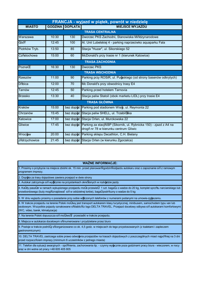 FRANCJA - wyjazd w piątek, powrót w niedzielę MIASTO GODZINA DOPŁATA MIEJSCE WYJAZDU TRASA CENTRALNA Warszawa 10:30 130 Dworzec PKS Zachodni, Stanowiska Międzynarodowe Łódź 12:45 100 Al. Unii Lubelskiej 4 - parking naprzeciwko aquaparku Fala Piotrków Tryb. 13:50 85 Stacja "Huzar", ul. Sikorskiego 52 Częstochowa 15:00 60 McDonald's przy trasie nr 1 (kierunek Katowice) TRASA ZACHODNIA Poznań 16:30 130 Dworzec PKS TRASA WSCHODNIA Rzeszów 11:00 90 Parking przy ROSiR, ul. Pułaskiego (od strony basenów odkrytych) Dębica 12:00 70 Mc Donald's przy obwodnicy trasy E4 Tarnów 12:45 50 Parking przed hotelem Tarnovia Brzesko 13:30 40 Stacja paliw Statoil (obok marketu LIDL) przy trasie E4 TRASA GŁÓWNA Kraków 15:00 bez dopłat Parking pod stadionem Wisły, ul. Reymonta 22 Chrzanów 15:45 bez dopłat Stacja paliw SHELL, ul. Trzebińska Katowice 17:00 bez dopłat Stacja Orlen, ul. Murckowska 22 Gliwice 17:45 bez dopłat Parking za stacją BP (Sikornik, ul. Rybnicka 150) - zjazd z A4 na drogę nr 78 w kierunku centrum Gliwic Wrocław 20:00 bez dopłat Parking sklepu Decathlon, C.H. Bielany Jędrzychowice 21:45 bez dopłat Stacja Orlen (w kierunku Zgorzelca) WAŻNE INFORMACJE: 1. Prosimy o przybycie na miejsce zbiórki ok. 15 min. przed planowaną godziną odjazdu autokaru oraz o zapoznanie się z ramowym programem imprezy. 2. Dopłata za trasy dojazdowe zawiera przejazd w dwie strony 3. Autokar zatrzymuje się wyłącznie na przystankach określonych w rozkładzie jazdy 4. Każdy pasażer w ramach wykupionego przejazdu może przewieżć 1 szt. bagażu o wadze do 20 kg, komplet sprzętu narciarskiego lub snowbordowego (buty mogą znajdować się w oddzielnej torbie), bagaż podręczny o wadze do 5 kg 5. W dniu wyjazdu prosimy o posiadanie przy sobie włączonych telefonów z numerami podanymi na umowie-zgłoszeniu. 6. W trakcie przejazdu na terenie Polski możliwy jest transport autokarem klasy turystycznej, minibusem, samochodem typu van lub osobowym. Wszystkie pojazdy oznakowane są tablicą z logo DELTA TRAVEL. Przejazd docelowy odbywa się autokarami komfortowymi (WC, video, barek, klimatyzacja) 7. Na terenie Polski dopuszcza się możliwość przesiadki w trakcie przejazdu. 8. Miejsca w autokarze docelowym są numerowane i przydzielane przez biuro 9. Postoje w trakcie podróży są organizowane co ok. 4,5 godz. w miejscach do tego przystosowanych (z toaletami i zapleczem gastronomicznym) 10. DELTA TRAVEL zastrzega sobie prawo odwołania przejazdów na trasach dojazdowych z poszczególnych miast najpóźniej na 3 dni przed rozpoczęciem imprezy (minimum 6 uczestników z jednego miasta) 11. Telefon dla sytuacji awaryjnych - opóźnienia, zachorowania itp. - czynny wyłacznie poza godzinami pracy biura - wieczorem, w nocy oraz w dni wolne od pracy +48 605 405 805