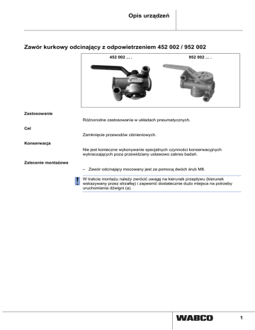 Opis urządzeń Zawór kurkowy odcinający z odpowietrzeniem 452 002 / 952 002 452 002 ... . 952 002 ... . Zastosowanie Różnorodne zastosowania w układach pneumatycznych. Cel Zamknięcie przewodów ciśnieniowych. Konserwacja Nie jest konieczne wykonywanie specjalnych czynności konserwacyjnych wykraczających poza przewidziany ustawowo zakres badań. Zalecenie montażowe – Zawór odcinający mocowany jest za pomocą dwóch śrub M8. W trakcie montażu należy zwrócić uwagę na kierunek przepływu (kierunek wskazywany przez strzałkę) i zapewnić dostatecznie dużo miejsca na potrzeby uruchomienia dźwigni (a). 1 Opis urządzeń Wymiary montażowe 452 002 131 0 952 002 000 0 Legenda Widok X Dane techniczne Numer katalogowy 452 002 131 0 452 002 132 0 Maks. ciśnienie robocze 952 002 000 0 10 bar Przyłącze gwintowane M 22x1,5 - 12 głęboki Uruchomienie dźwigni a/b 90° Dopuszczalne medium powietrze Zakres temperatur Ciężar 452 002 133 0 -40 °C do +80 °C 0,26 kg 0,26 kg 0,26 kg 0,58 kg Zawór kurkowy odcinający 90° w lewo 0° 90° w prawo 452 002 131 0 zamknięty otwarty zamknięty 452 002 132 0 odpowietrzony napowietrzony odpowietrzony 452 002 133 0 zamknięty napowietrzony odpowietrzony 952 002 000 0 zamknięty otwarty zamknięty 2 Opis urządzeń Zasada działania Przyłącza 1 Dopływ energii 2 Odpływ energii W pozycji dźwigni (a) równoległej do osi podłużnej zaworu odcinającego, wałek mimośrodowy (c) naciska zawór (d) w kierunku odwrotnym do kierunku nacisku sprężyny (e) (w lewo). Sprężone powietrze przemieszcza się z niezmienną siłą od przyłącza 1 przez wlot (f) do przewodu odchodzącego od przyłącza 2. Jeżeli dźwignia (a) zostanie obrócona o 90° do oporu, sprężyna naciskowa (e) poruszy zawór (d) w prawą stronę i wlot (f) zostanie zamknięty. Przewód odchodzący od przyłącza 2 jest odpowietrzany przez otwór wylotowy (b). 3