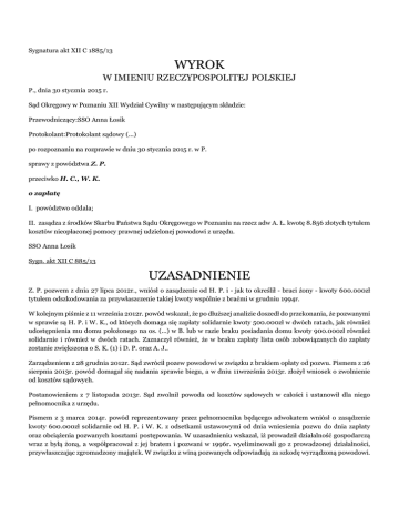 Sygnatura akt XII C 1885/13 WYROK W IMIENIU RZECZYPOSPOLITEJ POLSKIEJ P., dnia 30 stycznia 2015 r. Sąd Okręgowy w Poznaniu XII Wydział Cywilny w następującym składzie: Przewodniczący:SSO Anna Łosik Protokolant:Protokolant sądowy (...) po rozpoznaniu na rozprawie w dniu 30 stycznia 2015 r. w P. sprawy z powództwa Z. P. przeciwko H. C., W. K. o zapłatę I. powództwo oddala; II. zasądza z środków Skarbu Państwa Sądu Okręgowego w Poznaniu na rzecz adw A. Ł. kwotę 8.856 złotych tytułem kosztów nieopłaconej pomocy prawnej udzielonej powodowi z urzędu. SSO Anna Łosik Sygn. akt XII C 885/13 UZASADNIENIE Z. P. pozwem z dnia 27 lipca 2012r., wniósł o zasądzenie od H. P. i - jak to określił - braci żony - kwoty 600.000zł tytułem odszkodowania za przywłaszczenie takiej kwoty wspólnie z braćmi w grudniu 1994r. W kolejnym piśmie z 11 września 2012r. powód wskazał, że po dłuższej analizie doszedł do przekonania, że pozwanymi w sprawie są H. P. i W. K., od których domaga się zapłaty solidarnie kwoty 500.000zł w dwóch ratach, jak również udostępnienia mu domu położonego na os. (...) w B. lub w razie braku posiadania domu kwoty 900.000zł również solidarnie i również w dwóch ratach. Zaznaczył również, że w braku zapłaty lista osób zobowiązanych do zapłaty zostanie zwiększona o S. K. (1) i D. P. oraz A. J.. Zarządzeniem z 28 grudnia 2012r. Sąd zwrócił pozew powodowi w związku z brakiem opłaty od pozwu. Pismem z 26 sierpnia 2013r. powód domagał się nadania sprawie biegu, a w dniu 11września 2013r. złożył wniosek o zwolnienie od kosztów sądowych. Postanowieniem z 7 listopada 2013r. Sąd zwolnił powoda od kosztów sądowych w całości i ustanowił dla niego pełnomocnika z urzędu. Pismem z 3 marca 2014r. powód reprezentowany przez pełnomocnika będącego adwokatem wniósł o zasądzenie kwoty 600.000zł solidarnie od H. P. i W. K. z odsetkami ustawowymi od dnia wniesienia pozwu do dnia zapłaty oraz obciążenia pozwanych kosztami postępowania. W uzasadnieniu wskazał, iż prowadził działalność gospodarczą wraz z byłą żoną, a współpracował z jej bratem i pozwani w 1996r. wyeliminowali go z prowadzonej działalności, przywłaszczając zgromadzony majątek. W związku z winą pozwanych odpowiadają za szkodę wyrządzoną powodowi. Pełnomocnik powoda domagała się przyznania od Skarbu Państwa kosztów udzielonej z urzędu pomocy prawnej, wobec nieopłacenia ich nawet w części. W odpowiedzi na pozew, H. C. (zmiana nazwiska k.214) podniosła, że żądania powoda są bezpodstawne i stanowią jedynie urojenia chorego człowieka. Pozwany W. K. na rozprawie wniósł o oddalenie powództwa Sąd ustalił następujący stan faktyczny: Z. P. i H. P. byli małżeństwem, a zostało ono rozwiązane wyrokiem Sądu Okręgowego w Poznaniu z 25 czerwca 2001r. Wnioskiem z 28 kwietnia 2006r. powód domagał się podziału majątku wspólnego małżonków zgłaszając m.in., że w jego skład wchodzi kwota 600.000zł do rozliczenia, która została zgromadzona z prowadzonej działalności gospodarczej i współpracy z bratem H. P. S. K. (1). Sąd Rejonowy w Poznaniu ustalił w postępowaniu o podział majątku, iż w okresie od 1993-1995r. powód prowadził na własny rachunek działalność gospodarczą, współpracując jednocześnie z bratem żony S. K. (1), mieszkającym na stałe w Szwecji. Powód kilkukrotnie był w Szwecji, skąd przywoził do Polski używane maszyny do szycia, które po naprawie i przystosowaniu były sprzedawane w Polsce. Pozwana zajmowała się prowadzeniem księgowości w firmie. Około 1995r. powód pokłócił się z braćmi żony i zaprzestał prowadzenia działalności gospodarczej uznając, że nie jest rozliczony ze S. K. (1). Sąd Rejonowy uznał, iż powód nie wykazał, by w skład majątku wspólnego wchodziła wierzytelność 600.000zł w stosunku do S. K. (1), bądź też, by osoba ta przekazała wskazaną kwotę H. P.. W szczególności powód nie dysponował żadnym dokumentem potwierdzającym istnienie jakiejkolwiek umowy ze S. K. (1), ani też nie wiedział w jakich okolicznościach i z jakiego tytułu wierzytelność powstała. Nie kierował też żadnych roszczeń wobec S. K. (1). Wobec braku przedmiotu podziału, postanowieniem z 9 maja 2007r. Sąd oddalił wniosek powoda o podział majątku wspólnego. dowód: postanowienie z 9.05.2007r. z uzasadnieniem - akta(...) W 2011r. powód złożył do Prokuratury Rejonowej S. w P. doniesienie o popełnieniu przestępstwa na jego szkodę polegającego na przywłaszczeniu pieniędzy w kwocie 600.000zł. Postanowieniem z 12 czerwca 2012r. prokurator Prokuratury Rejonowej S. w P. odmówił wszczęcia śledztwa wobec stwierdzenia przedawnienia karalności czynu. dowód: postanowienie o odmowie wszczęcia śledztwa k. 13-14 Nie istnieje między stronami postępowania żaden stosunek prawny ani też inne zdarzenie prawne, z którym wiązać należałoby zobowiązanie pozwanych do zapłaty na rzecz powoda żądanej pozwem kwoty. Dowód: zeznania świadków A. J. i D. P. oraz pozwanych złożone na rozprawie. Oceniając zebrany w sprawie materiał dowodowy Sąd doszedł do następujących wniosków: Sąd uznał za wiarygodne zgromadzone w aktach sprawy dokumenty urzędowe, albowiem zostały sporządzone w przepisanej formie przez powołane do tego organy w zakresie ich działania. Sąd uznał za w pełni wiarygodne zgromadzone w aktach sprawy dokumenty prywatne, albowiem ich wiarygodność, a tym samym moc dowodowa, nie została przez strony skutecznie zakwestionowana, a Sąd nie znalazł podstaw do uczynienia tego z urzędu. Zeznania powoda nie doprowadziły do ustalenia, jaka wierzytelność przysługuje powodowi i w stosunku do jakiej osoby. Powód enigmatycznie wskazywał, że z bratem pozwanych S. K. (2) uzgodnił, że w związku z współpracą, którą podejmowali w latach 90-tych, osoba ta ma oddać powodowi 600.000zł tytułem rozl