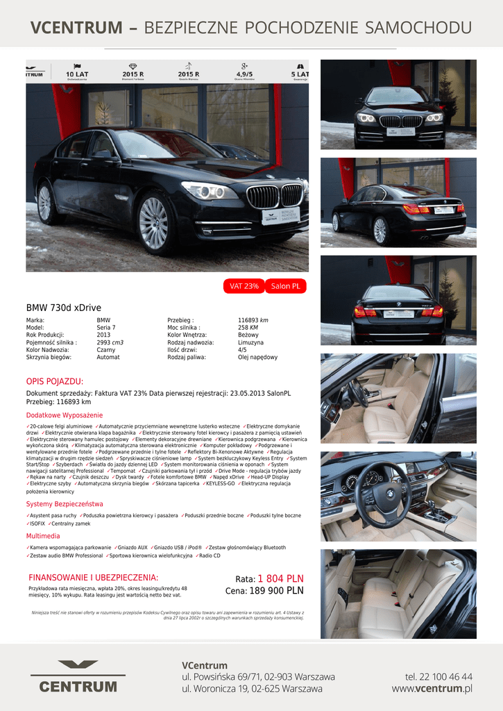 BMW 730d xDrive Marka: Model: Rok Produkcji: Pojemność silnika : Kolor Nadwozia: Skrzynia biegów: BMW Seria 7 2013 2993 cm3 Czarny Automat Przebieg : Moc silnika : Kolor Wnętrza: Rodzaj nadwozia: Ilość drzwi: Rodzaj paliwa: 116893 km 258 KM Beżowy Limuzyna 4/5 Olej napędowy OPIS POJAZDU: Dokument sprzedaży: Faktura VAT 23% Data pierwszej rejestracji: 23.05.2013 SalonPL Przebieg: 116893 km Dodatkowe Wyposażenie ✓20-calowe felgi aluminiowe ✓Automatycznie przyciemniane wewnętrzne lusterko wsteczne ✓Elektryczne domykanie drzwi ✓Elektrycznie otwierana klapa bagażnika ✓Elektrycznie sterowany fotel kierowcy i pasażera z pamięcią ustawień ✓Elektrycznie sterowany hamulec postojowy ✓Elementy dekoracyjne drewniane ✓Kierownica podgrzewana ✓Kierownica wykończona skórą ✓Klimatyzacja automatyczna sterowana elektronicznie ✓Komputer pokładowy ✓Podgrzewane i wentylowane przednie fotele ✓Podgrzewane przednie i tylne fotele ✓Reflektory Bi-Xenonowe Aktywne ✓Regulacja klimatyzacji w drugim rzędzie siedzeń ✓Spryskiwacze ciśnieniowe lamp ✓System bezkluczykowy Keyless Entry ✓System Start/Stop ✓Szyberdach ✓Światła do jazdy dziennej LED ✓System monitorowania ciśnienia w oponach ✓System nawigacji satelitarnej Professional ✓Tempomat ✓Czujniki parkowania tył i przód ✓Drive Mode - regulacja trybów jazdy ✓Rękaw na narty ✓Czujnik deszczu ✓Dysk twardy ✓Fotele komfortowe BMW ✓Napęd xDrive ✓Head-UP Display ✓Elektryczne szyby ✓Automatyczna skrzynia biegów ✓Skórzana tapicerka ✓KEYLESS-GO ✓Elektryczna regulacja położenia kierownicy Systemy Bezpieczeństwa ✓Asystent pasa ruchy ✓Poduszka powietrzna kierowcy i pasażera ✓Poduszki przednie boczne ✓Poduszki tylne boczne ✓ISOFIX ✓Centralny zamek Multimedia ✓Kamera wspomagająca parkowanie ✓Gniazdo AUX ✓Gniazdo USB / iPod® ✓Zestaw głośnomówiący Bluetooth ✓Zestaw audio BMW Professional ✓Sportowa kierownica wielofunkcyjna ✓Radio CD FINANSOWANIE I UBEZPIECZENIA: Przykładowa rata miesięczna, wpłata 20%, okres leasingu/kredytu 48 miesięcy, 10% wykupu. Rata leasingu jest wartością netto bez vat. Rata: 1 804 Cena: 189 900 PLN PLN Niniejsza treść nie stanowi oferty w rozumieniu przepisów Kodeksu Cywilnego oraz opisu towaru ani zapewnienia w rozumieniu art. 4 Ustawy z dnia 27 lipca 2002r o szczególnych warunkach sprzedaży konsumenckiej. Powered by TCPDF (www.tcpdf.org)