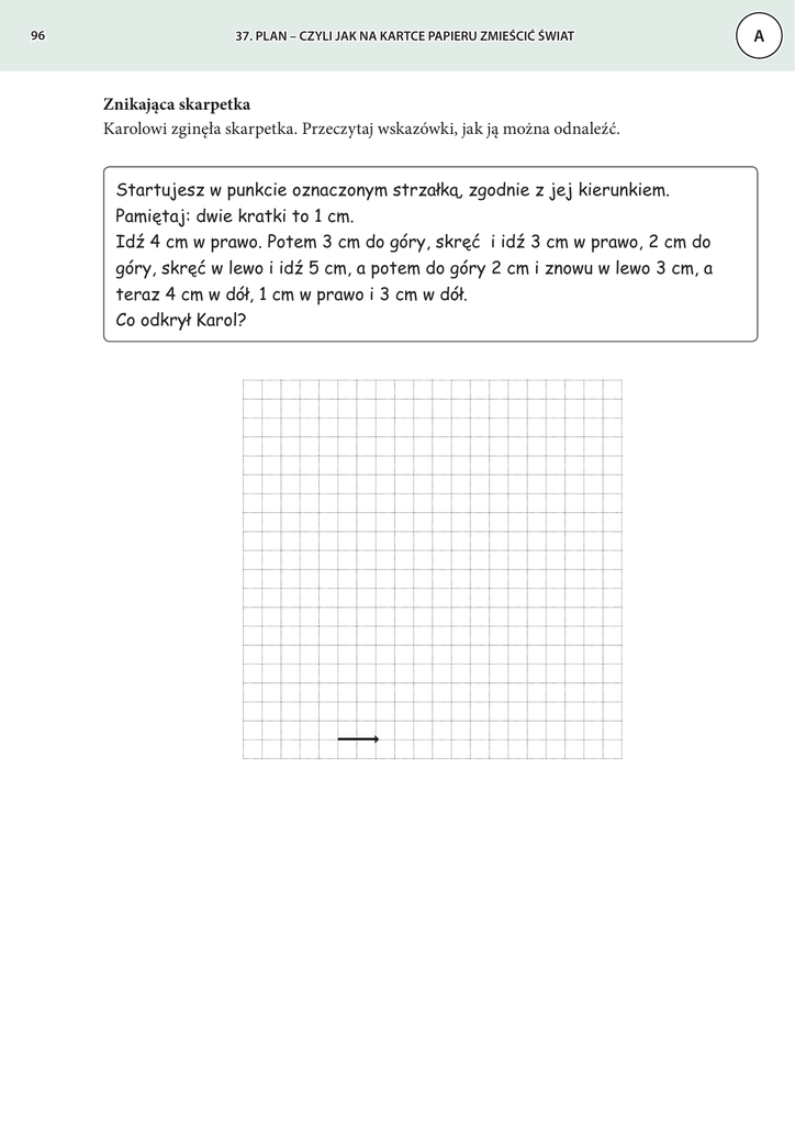 96 37. PLAN – CZYLI JAK NA KARTCE PAPIERU ZMIEŚCIĆ ŚWIAT Znikająca skarpetka Karolowi zginęła skarpetka. Przeczytaj wskazówki, jak ją można odnaleźć. 6WDUWXMHV]ZSXQNFLHR]QDF]RQ\PVWU]DâNċ]JRGQLH]MHMNLHUXQNLHP 3DPLĐWDMGZLHNUDWNLWRFP ,GĮFPZSUDZR3RWHPFPGRJyU\VNUĐþLLGĮFPZSUDZRFPGR JyU\VNUĐþZOHZRLLGĮFPDSRWHPGRJyU\FPL]QRZXZOHZRFPD WHUD]FPZGyâFPZSUDZRLFPZGyâ &RRGNU\â.DURO" A 97 37. PLAN – CZYLI JAK NA KARTCE PAPIERU ZMIEŚCIĆ ŚWIAT 1. Przeczytaj opis i zrób rysunek zgodnie zwartymi w opisie instrukcjami. Adam tak opisał swój pokój. 'U]ZLGRSRNRMXMXİQDU\VRZDâHP3ROHZHMVWURQLHSRNRMXQDĤURGNXĤFLDQ\MHVW RNQR0yMWDSF]DQVWRLSU]\ĤFLDQLHQDSUDZRRGGU]ZLDELXUNRSRGRNQHP 3U]\ELXUNXPDPNU]HVâR5HJDâ]NVLċİNDPLVWRLSU]\ĤFLDQLHQDSU]HFLZNRGU]ZL 1DOHZRRGUHJDâXPDPNRPRGĐZNWyUHMWU]\PDP]DEDZNLDQDSUDZR²V]DIĐ ]XEUDQLDPL drzwi B 98 37. PLAN – CZYLI JAK NA KARTCE PAPIERU ZMIEŚCIĆ ŚWIAT Dzieci z II klasy postanowiły zagospodarować boisko szkolne w następujący sposób: Zaplanowały dwie bramki, a po obu stronach bramek ustawiły ławki, każdą w odległości trzech metrów od bramki. Posadziły też, wzdłuż boiska, co dwa metry po 6 drzewek. 1. Pomóż dzieciom z klasy II dokończyć rysunek planu. Pamiętaj, że jedna kratka na rysunku to 1 metr w rzeczywistości (czyli boisko ma 14 metrów szerokości a 16 metrów długości). 2. Co jeszcze można dopisać do planu, żeby na boisku można było robić inne rzeczy? ................................................................................................. ................................................................................................. ................................................................................................. ................................................................................................. ................................................................................................. ................................................................................................. C