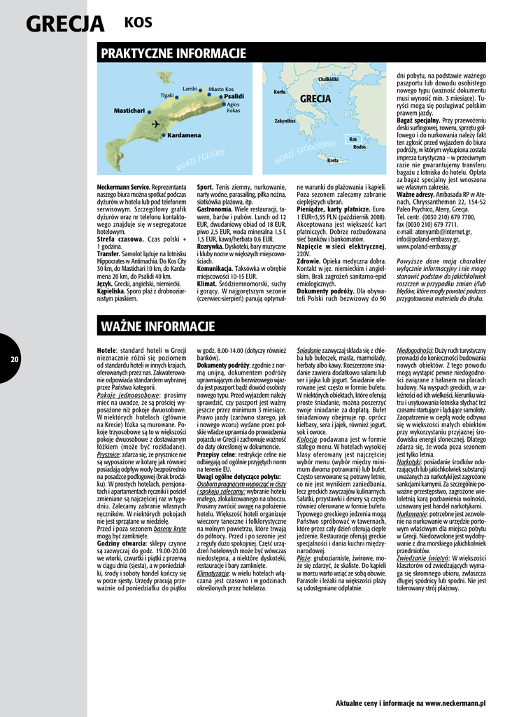 GRECJA Kos Praktyczne informacje Chalkidiki Lambi Miasto Kos Tigaki Psalidi Korfu Agios Fokas Mastichari GRECJA Zakynthos � Kardamena M GE ZE E OR Neckermann Service. Reprezentanta naszego biura można spotkać podczas dyżurów w hotelu lub pod telefonem serwisowym. Szczegółowy grafik dyżurów oraz nr telefonu kontaktowego znajduje się w segregatorze hotelowym. Strefa czasowa. Czas polski + 1 godzina. Transfer. Samolot ląduje na lotnisku Hippocrates w Antimachia. Do Kos City 30 km, do Mastichari 10 km, do Kardamena 20 km, do Psalidi 40 km. Język. Grecki, angielski, niemiecki. Kąpieliska. Sporo plaż z drobnoziarnistym piaskiem. JSKIE M RÓ ZE Ś OR Sport. Tenis ziemny, nurkowanie, narty wodne, parasailing, piłka nożna, siatkówka plażowa, itp. Gastronomia. Wiele restauracji, tawern, barów i pubów. Lunch od 12 EUR, dwudaniowy obiad od 18 EUR, piwo 2,5 EUR, woda mineralna 1,5 l. 1,5 EUR, kawa/herbata 0,6 EUR. Rozrywka. Dyskoteki, bary muzyczne i kluby nocne w większych miejscowościach. Komunikacja. Taksówka w obrębie miejscowości 10-15 EUR. Klimat. Śródziemnomorski, suchy i gorący. W najgorętszym sezonie (czerwiec-sierpień) panują optymal- DZIEM NE Kos Rodos Kreta ne warunki do plażowania i kąpieli. Poza sezonem zalecamy zabranie cieplejszych ubrań. Pieniądze, karty płatnicze. Euro. 1 EUR=3,55 PLN (październik 2008). Akceptowana jest większość kart płatniczych. Dobrze rozbudowana sieć banków i bankomatów. Napięcie w sieci elektrycznej. 220V. Zdrowie. Opieka medyczna dobra. Kontakt w jęz. niemieckim i angielskim. Brak zagrożeń sanitarno−epid emiologicznych. Dokumenty podróży. Dla obywateli Polski ruch bezwizowy do 90 dni pobytu, na podstawie ważnego paszportu lub dowodu osobistego nowego typu (ważność dokumentu musi wynosić min. 3 miesiące). Turyści mogą się posługiwać polskim prawem jazdy. Bagaż specjalny. Przy przewożeniu deski surfingowej, roweru, sprzętu golfowego i do nurkowania należy fakt ten zgłosić przed wyjazdem do biura podróży, w którym wykupiona została impreza turystyczna – w przeciwnym razie nie gwarantujemy transferu bagażu z lotniska do hotelu. Opłata za bagaż specjalny jest wnoszona we własnym zakresie. Ważne adresy. Ambasada RP w Atenach, Chryssanthemon 22, 154-52 Paleo Psychico, Ateny, Grecja. Tel. centr. (0030 210) 679 7700, fax (0030 210) 679 7711. e-mail: [email protected], [email protected], www.poland-embassy.gr Powyższe dane mają charakter wyłącznie informacyjny i nie mogą stanowić podstaw do jakichkolwiek roszczeń w przypadku zmian i/lub błędów, które mogły powstać podczas przygotowania materiału do druku. Ważne informacje 20 Hotele: standard hoteli w Grecji nieznacznie różni się poziomem od standardu hoteli w innych krajach, oferowanych przez nas. Zakwaterowanie odpowiada standardem wybranej przez Państwa kategorii. Pokoje jednoosobowe: prosimy mieć na uwadze, że są prościej wyposażone niż pokoje dwuosobowe. W niektórych hotelach (głównie na Krecie) łóżka są murowane. Pokoje trzyosobowe są to w większości pokoje dwuosobowe z dostawianym łóżkiem (może być rozkładane). Prysznice: zdarza się, że prysznice nie są wyposażone w kotarę jak również posiadają odpływ wody bezpośrednio na posadzce podłogowej (brak brodziku). W prostych hotelach, pensjonatach i apartamentach ręczniki i pościel zmieniane są najczęściej raz w tygodniu. Zalecamy zabranie własnych ręczników. W niektórych pokojach nie jest sprzątane w niedzielę. Przed i poza sezonem baseny kryte mogą być zamknięte. Godziny otwarcia: sklepy czynne są zazwyczaj do godz. 19.00-20.00 we wtorki, czwartki i piątki z przerwą w ciągu dnia (sjesta), a w poniedziałki, środy i soboty handel kończy się w porze sjesty. Urzędy pracują przeważnie od poniedziałku do piątku w godz. 8.00-14.00 (dotyczy również banków). Dokumenty podróży: zgodnie z normą unijną, dokumentem podróży uprawniającym do bezwizowego wjazdu jest paszport bądź dowód osobisty nowego typu. Przed wyjazdem należy sprawdzić, czy paszport jest ważny jeszcze przez minimum 3 miesiące. Prawo jazdy (zarówno starego, jak i nowego wzoru) wydane przez polskie władze uprawnia do prowadzenia pojazdu w Grecji i zachowuje ważność do daty określonej w dokumencie. Przepisy celne: restrykcje celne nie odbiegają od ogólnie przyjętych norm na terenie EU. Uwagi ogólne dotyczące pobytu: Osobom pragnącym wypocząć w ciszy i spokoju zalecamy: wybranie hotelu małego, zlokalizowanego na uboczu. Prosimy zwrócić uwagę na położenie hotelu. Większość hoteli organizuje wieczory taneczne i folklorystyczne na wolnym powietrzu, które trwają do północy. Przed i po sezonie jest z reguły dużo spokojniej. Część urządzeń hotelowych może być wówczas niedostępna, a niektóre dyskoteki, restauracje i bary zamknięte. Klimatyzacja: w wielu hotelach włączana jest czasowo i w godzinach określonych przez hotelarza. Śniadanie zazwyczaj składa się z chleba lub bułeczek, masła, marmolady, herbaty albo kawy. Rozszerzone śniadanie zawiera dodatkowo salami lub ser i jajka lub jogurt. Śniadanie oferowane jest często w formie bufetu. W niektórych obiektach, które oferują proste śniadanie, można poszerzyć swoje śniadanie za dopłatą. Bufet śniadaniowy obejmuje np. oprócz kiełbasy, sera i jajek, również jogurt, sok i owoce. Kolacja podawana jest w formie stałego menu. W hotelach wysokiej klasy oferowany jest najczęściej wybór menu (wybór między minimum dwoma potrawami) lub bufet. Często serwowane są potrawy letnie, co nie jest wynikiem zaniedbania, lecz greckich zwyczajów kulinarnych. Sałatki, przystawki i desery są często również oferowane w formie bufetu. Typowego greckiego jedzenia mogą Państwo spróbować w tawernach, które przez cały dzień oferują ciepłe jedzenie. Restauracje oferują greckie specjalności i dania kuchni międzynarodowej. Plaże: gruboziarniste