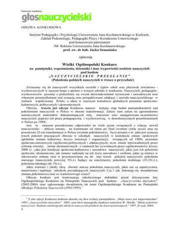 Patronat medialny: ODEZWA KONKURSOWA Instytut Pedagogiki i Psychologii Uniwersytetu Jana Kochanowskiego w Kielcach, Zakład Pedeutologii, Pedagogiki Pracy i Kształcenia Ustawicznego pod honorowym patronatem JM Rektora Uniwersytetu Jana Kochanowskiego prof. zw. dr hab. Jacka Semaniaka ogłaszają Wielki Ogólnopolski Konkurs na pamiętniki, wspomnienia, dzienniki i inne wypowiedzi osobiste nauczycieli pod hasłem „N A U C Z Y C I E L S K I E P R Z E S Ł A N I E ” (Pokolenia polskich nauczycieli w trosce o przyszłość) Zwracamy się do nauczycieli wszystkich szczebli i typów szkół oraz placówek oświatowo wychowawczych w naszym kraju z apelem o wzięcie udziału w konkursie. Nauczycieli, pedagogów, wychowawców prosimy o podzielenie się swymi doświadczeniami życiowymi i zawodowymi oraz własnymi przemyśleniami nad sytuacją oraz perspektywami edukacji i zawodu nauczycielskiego w realiach współczesnej Polski, a także w szerszym kontekście globalnych przemian społecznokulturowych, politycznych i ekonomicznych. Obecna, trzecia już edycja Konkursu stanowi kolejny etap badań pamiętnikarskich nad pokoleniami nauczycieli w Polsce w okresie transformacji. Zależy nam zatem na zgromadzeniu autentycznych materiałów dokumentujących rolę, znaczenie oraz zaangażowane uczestnictwo nauczycieli, poprzez ich pracę pedagogiczną i wychowawczą, w demokratycznych przeobrażeniach w Polsce po 1989r. Jest to zarazem poszukiwanie odpowiedzi na wiele pytań związanych z relacją: zawód nauczycielski – oblicza zmiany, na kontinuum od startu po finał (wymiar cyklu życia) oraz na przestrzeni 25-cia transformacji w Polsce (wymiar pokoleniowy). Są to pytania o to jaka jest sytuacja trzech pokoleń pracujących obecnie w szkołach nauczycieli w kontekście zmian: epokowych (globalna zmiana kulturowa, kryzys instytucji i organizacji); trwających od 1989r. przemian społeczno-ustrojowych (społeczno-politycznych i edukacyjnych, m.in. zmian wprowadzonych przez reformę oświaty; zmian ekonomicznych z ostatnich lat wywołanych przez ogólnoświatowy kryzys 2008 r) , jaka jest kondycja społeczno-kulturowa i zawodowa nauczycieli, jakie jest ich położenie społeczne, ekonomiczne, jak zmiany wpłynęły na ich życie zawodowe i osobiste, jakie są różnice w odczuwaniu zmiany oraz w przystosowaniu się do niej trzech pokoleń nauczycieli: pokolenia starszego (nauczyciele powyżej 55r.ż.i będący na emeryturze), pokolenia średniego (35-55r.ż.), pokolenia młodego (do 35r.ż.) Jakie wartości i ideały chcą chronić starsze pokolenia nauczycieli, jakie zaś są zapatrywania, nastawienia i aspiracje młodych, początkujących nauczycieli. Czy i jak dokonuje się nieunikniona zmiana pokoleniowa oraz co wartościowego wnosi? Obecny konkurs jest kontynuacją zakończonego dokładnie przed dziesięcioma laty Ogólnopolskiego Konkursu na Pamiętniki Nauczycieli pod hasłem: „Nauczycielska dojrzałość” (2002-2004) oraz ogłoszonego dwadzieścia lat temu Ogólnopolskiego Konkursu na Pamiętniki Młodego Pokolenia Nauczycieli (1992/1993). 1 1 Z obu edycji Konkursu drukiem ukazały się dwa wybory pamiętników: „Moja twarz jest niepowtarzalna” 1993; „Nauczycielska dojrzałość” 2005; oraz dwie monografie naukowe autorstwa W. Dróżki ”Młode pokolenie nauczycieli. Studium autobiografii młodych nauczycieli polskich lat dziewięćdziesiątych.” 1997, II wyd. 2004: 1 Patronat medialny: Szczególną prośbę kierujemy do nauczycieli starszych, z pierwszego pokolenia polskiej transformacji, które przeważnie znajduje się u schyłku swej nauczycielskiej kariery, bądź jest już na emeryturze. W fazie późnej dorosłości głównym zadaniem i siłą życiową staje się troska, a następnie mądrość, zaś kryzys, jaki się w tym okresie pojawia, wynika z napięcia miedzy integralnością a rozpaczą (Erikson). Która z tych nieuchronności podsumowywania i bilansów wieńczy dzieło naszych nauczycieli i wychowawców epoki Wielkiej Zmiany. Jak potoczyły się dalsze ich losy. Jakie jest ich usytuowanie społeczne i kulturowe w odmienionej rzeczywistości? Jest to zarazem pokolenie, którego całe dorosłe życie przypadło na czas demokratycznej transformacji ustrojowej w naszym kraju. Wartości, aspiracje i dążenia tego pokolenia najlepiej wyrazili autorzy pamiętników z lat 1992/93, jako młodzi wówczas, pełni entuzjazmu i zapału, początkujący nauczyciele, na starcie swej nauczycielskiej i życiowej drogi. W kolejnym konkursie „Nauczycielska dojrzałość”, gdy radykalne zmiany stały się faktem, nazwali siebie „Ostatnimi Mohikanami”. Jaki jest finał ich historii. Co przetrwało z marzeń, dążeń, ambicji i wysiłków. Jakie przesłanie chcieliby skierować do swych następców oraz do całego społeczeństwa. Zwracamy się zatem do Państwa z prośbą o osobistą, pisemną wypowiedź i refleksję w formie, jaka Wam najbardziej odpowiada; może to być pamiętnik, dziennik, list, czy też np. luźne zapiski o własnej drodze życiowej, doświadczeniach życiowych, edukacyjno - zawodowych, przemyśleniach, dążeniach, oczekiwaniach, propozycjach itp. Ważne, aby zawierały one szczere relacje z życia oraz własne oceny i refleksje. Najbardziej cenne dla prowadzonych badań będą te wypowiedzi, w których napiszecie szerzej o całym swoim dotychczasowym życiu, tak, jak ono przebiegało: dzieciństwo, wychowanie, szkoły, studia, start w zawodzie, małżeństwo, rodzina, rozwój zawodowy, kariera. W tym miejscu zwracamy się do Uczestników Konkursu na Pamiętniki Młodego Pokolenia Nauczycieli z przełomu 1992/1993 roku, jak również Uczestników Konkursu pod hasłem ”Nauczycielska dojrzałość” z lat 2002- 2004. Napiszcie, jak potoczyło się Wasze życie, czy spełniły się aspiracje i plany. Jak teraz postrzegacie siebie i otaczającą rzeczywistość? Jak widzicie przyszłość swoją, swej rodziny, społeczeństwa oraz rolę nauczyciel