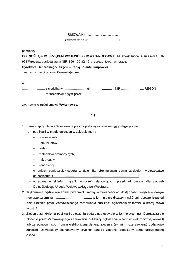 UMOWA Nr ..................................... zawarta w dniu: ………………………. r. pomiędzy: DOLNOŚLĄSKIM URZĘDEM WOJEWÓDZKIM we WROCŁAWIU, Pl. Powstańców Warszawy 1, 50951 Wrocław, posiadającym NIP 896-100-32-45 , reprezentowanym przez: Dyrektora Generalnego Urzędu – Panią Jolantę Krupowicz zwanym w treści umowy Zamawiającym, a: …………………, z siedzibą w …………………, ul. …………………, NIP …………………, REGON …………………, reprezentowaną/ym przez: ……………………………………………. zwaną/ym w treści umowy Wykonawcą. §1 1. Zamawiający zleca a Wykonawca przyjmuje do wykonania usługę polegającą na: a) publikacji w prasie ogłoszeń w zakresie m.in.: − obwieszczeń, − komunikatów, − reklam, − materiałów promocyjnych, − nekrologów, − kondolencji, w dniach poniedziałek-sobota w dzienniku obejmującym swym zasięgiem województwo dolnośląskie, tj. ……………………………………………………………………. ; b) opracowaniu składu i grafiki ogłoszeń stanowiących przedmiot umowy dla potrzeb Dolnośląskiego Urzędu Wojewódzkiego we Wrocławiu. 2. Wykonawca będzie realizował przedmiot umowy w zależności od dostępności miejsca w danym numerze dziennika ………………………………. w terminie nie dłuższym niż 3 dni robocze licząc od dnia złożenia przez Zamawiającego zamówienia publikacji ogłoszenia w formie, o której mowa w ust. 3. 3. Złożenie zamówienia publikacji ogłoszenia będzie następowało w formie pisemnej. Dopuszcza się złożenie przez Zamawiającego zamówienia publikacji ogłoszenia w formie: elektronicznej (e-mail) lub za pomocą fax-u. Forma elektroniczna danego zlecenia (e-mail) może zawierać dodatkowo załącznik zawierający zeskanowany oryginał danego zlecenia podpisany przez upoważnioną osobę. 1 4. Zamawiający będzie miał możliwość dokonania korekty treści danego ogłoszenia, będącej wynikiem błędu Zamawiającego. Zamawiający zleci dokonanie korekty ogłoszenia w tym samym dniu, w którym zostało złożone zamówienie na dokonanie publikacji tegoż ogłoszenia, nie później niż do godziny 16:00. Złożenie przez Zamawiającego zlecenia korekty ogłoszenia będzie się odbywało w formie określonej w ust. 3. 5. Zgłoszenie zlecenia korekty ogłoszenia na zasadach opisanych w ust. 3 oraz w terminie, o którym mowa w ust. 4 - umożliwiające Wykonawcy dokonanie publikacji skorygowanej wersji ogłoszenia w prasie przed zamknięciem danego nr gazety - w terminie, o którym mowa w ust. 2 - nie będzie traktowane jako nowe zlecenie publikacji ogłoszenia i nie pociągnie za sobą żadnych dodatkowych skutków finansowych dla Zamawiającego. Wykonawca będzie zobowiązany do publikacji skorygowanego ogłoszenia na zasadach opisanych w ust. 2. 6. Zgłoszenie zlecenia korekty ogłoszenia na zasadach opisanych w pkt 3 i w terminie, o którym mowa w pkt 4 - nie dającym możliwości Wykonawcy dokonania publikacji skorygowanej wersji ogłoszenia w prasie przed zamknięciem danego nr gazety - w terminie, o którym mowa w pkt 2 - będzie traktowane jako nowe zlecenie publikacji ogłoszenia. Wykonawca będzie zobowiązany do publikacji skorygowanego ogłoszenia na zasadach opisanych w pkt 2. 7. W przypadku wystąpienia wady (błędu) w realizacji przedmiotu umowy, polegającej na niezgodności treści danego ogłoszenia przekazanego Wykonawcy przez Zamawiającego do publikacji zgodnie z zasadami opisanymi w ust. 3 - z treścią ogłoszenia już opublikowanego w prasie, Wykonawca będzie zobligowany na swój koszt dokonać ponownej publikacji poprawnej treści danego ogłoszenia w terminie do 24 godzin od momentu zgłoszenia przez Zamawiającego zawiadomienia o wystąpieniu wady. Ogłoszenie zawierające poprawną treść musi dodatkowo być wyróżnione wyraźną ramką lub inną formą graficzną wśród ogłoszeń je otaczających oraz zawierać widoczną i wyraźną informację, iż jest to sprostowanie ogłoszenia. Zgłoszenie w/w wady przez Zamawiającego powinno być dokonane najpóźniej do godziny 16:00 dnia roboczego, w którym zauważono daną wadę. Złożenie przez Zamawiającego zawiadomienia o wystąpieniu wady w treści ogłoszenia, odbywać się będzie w formie określonej w ust. 3. 8. W razie stwierdzenia innej wady niż określonej w ust. 7 w wykonanym przedmiocie umowy Wykonawca zobowiązuje się zamieścić stosowne sprostowanie w terminie do 24 godzin od momentu zgłoszenia tej wady przez Zamawiającego. Przy zgłaszaniu w/w wady stosuje się odpowiednio zapisy ust. 7. 9. Zamawiający będzie miał możliwość całkowitego wycofania z publikacji danego ogłoszenia. Zamawiający będzie zobowiązany do złożenia zlecenia wycofania danego ogłoszenia z publikacji w tym samym dniu, w którym zostało złożone zamówienie na dokonanie publikacji tego ogłoszenia - nie później niż do godziny 16:00. Zlecenie wycofania danego ogłoszenia z publikacji, w powyższym terminie, nie pociągnie za sobą żadnych skutków finansowych dla Zamawiającego. 2 10. Zamawiający będzie mógł wcześnie zarezerwować miejsce u Wykonawcy w zakresie publikacji danego ogłoszenia. Dla potrzeb rezerwacji miejsca dla danego ogłoszenia, treść tegoż ogłoszenia będzie przekazywana drogą elektroniczną (e-mail) lub za pomocą faksu. Zamawiający w przypadku rezygnacji z zarezerwowanego miejsca na dane ogłoszenie, musi najpóźniej na 4 dni przed planowanym terminem ukazania się danego ogłoszenia w prasie, zawiadomić o fakcie rezygnacji Wykonawcę drogą elektroniczną (e-mail) lub za pomocą faksu. 11. Przedmiot umowy będzie wykonywany przez Wykonawcę sukcesywnie, według rzeczywistych potrzeb Zamawiającego(ilości zamówień) oraz cen określonych w Załączniku Nr 1 do umowy. 12. Wykonawca zobowiązuje się świadczyć swoje usługi na rzecz Zamawiającego z dołożeniem najwyższej s