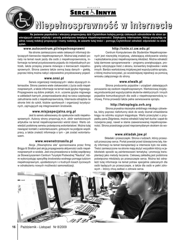 Niepełnosprawność w internecie Na jesienne popołudnia i wieczory proponujemy dziś Czytelnikom kolejną porcję ciekawych odnośników do stron zawierających cenne artykuły i porady poświęcone tematyce niepełnosprawności. Dziękujemy internautom, którzy przysyłają na adres naszej redakcji propozycje i mamy nadzieję, że zawarte tutaj treści – pomogą Czytelnikowi odnaleźć odpowiedzi na wiele pytań. www.autocentrum.pl/niepelnosprawni http://cnin.ci.uw.edu.pl Na stronie zamieszczono wiele ciekawych informacji dotyczących kierowców niepełnosprawnych. Można tutaj znaleźć porady na temat nauki jazdy dla osób z niepełnosprawnością, informacje na temat przystosowania pojazdu do indywidualnych potrzeb, także przepisy prawne mówiące o kierowcach niepełnosprawnych. Strona zawiera także cenną bazę danych – giełdę, poprzez którą można nabyć odpowiednio przystosowany pojazd. Centrum Komputerowe dla Studentów Niepełnosprawnych jest niezwykłą inicjatywą, ułatwiającą zdobywanie wiedzy i wykształcenia przez niepełnosprawną młodzież. Można odnaleźć tutaj darmowe oprogramowanie – programy powiększające, programy odczytujące treść z ekranu, konwertery brajlowskie i wiele innych. Bardzo wartościową inicjatywą jest wypożyczalnia sprzętu, z której można korzystać, po wcześniejszej rejestracji za pomocą wniosku załączonego do strony. www.onsi.pl Serwis organizacji niesłyszących i słabo słyszących internautów. Strona zawiera wiele ciekawostek z życia osób niepełnosprawnych, a także informacje na temat nauki języka migowego. Propagowane są dobre praktyki, m.in. uczenie języka migowego w zakładach karnych, przeprowadzanie akcji na rzecz częstszego zatrudniania osób z niepełnosprawnością. Internauta odnajdzie na stronie linki do szkół, klubów sportowych i organizacji turystycznych, zajmujących się integrowaniem środowisk. www.misjaspecjalna.org.pl Jest to serwis adresowany do opiekunów osób niepełnosprawnych. Autorzy strony proponują m.in. zbiór wartościowych artykułów na temat niepełnosprawności wśród dzieci. Warto odwiedzić podstronę serwisu poświęconą wolontariatowi. Można tutaj nawiązać kontakt z wolontariuszami, gotowymi na podjęcie współpracy, a także znaleźć informacje o tym – jak zostać wolontariuszem. www.wewnetrznasila.pl Akcja „Wewnętrzna siła” sponsorowana przez firmę Briggs & Stratton jest akcją propagowania aktywności osób niepełnosprawnych w wodzie. Jest ona prowadzona w ściślej współpracy ze Stowarzyszeniem Centrum Turystyki Podwodnej "Nautica", które wykorzystując specyfikę środowiska wodnego pomaga ludziom niepełnosprawnym, upośledzonym i o trudnych losach życiowych w odnalezieniu nowych możliwości samorealizacji. 16 Październik - Listopad Nr 8/2009 www.elwalk.pl Strona producenta pojazdów i urządzeń ułatwiających poruszanie się osobom niepełnosprawnym. Wartościową inicjatywą producenta jest wypożyczalnia skuterów elektrycznych i innych pojazdów komunikacyjnych dla osób z niepełnosprawnością ruchową. Firma prowadzi także pełne serwisowanie sprzętu. http://tetraplegia.ovh.org Strona prywatna niezwykle ambitnego młodego człowieka, który poprzez niefortunny skok do wody doznał zmiażdżenia kręgu na odcinku szyjnym kręgosłupa. Warto przeczytać o przypadku pana Zbigniewa, można odnaleźć tutaj hart ducha i zapał do rozwijania pasji, nawet w stanie zaawansowanej niepełnosprawności. Strona przestrzega przed nieprzemyślanym skokiem do wody. www.skladak.jaw.pl Składaki i przeszczepki. Strona o ludziach, którzy przeszszli przeszczep serca. Portal powstał przed dziesięcioma laty, kiedy informacji na temat transplantacji w internecie było nie wiele. Treści zamieszczone na stronie mają służyć wszystkim którzy w jakikolwiek sposób są zainteresowani tematyką i promocją transplantacji jako metody leczenia. Ciekawą zakładką jest podstrona poświęcona młodzieży po przeszczepie serca. Można też odnaleźć tutaj informacje na temat potraw specjalnie zalecanych dla osób będących po przeszczepie, a także dla osób w pełni zdrowych – którzy chcą zadbać o zdrowie serca.