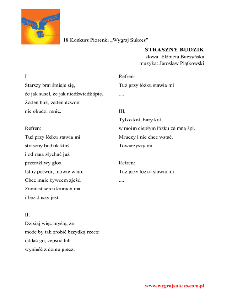 18 Konkurs Piosenki „Wygraj Sukces” STRASZNY BUDZIK słowa: Elżbieta Buczyńska muzyka: Jarosław Piątkowski I. Refren: Starszy brat śmieje się, Tuż przy łóżku stawia mi że jak suseł, że jak niedźwiedź śpię. .... Żaden huk, żaden dzwon nie obudzi mnie. III. Tylko kot, bury kot, Refren: w moim ciepłym łóżku ze mną śpi. Tuż przy łóżku stawia mi Mruczy i nie chce wstać. straszny budzik ktoś Towarzyszy mi. i od rana słychać już przeraźliwy głos. Refren: Istny potwór, mówię wam. Tuż przy łóżku stawia mi Chce mnie żywcem zjeść. .... Zamiast serca kamień ma i bez duszy jest. II. Dzisiaj więc myślę, że może by tak zrobić brzydką rzecz: oddać go, zepsuć lub wynieść z domu precz. www.wygrajsukces.com.pl