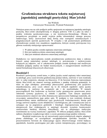 Grafemiczna struktura tekstu najstarszej japońskiej antologii poetyckiej Man'yōshū Jan Wiślicki Uniwersytet Warszawski, Wydział Polonistyki Niniejsza praca ma na celu podjęcie próby spojrzenia na najstarszą japońską antologię poetycką Man’yōshū (skompilowaną w drugiej połowie VIII w.) jako na tekst z punktu widzenia językoznawczego, a nie teoretyczno-literackiego. Obrana tu perspektywa przyjmuje za punkt wyjścia próbę rekonstrukcji samego procesu nadawczego, który zaowocował daną formą oraz szeregiem semantycznych i pragmatycznych zjawisk językowych. W związku z tak postawionym problemem sformułowane zostały trzy zasadnicze zagadnienia, którym zostały poświęcone trzy główne rozdziały niniejszego opracowania: 1. W jakim języku została napisana omawiana antologia; 2. Kto jest nadawcą tekstu omawianej antologii; 3. Jaka jest struktura tekstowa omawianej antologii. Dodatkowo we wprowadzeniu zostały przedstawione podstawowe dane z zakresu historii samej materialnej postaci antologii, tj. powstawania i zachowywania kolejnych jej odpisów, zaś w zakończeniu podjęta została dyskusja nad możliwym wkładem podjętej analizy do badań teoretycznych, z zasugerowaniem możliwych metod formalizacji kluczowych obserwacji. Rozdział I Rozdział I poświęcony został temu, w jakim języku został zapisany tekst omawianej tu antologii, przy czym kwestia grafemicznej postaci tekstu, zarówno w tym rozdziale, jak i w całej rozprawie, okazuje się kluczowa. O ile bowiem foniczna reprezentacja tekstu Man'yōshū nie stanowi nowego problemu z punktu widzenia gramatyki, to tekst na jego (dodajmy: pierwotnej) płaszczyźnie grafemicznej jest językowo niejednoznaczny, przy czym odnosi się to do różnych aspektów opisu języka naturalnego, tj. zarówno do semantyki jak i do morfoskładni. W ramach poszczególnych fraz kodowane są bowiem cechy gramatyczne generowane przez odmienne systemy językowe, tj. chiński i japoński. Tym samym spojrzenie monosystemowe stanowi nie tylko dramatyczne uproszczenie badanego materiału, ale zwyczajnie uniemożliwia jego pełen opis. W podjętej w tym rozdziale dyskusji postanowiliśmy zatem zdefiniować typy językowych wieloznaczności, biorąc pod uwagę zarówno aspekty czysto składniowe i morfologiczne, jak i semantyczne oraz te sytuujące się na pograniczu grafemiki i fonologii. Zaproponowana klasyfikacja nietypowych fraz widniejących w antologii dowodzi wyraźnie konieczności zastosowania bardziej złożonej klasyfikacji, niż ta obejmująca tradycyjne rozróżnienie na wyrazy kseniczne i japońskie. W obliczu podjętej analizy Man'yōshū nabiera charakteru wyjątkowego także z czysto gramatycznego punktu widzenia. Rozdział rozpoczyna się od zarysowania najwcześniejszych etapów adaptacji pisma chińskiego, ze szczególnym uwzględnieniem zjawiska kundoku. W przeciwieństwie bowiem do tradycyjnego ujęcia obserwowanego wśród badaczy japońskich, kundoku postrzegane jest jako system interpretacyjny, pozwalający na odwzorowanie jednego systemu relacji gramatycznych na drugi. O jego szczególnym charakterze decyduje fakt, iż chiński tekst grafemiczny o określonej postaci umożliwia szereg gramatycznych reinterpretacji, w tym wypadku na język japoński, w ramach przeformułowywania go do postaci fonicznej. Tak pojęte kundoku stanowi zatem system zasad morfoskładniowych wprowadzanych w życie podczas odczytu danego tekstu. Sam odczyt natomiast zyskuje tym samym znacznie ściśle gramatyczne. Najbardziej rozbudowaną i najważniejszą część rozdziału I stanowi podrozdział 4. Zasadniczym celem przedsięwziętej tu dyskusji jest pokazanie tego, jak w swojej grafemicznej postaci tekst antologii okazuje się być gramatycznie niejednorodny. Postawiona zostaje bowiem hipoteza, iż użycie ideogramów chińskich we wczesnym okresie adaptacji pisma chińskiego w japońszczyźnie zaowocowało powstaniem mieszanych, sino-japońskich struktur gramatycznych nieobserwowanych w późniejszym okresie, a tylko sporadycznie we wcześniejszym. Z tego punktu widzenia Man'yōshū stanowi szczególnie istotny materiał dla rozważań nad wielosystemowością, a także istnieniem gramatyki uniwersalnej i jej – mniej lub bardziej przypadkowych – form w postaci języków narodowych. Podjęta tu dyskusja podzielona jest na dwie części, z których pierwsza poświęcona jest partiom zapisanym prozą, druga zaś, znacznie bardziej złożona, partiom lirycznym. Wielosystemowość w ramach partii lirycznych objawia się bowiem znacznie szerzej z uwagi na fakt, iż obejmuje zarówno zjawiska z zakresu semantyki (podrozdział 4.4.3.1), fonologii (4.4.3.2), jak i morfoskładni, przy czym ostatnia grupa reprezentowana jest znacznie liczniej i wykazuje większą dywersyfikację (podrozdziały 4.4.3.3-5). Za szczególnie charakterystyczny przykład może posłużyć fragment pieśni 1788 ze zwoju IX (str. 76) 遠 不 有 „daleko nie być tōkaranaku ni ‘choć nie jest to daleko’ 尓 choć [ideogram zdesemantyzowany]” Fraza ta zawiera – typową dla japońszczyzny, za to nieobecną w języku chińskim – końcówkę gramatyczną ‘nie być’ 不 有 . Ta zaś zapisana została dla odmiany z prepozycją negacji: typową dla chińszczyzny, obcą zaś gramatyce języka japońskiego. W ramach ostatniego typu wielosystemowości, na który postanowiliśmy zwrócić uwagę, stanowi użycie metajęzyka którego frazy mają za zadanie konotować frazy języka przedmiotowego, tak że cała fraza nie ma charakteru cytacyjnego, będąc jedynie przez metajęzyk wprowadzana. Przykład użycia metajęzyka w powyższy sposób stanowi poniższa fraza (str. 85): 色二山上復有山者 Iro ni ideba Gdy na twarzy się przejawi Podkreślony wyraz ma charakter metajęzykowy, którego dosłowna analiza wygląda następująco: 山 上 復 有 山 góra na jeszcze jeden być góra 'Na [ideogramie] „山” jest jeszcze jeden [ideogram] „山