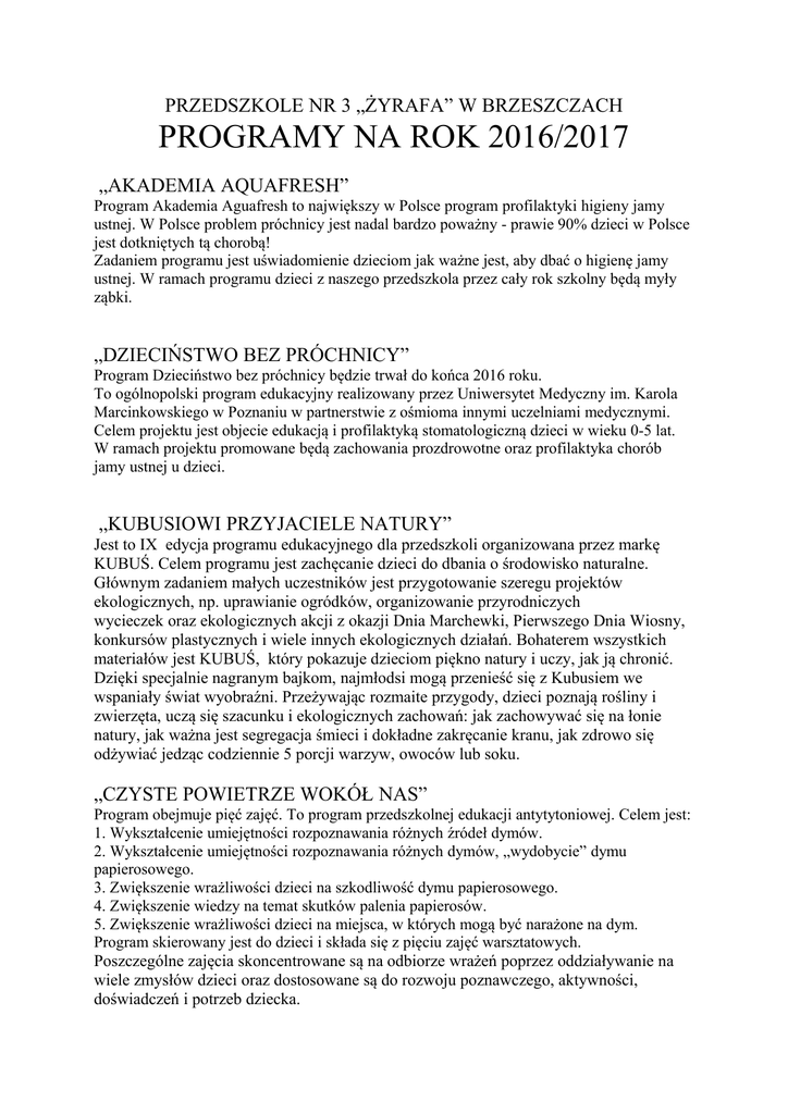PRZEDSZKOLE NR 3 „ŻYRAFA” W BRZESZCZACH PROGRAMY NA ROK 2016/2017 „AKADEMIA AQUAFRESH” Program Akademia Aguafresh to największy w Polsce program profilaktyki higieny jamy ustnej. W Polsce problem próchnicy jest nadal bardzo poważny - prawie 90% dzieci w Polsce jest dotkniętych tą chorobą! Zadaniem programu jest uświadomienie dzieciom jak ważne jest, aby dbać o higienę jamy ustnej. W ramach programu dzieci z naszego przedszkola przez cały rok szkolny będą myły ząbki. „DZIECIŃSTWO BEZ PRÓCHNICY” Program Dzieciństwo bez próchnicy będzie trwał do końca 2016 roku. To ogólnopolski program edukacyjny realizowany przez Uniwersytet Medyczny im. Karola Marcinkowskiego w Poznaniu w partnerstwie z ośmioma innymi uczelniami medycznymi. Celem projektu jest objecie edukacją i profilaktyką stomatologiczną dzieci w wieku 0-5 lat. W ramach projektu promowane będą zachowania prozdrowotne oraz profilaktyka chorób jamy ustnej u dzieci. „KUBUSIOWI PRZYJACIELE NATURY” Jest to IX edycja programu edukacyjnego dla przedszkoli organizowana przez markę KUBUŚ. Celem programu jest zachęcanie dzieci do dbania o środowisko naturalne. Głównym zadaniem małych uczestników jest przygotowanie szeregu projektów ekologicznych, np. uprawianie ogródków, organizowanie przyrodniczych wycieczek oraz ekologicznych akcji z okazji Dnia Marchewki, Pierwszego Dnia Wiosny, konkursów plastycznych i wiele innych ekologicznych działań. Bohaterem wszystkich materiałów jest KUBUŚ, który pokazuje dzieciom piękno natury i uczy, jak ją chronić. Dzięki specjalnie nagranym bajkom, najmłodsi mogą przenieść się z Kubusiem we wspaniały świat wyobraźni. Przeżywając rozmaite przygody, dzieci poznają rośliny i zwierzęta, uczą się szacunku i ekologicznych zachowań: jak zachowywać się na łonie natury, jak ważna jest segregacja śmieci i dokładne zakręcanie kranu, jak zdrowo się odżywiać jedząc codziennie 5 porcji warzyw, owoców lub soku. „CZYSTE POWIETRZE WOKÓŁ NAS” Program obejmuje pięć zajęć. To program przedszkolnej edukacji antytytoniowej. Celem jest: 1. Wykształcenie umiejętności rozpoznawania różnych źródeł dymów. 2. Wykształcenie umiejętności rozpoznawania różnych dymów, „wydobycie” dymu papierosowego. 3. Zwiększenie wrażliwości dzieci na szkodliwość dymu papierosowego. 4. Zwiększenie wiedzy na temat skutków palenia papierosów. 5. Zwiększenie wrażliwości dzieci na miejsca, w których mogą być narażone na dym. Program skierowany jest do dzieci i składa się z pięciu zajęć warsztatowych. Poszczególne zajęcia skoncentrowane są na odbiorze wrażeń poprzez oddziaływanie na wiele zmysłów dzieci oraz dostosowane są do rozwoju poznawczego, aktywności, doświadczeń i potrzeb dziecka.
