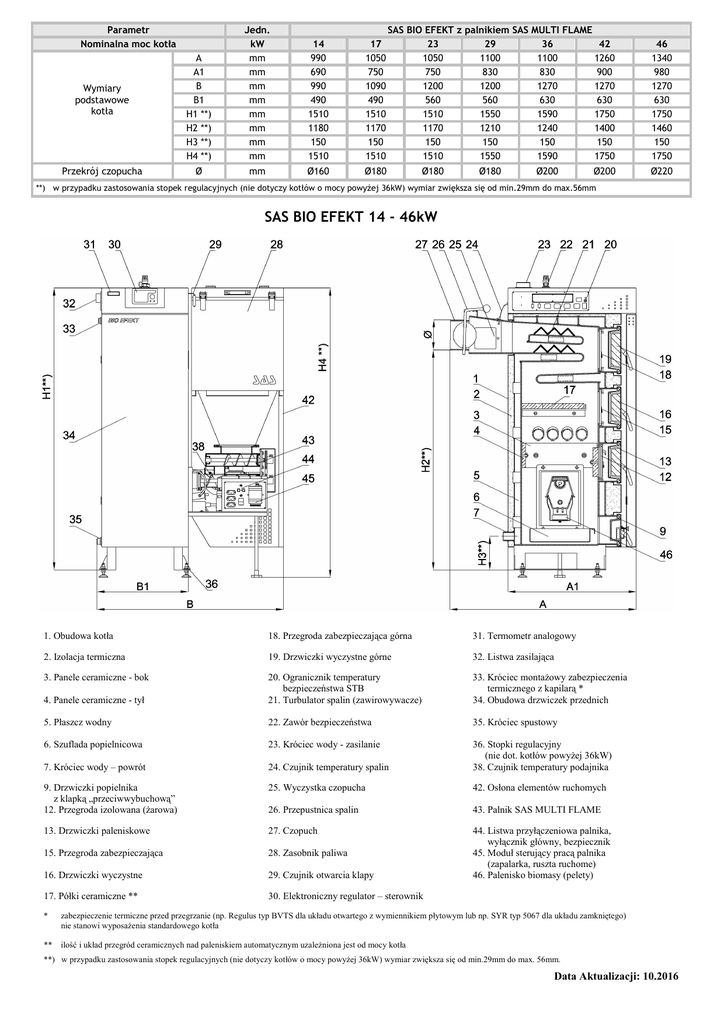 Parametr Nominalna moc kotła Wymiary podstawowe kotła Przekrój czopucha A A1 B B1 H1 **) H2 **) H3 **) H4 **) Jedn. kW mm mm mm mm mm mm mm mm 14 990 690 990 490 1510 1180 150 1510 17 1050 750 1090 490 1510 1170 150 1510 Ø mm Ø160 Ø180 SAS BIO EFEKT z palnikiem SAS MULTI FLAME 23 29 36 42 1050 1100 1100 1260 750 830 830 900 1200 1200 1270 1270 560 560 630 630 1510 1550 1590 1750 1170 1210 1240 1400 150 150 150 150 1510 1550 1590 1750 Ø180 Ø180 Ø200 Ø200 46 1340 980 1270 630 1750 1460 150 1750 Ø220 **) w przypadku zastosowania stopek regulacyjnych (nie dotyczy kotłów o mocy powyżej 36kW) wymiar zwiększa się od min.29mm do max.56mm SAS BIO EFEKT 14 - 46kW 1. Obudowa kotła 18. Przegroda zabezpieczająca górna 31. Termometr analogowy 2. Izolacja termiczna 19. Drzwiczki wyczystne górne 32. Listwa zasilająca 3. Panele ceramiczne - bok 4. Panele ceramiczne - tył 20. Ogranicznik temperatury bezpieczeństwa STB 21. Turbulator spalin (zawirowywacze) 33. Króciec montażowy zabezpieczenia termicznego z kapilarą * 34. Obudowa drzwiczek przednich 5. Płaszcz wodny 22. Zawór bezpieczeństwa 35. Króciec spustowy 6. Szuflada popielnicowa 23. Króciec wody - zasilanie 7. Króciec wody – powrót 24. Czujnik temperatury spalin 36. Stopki regulacyjny (nie dot. kotłów powyżej 36kW) 38. Czujnik temperatury podajnika 9. Drzwiczki popielnika z klapką „przeciwwybuchową” 12. Przegroda izolowana (żarowa) 25. Wyczystka czopucha 42. Osłona elementów ruchomych 26. Przepustnica spalin 43. Palnik SAS MULTI FLAME 13. Drzwiczki paleniskowe 27. Czopuch 15. Przegroda zabezpieczająca 28. Zasobnik paliwa 16. Drzwiczki wyczystne 29. Czujnik otwarcia klapy 44. Listwa przyłączeniowa palnika, wyłącznik główny, bezpiecznik 45. Moduł sterujący pracą palnika (zapalarka, ruszta ruchome) 46. Palenisko biomasy (pelety) 17. Półki ceramiczne ** 30. Elektroniczny regulator – sterownik * zabezpieczenie termiczne przed przegrzanie (np. Regulus typ BVTS dla układu otwartego z wymiennikiem płytowym lub np. SYR typ 5067 dla układu zamkniętego) nie stanowi wyposażenia standardowego kotła ** ilość i układ przegród ceramicznych nad paleniskiem automatycznym uzależniona jest od mocy kotła **) w przypadku zastosowania stopek regulacyjnych (nie dotyczy kotłów o mocy powyżej 36kW) wymiar zwiększa się od min.29mm do max. 56mm. Data Aktualizacji: 10.2016