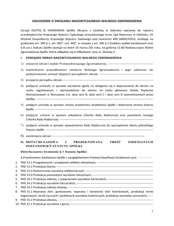 OGŁOSZENIE O ZWOŁANIU NADZWYCZAJNEGO WALNEGO ZGROMADZENIA Zarząd ESOTIQ & HENDERSON Spółka Akcyjna z siedzibą w Gdańsku wpisanej do rejestru przedsiębiorców Krajowego Rejestru Sądowego prowadzonego przez Sąd Rejonowy w Gdańsku, VII Wydział Gospodarczy Krajowego Rejestru Sadowego pod numerem KRS 0000370553, działając na podstawie art. 399 § 1, art. 4021 i art. 4022 w związku z art. 395 § 1 Kodeksu spółek handlowych oraz § 8 ust.1 Statutu Spółki zwołuje na dzień 10 marca 201 roku, na godzinę 12.00 Nadzwyczajne Walne Zgromadzenie Spółki, które odbędzie się w Mikołowie przy ul. Skośnej 2. I. PORZĄDEK OBRAD NADZWYCZAJNEGO WALNEGO ZGROMADZENIA 1) otwarcie obrad i wybór Przewodniczącego Zgromadzenia, ---------------------------------------------2) stwierdzenie prawidłowości zwołania Walnego Zgromadzenia i jego zdolności do podejmowania uchwał objętych porządkiem obrad, ------------------------------------------------------3) przyjęcie porządku obrad, -------------------------------------------------------------------------------------------4) podjęcie uchwały w sprawie wyrażenia zgody na ubieganie się o dopuszczenie do obrotu na rynku regulowanym i wprowadzenie do obrotu na rynku głównym Giełdy Papierów Wartościowych w Warszawie S.A. akcji serii B, akcji serii C i akcji serii D wyemitowanych przez Spółkę ----------------------------------------------------------------------------------------------------------------------5) podjęcie uchwały w sprawie zmiany przedmiotu działalności Spółki i dokonania zmiany Statutu Spółki -----------------------------------------------------------------------------------------------------------------------6) podjęcie uchwał w sprawie odwołania Członka Rady Nadzorczej oraz powołania nowego Członka Rady Nadzorczej ----------------------------------------------------------------------------------------------7) podjęcie uchwały w sprawie upoważnienia Rady Nadzorczej do sporządzenia tekstu jednolitego Statutu Spółki -------------------------------------------------------------------------------------------------------------- 8) zamknięcie obrad -------------- -------------------------------------------------------II. DOTYCHCZASOWA I PROJEKTOWANA POSTANOWIEŃ STATUTU SPÓŁKI TREŚĆ ZMIENIANYCH Dotychczasowe brzmienie § 3 Statutu Spółki: 1.Przedmiotem działalności Spółki z uwzględnieniem Polskiej Klasyfikacji Działalności jest: - - - - - - - - 1. 2. 3. 4. 5. 6. 7. 8. PKD 13.1 Przygotowanie i przędzenie włókien tekstylnych, --------------------------------------------------------PKD 13.2 Produkcja tkanin,--------------------------------------------------------------------------------------------------PKD 13.3 Wykończanie wyrobów włókienniczych, --------------------------------------------------------------------PKD 13.9 Produkcja pozostałych wyrobów tekstylnych, -------------------------------------------------------------PKD 14.1 Produkcja odzieży, z wyłączeniem wyrobów futrzarskich, ----------------------------------------------PKD 14.2 Produkcja wyrobów futrzarskich, -----------------------------------------------------------------------------PKD 14.3 Produkcja odzieży dzianej, --------------------------------------------------------------------------------------PKD 15.1 Wyprawa skór, garbowanie; wyprawa i barwienie skór futerkowych, produkcja toreb bagażowych, toreb ręcznych i podobnych wyrobów kaletniczych, produkcja wyrobów rymarskich, ----9. PKD 15.2 Produkcja obuwia, ------------------------------------------------------------------------------------------------10. PKD 22.1 Produkcja wyrobów z gumy, ------------------------------------------------------------------------------------ 1 11. 12. 13. 14. 15. 16. 17. 18. 19. 20. 21. 22. 23. 24. 25. 26. 27. 28. 29. 30. 31. 32. 33. 34. 35. 36. 37. 38. 39. 40. 41. 42. 43. 44. PKD 22.2 Produkcja wyrobów z tworzyw sztucznych, ----------------------------------------------------------------PKD 23.3 Produkcja ceramicznych materiałów budowlanych, -----------------------------------------------------PKD 23.4 Produkcja pozostałych wyrobów z porcelany i ceramiki, -----------------------------------------------PKD 32.1 Produkcja wyrobów jubilerskich, biżuterii i podobnych wyrobów, -----------------------------------PKD 32.9 Produkcja wyrobów, gdzie indziej niesklasyfikowana, ---------------------------------------------------PKD 46.1 Sprzedaż hurtowa realizowana na zlecenie, ----------------------------------------------------------------PKD 46.4 Sprzedaż hurtowa artykułów użytku domowego,---------------------------------------------------------PKD 46.7 Pozostała wyspecjalizowana sprzedaż hurtowa, ----------------------------------------------------------PKD 46.9 Sprzedaż hurtowa niewyspecjalizowana, -------------------------------------------------------------------PKD 46.16 Działalność agentów zajmujących się sprzedażą wyrobów tekstylnych, odzieży, wyrobów futrzarskich, obuwia i artykułów skórzanych,---------------------------------------------------------------------------PKD 46.17 Działalność agentów zajmujących się sprzedażą żywności, napojów i wyrobów tytoniowych, --------------------------------------------------------------------------------------------------------------------PKD 46.18 Działalność agentów specjalizujących się w sprzedaży pozostałych określonych towarów, --PKD 46.19 Działalność agentów zajmujących się sprzedażą towarów różnego rodzaju, ---------------------PKD 47.1 Sprzedaż detaliczna prowadzona w niewyspecjalizowanych sklepach, -----------------------------PKD 47.4 Sprzedaż detaliczna narzędzi technologii informacyjnej i komunikacyjnej prowadzona w wyspecjalizowanych sklepach, ---------------------------------------------------------------------------------------------PKD 47.41 Sprzedaż detaliczna komputerów, urządzeń peryfer