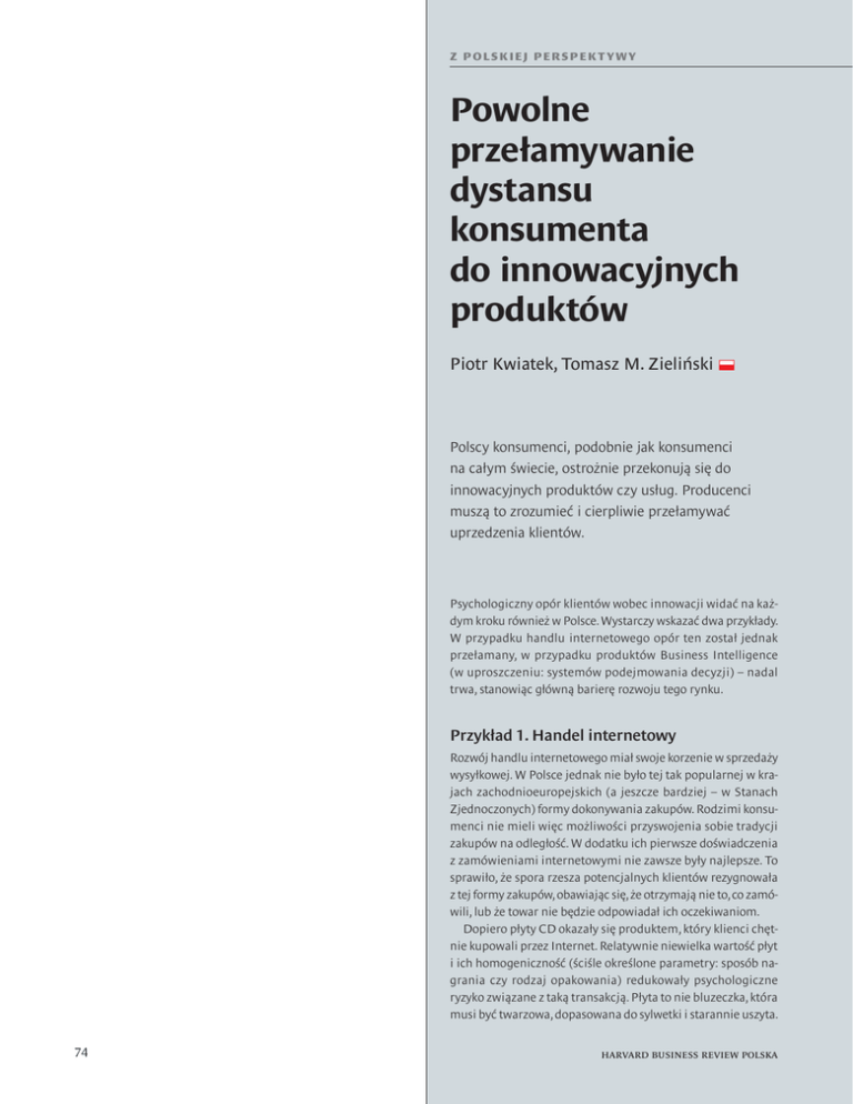 z polskiej perspektywy Powolne przełamywanie dystansu konsumenta do innowacyjnych produktów Piotr Kwiatek, Tomasz M. Zieliński Polscy konsumenci, podobnie jak konsumenci na całym świecie, ostrożnie przekonują się do innowacyjnych produktów czy usług. Producenci muszą to zrozumieć i cierpliwie przełamywać uprzedzenia klientów. Psychologiczny opór klientów wobec innowacji widać na każdym kroku również w Polsce. Wystarczy wskazać dwa przykłady. W przypadku handlu internetowego opór ten został jednak przełamany, w przypadku produktów Business Intelligence (w uproszczeniu: systemów podejmowania decyzji) – nadal trwa, stanowiąc główną barierę rozwoju tego rynku. Przykład 1. Handel internetowy Rozwój handlu internetowego miał swoje korzenie w sprzedaży wysyłkowej. W Polsce jednak nie było tej tak popularnej w krajach zachodnioeuropejskich (a jeszcze bardziej – w Stanach Zjednoczonych) formy dokonywania zakupów. Rodzimi konsumenci nie mieli więc możliwości przyswojenia sobie tradycji zakupów na odległość. W dodatku ich pierwsze doświadczenia z zamówieniami internetowymi nie zawsze były najlepsze. To sprawiło, że spora rzesza potencjalnych klientów rezygnowała z tej formy zakupów, obawiając się, że otrzymają nie to, co zamówili, lub że towar nie będzie odpowiadał ich oczekiwaniom. Dopiero płyty CD okazały się produktem, który klienci chętnie kupowali przez Internet. Relatywnie niewielka wartość płyt i ich homogeniczność (ściśle określone parametry: sposób nagrania czy rodzaj opakowania) redukowały psychologiczne ryzyko związane z taką transakcją. Płyta to nie bluzeczka, która musi być twarzowa, dopasowana do sylwetki i starannie uszyta. 74 harvard business review polska A tę, która nie przypadnie nam do gustu, można przecież dać komuś w prezencie. Inną barierą psychologiczną w rozwoju handlu internetowego była kwestia płatności. W sprzedaży wysyłkowej opłatę uiszczano za zaliczeniem pocztowym, co wynikało nie tylko z małego rozpowszechnienia usług elektronicznych, ale też z obawy przed nienamacalnym przepływem pieniędzy. Gdy paczkę przynosił kurier czy listonosz, wymiana następowała w sposób naturalny – z ręki do ręki. Gdy zaś płatności trzeba było dokonać z góry, kartą lub przelewem, ta bezpieczna procedura wydawała się być naruszona. Nic więc dziwnego, że klienci nie od razu uwierzyli w bezpieczeństwo i wygodę transakcji elektronicznych. Dopiero kilkuletnia edukacja rynkowa sprawiła, że transakcje te zdobyły zaufanie dużej rzeszy Polaków. Toteż dziś sytuacja jest zgoła inna. Na zaufaniu wynikającym z doświadczenia innych osób bazuje bardzo popularny internetowy serwis aukcyjny Allegro.pl. System komentarzy i ocen sprawia, że obie strony redukują ryzyko: kupujący – dokonania płatności z góry, sprzedający – wysłania przesyłki za zaliczeniem pocztowym. Ten przykład pokazuje, że konsumenci chętniej uczą się od siebie nawzajem niż na przykład od przedstawicieli tradycyjnych firm handlowych, których uważają za mniej obiektywnych. Istnieją też bariery pozorne, bowiem wiele uprzedzeń można przełamać. Upadkowi internetowego sklepu spożywczego Webvan w USA, którego klienci obawiali się, że nie będą mieli możliwości wyboru najświeższych owoców i warzyw, warto przeciwstawić doświadczenia polskiej sieci sklepów „Piotr i Paweł” oraz Tesco w Wielkiej Brytanii, gdzie z sukcesem przełamano te uprzedzenia konsumentów. Obie firmy najpierw budowały zaufanie do siebie wśród klientów tradycyjnych sklepów oraz troszczyły się o ich pozytywne skojarzenia z marką i dopiero na tej podstawie stworzyły dodatkową wartość, jaką są wygodne zakupy w sklepie internetowym czy możliwość zapłacenia kartą przy odbiorze. Siła zaufania widoczna jest również w tym, że – jak podają przedstawiciele sieci „Piotr i Paweł” – z internetowej sprzedaży produktów spożywczych najchętniej korzystają mieszkańcy Poznania, rodzimego miasta tej sieci. Klienci ci darzą sieć większym niż gdzie indziej zaufaniem ze względu na wspólne pochodzenie. Zaufanie do firmy przyczynia się do zredukowania psychologicznych kosztów zakupów odbieranych jako ryzykowne. Jego budowa wymaga jednak czasu, podobnie jak czasu wymaga oswojenie się klientów z wprowadzanymi na rynek innowacyjnymi produktami i usługami. Przykład 2. Business Intelligence Innym przykładem obrazującym ostrożne podchodzenie konsumentów do innowacyjnych rozwiązań jest rozwój polskiego rynku Business Intelligence (BI – programów i systemów komputerowych do zbierania, przechowywania, wyszukiwania i analizowania danych, które są potrzebne menedżerom do podejmowania decyzji), który jeszcze 10 lat temu uznawany był za wysoce perspektywiczny, o potencjale ocenianym na październik 2006 ponad połowę budżetów informatycznych przedsiębiorstw. Eksperci biznesowi zgodnie przewidywali nieunikniony sukces firm z tej branży. W odpowiedzi na te szumne prognozy działające na rynku firmy informatyczne prężnie rozwijały działy BI, pojawiło się również wielu nowych graczy oferujących produkty analityczne i raportowe. Po upływie dekady wiemy już, że ambitne prognozy rozwoju rynku Business Intelligence nie sprawdziły się nawet w połowie, a przedsiębiorstwa z tej branży zajmują się na powrót „klasyczną” informatyką. I tym razem kłania się psychologia postrzegania „korzyści” i „strat”. Rozwiązania BI, dzięki swojej szybkości i wykorzystywanym w nich metodologiom, potrafią ułatwić menedżerom „ogarnięcie” dużo większej złożoności niż tradycyjne systemy informatyczne. Używając tych nowoczesnych narzędzi, menedżerowie są w stanie konstruować i wdrażać unikalne i bardzo złożone strategie biznesowe gwarantujące osiąganie ponadprzeciętnych zysków. Dlaczego więc nie mogą się one przebić w Pol