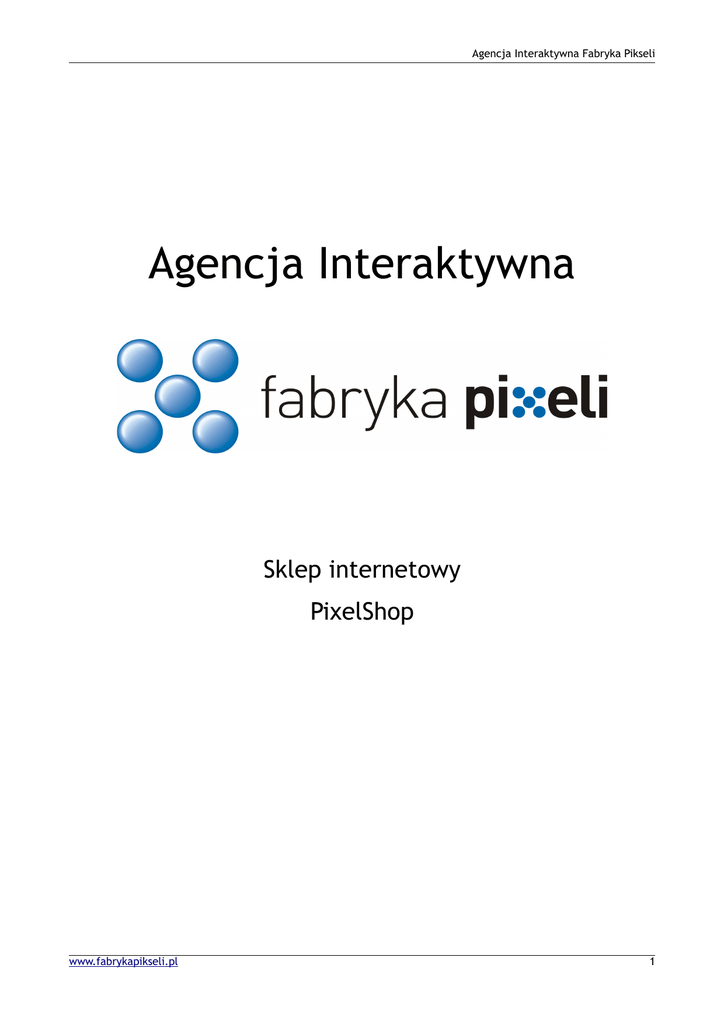 Agencja Interaktywna Fabryka Pikseli Agencja Interaktywna Sklep internetowy PixelShop www.fabrykapikseli.pl 1 Agencja Interaktywna Fabryka Pikseli 1. Opis aplikacji: Sklep internetowy PixelShop jest samodzielną, autorską aplikacją służącą do prowadzenia aktywnej sprzedaży produktów w Internecie. Doświadczenie zdobyte podczas zarządzania sklepami internetowymi naszych Klientów pozwoliło nam na stworzenie narzędzia prostego w obsłudze, łatwego w adaptacji, a przede wszystkim przyjaznego zarówno dla Klienta, jak i administratora sklepu. 2. System pozwala na: ● składanie zamówień zarówno przez klientów posiadających konto w sklepie (zarejestrowanych) jak i niezarejestrowanych; ● przydzielanie indywidualnych rabatów klientom zarejestrowanym; ● zarządzanie promocjami (także osobno dla klientów posiadających konto w sklepie jak i niezarejestrowanych); ● układanie produktów wg określonych kategorii i podkategorii; ● możliwość wystawiania opinii produktom (tylko dla zarejestrowanych użytkowników); ● weryfikację autentyczności składanych zamówień (po złożeniu zamówienia system wysyła do Klienta mail z prośbą o potwierdzenie złożenia zamówienia poprzez kliknięcie na odpowiedni link zawarty w wiadomości); ● informowanie Klienta o procesie realizacji zamówienia (na każdym etapie automatycznie wysyłana jest wiadomość do Klienta – przyjęto zamówienie, zamówienie w realizacji, zamówienie zostało wysłane) ; ● integrację z jednym lub wieloma systemami płatności elektronicznych (AllPay, Płatności24.pl, E-card, PayPal, inny wskazany przez Państwa); ● automatyczne generowanie statystyk i raportów dot. działalności sklepu (przyjętych zamówień, liczby klientów, posiadanego towaru, itp) zarówno w formie wewnętrznych raportów, jak i plików Excela (np. do celów importu w innych programach); ● automatyczne generowanie wewnętrznych listów nadawczych (nr zamówienia, dane adresata, itp) – istnieje także możliwość tworzenia korespondencji seryjnej (opcja); ● wpisywanie do bazy aktualnych stanów magazynowych towaru (dzięki czemu sklep nie pozwoli sprzedać więcej, niż znajduje się w magazynie); ● zarządzanie danymi klientów (w szczególności tych, którzy wyrazili zgodę na przetwarzanie danych w celach marketingowych – statystyki, raporty, możliwość gromadzenia adresów e-mail); ● możliwość zarządzania bazą produktów liczącą kilkadziesiąt tysięcy pozycji. www.fabrykapikseli.pl 2 Agencja Interaktywna Fabryka Pikseli 3. Możliwości rozbudowy: System można rozbudować integrując go z używanym przez Państwa: ● programem magazynowym; ● programem księgowym; ● programem do realizacji i śledzenia wysyłek; ● systemem aukcyjnym Allegro lub Ebay; ● innym sklepem lub platformą handlową; ● aplikacją do zarządzania adresami email Klientów i rozsyłania mailingów PixelMail (szczegóły w osobnej broszurze lub na stronie www.fabrykapikseli.pl/email-marketing.php). 4. Kontakt: Krzysztof Bienias Dyrektor Zarządzający Tel.: 0 606 157 427 e-mail: [email protected] www.fabrykapikseli.pl Fabryka Pikseli ul. Modelarska 18 40-142 Katowice Tel.: 32 720 62 53 e-mail: [email protected] www.fabrykapikseli.pl 3