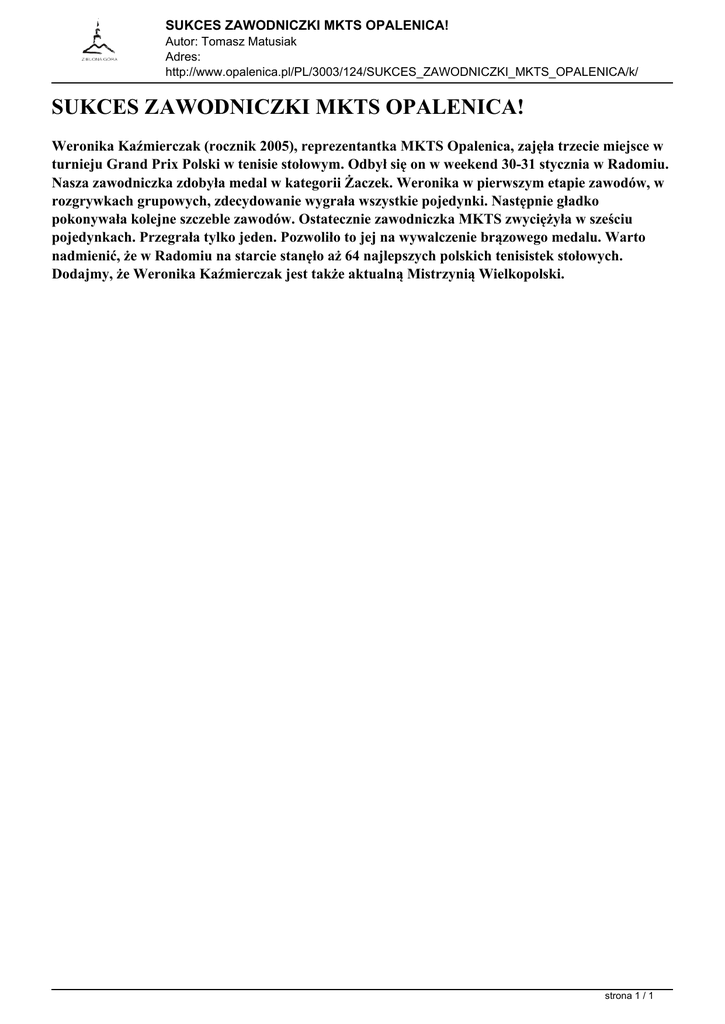 SUKCES ZAWODNICZKI MKTS OPALENICA! Autor: Tomasz Matusiak Adres: http://www.opalenica.pl/PL/3003/124/SUKCES_ZAWODNICZKI_MKTS_OPALENICA/k/ SUKCES ZAWODNICZKI MKTS OPALENICA! Weronika Kaźmierczak (rocznik 2005), reprezentantka MKTS Opalenica, zajęła trzecie miejsce w turnieju Grand Prix Polski w tenisie stołowym. Odbył się on w weekend 30-31 stycznia w Radomiu. Nasza zawodniczka zdobyła medal w kategorii Żaczek. Weronika w pierwszym etapie zawodów, w rozgrywkach grupowych, zdecydowanie wygrała wszystkie pojedynki. Następnie gładko pokonywała kolejne szczeble zawodów. Ostatecznie zawodniczka MKTS zwyciężyła w sześciu pojedynkach. Przegrała tylko jeden. Pozwoliło to jej na wywalczenie brązowego medalu. Warto nadmienić, że w Radomiu na starcie stanęło aż 64 najlepszych polskich tenisistek stołowych. Dodajmy, że Weronika Kaźmierczak jest także aktualną Mistrzynią Wielkopolski. strona 1 / 1 Powered by TCPDF (www.tcpdf.org)