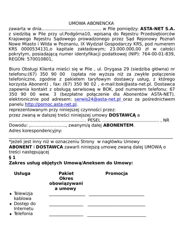 UMOWA ABONENCKA zawarta w dnia...................…...................... w Pile pomiędzy: ASTA-NET S.A. z siedzibą w Pile przy ul.Podgórna10, wpisaną do Rejestru Przedsiębiorców Krajowego Rejestru Sądowego prowadzonego przez Sąd Rejonowy Poznań Nowe Miasto i Wilda w Poznaniu, IX Wydział Gospodarczy KRS, pod numerem KRS 0000534131,o kapitale zakładowym; 23.000.000,00 zł w całości pokrytym, posiadającą numer identyfikacji podatkowej (NIP): 764-00-01-839, REGON: 570010801, Biuro Obsługi Klienta mieści się w Pile , ul. Drygasa 29 (siedziba główna) nr telefonu:(67) 350 90 00 (opłata nie wyższa niż za zwykłe połączenie telefoniczne, zgodnie z pakietem taryfowym dostawcy usług, z którego korzysta Abonent) , fax: (67) 350 90 02 , e-mail:[email protected]. Dostawca zapewnia kontakt z obsługą serwisową w BOK, pod numerem telefonu: 67 350 90 00 wew. 3 (bezpłatne połączenie dla Abonentów ASTA-NET). elektronicznie pod adresem: [email protected] oraz za pośrednictwem panelu http://pomoc.asta-net.pl. reprezentowanym przy niniejszej czynności przez: przez zwaną w dalszej treści niniejszej umowy DOSTAWCĄ a …...................................................... PESEL …....................................... , NR Dowodu: ,.........................., zwanym/ą dalej ABONENTEM. Adres korespondencyjny: _____________________________________________________________________________ *jeżeli jest inny niż w oznaczeniu Strony w nagłówku Umowy ABONENT i DOSTAWCA zawarli niniejszą umowę zwaną dalej UMOWĄ o treści następującej §1 Zakres usług objętych Umową/Aneksem do Umowy: Usługa ♦ Telewizja kablowa ♦ Dostęp do Internetu ♦ Telefonia Pakiet Promocja Okres obowiązywani a umowy _________________ __________________________ ________________ ___________________________ ________________ Szczegółowe warunki świadczenia usługi telefonii: DODATKOWE USŁUGI TELEFONICZNE: zastrzeżenie numeru dla numeru , Szczegółowa specyfikacja połączeń , blokada połączeń wychodzących dla numeru , prezentacja numeru przychodzącego dla numeru , usługa FAX2Mail dla numeru , bezpłatne połączenia dla numeru , wewnątrz sieci ASTA-NET * *zmiana numeru wskazanego przez Abonenta może być dokonywana nie częściej niż co 3 miesiące Urządzenie Abonenckie udostępnione Abonentowi: WYDANE Wartość URZĄDZENIE Cena udostępnionego ABONENCKIE sprzedaży sprzętu dekoder cyfrowy udostępnienie najem sprzedaż karta dostępowa udostępnienie najem sprzedaż modem kablowy udostępnienie najem sprzedaż przewodowy modem udostępnienie najem sprzedaż bezprzewodowy modem kablowy udostępnienie najem sprzedaż voip dekoder cyfrowy udostępnienie najem sprzedaż HD moduł CAM udostępnienie najem sprzedaż dekoder HD PVR udostępnienie najem sprzedaż bramka SIP udostępnienie najem sprzedaż acces point, antena radiowa, udostępnienie najem sprzedaż okablowanie, mocowanie zestaw abonencki WIMAX udostępnienie najem sprzedaż terminal GPON udostępnienie najem sprzedaż Inne Wysokość kosztów i opłat Rodzaj opłaty Opłata przyłączeniowa (to jest:. wykonanie przyłącza, podłączenie usługi) Opłata aktywacyjna Abonament miesięczny Przedpłaty, o których mowa w § 8 Regulaminu (w tym Kaucja) Inne (wszelkie inne opłaty, koszty itp.): ………………………… ………………………… Telewizja Internet Telefon Kwoty wskazane w tabeli uwzględniają podatek VAT. Wskazana kwota Abonamentu wynika z zapisów Cennika lub Regulaminu promocji i obowiązuje na dzień zawarcia Umowy. Kwota ta może podlegać zmianom, w przypadku zmiany zapisów Cennika lub Regulaminu promocji, na zasadach określonych w Regulaminie. Dostawca informuje, że wszelkie podlegające opłacie świadczenia dodatkowe związane z Umową, których skali i wysokości rozsądnie oceniając nie można z uwagi na ich charakter przewidzieć w momencie zawarcia Umowy wskazane zostały w Cenniku wraz ze stawką lub sposobem obliczenia należnych za nie opłat. Opłaty za te świadczenia nie są uwzględnione w pozycjach zamieszczonych w powyższej tabeli. Przedpłaty, o których mowa w § 8 Regulaminu (w tym Kaucje) uiszczane są w następujący sposób: jednorazowo w dniu zawarcia bądź wznowienia umowy lub w terminie indywidualnie uzgodnionym z klientem. W przypadku, w którym w ramach Usługi dostarczane są Treści cyfrowe Dostawca informuje o funkcjonalnościach tych Treści cyfrowych oraz mających zastosowanie technicznych środkach ich ochrony, a także mających znaczenie interoperacyjnościach Treści cyfrowych ze sprzętem komputerowym i oprogramowaniem. W przypadku Usługi telewizji cyfrowej informacja w tym zakresie określona jest w § 18 ust. 8 i ust. 11 Regulaminu. Postanowienia dodatkowe, w tym minimalny okres do skorzystania z warunków promocyjnych: _____________________________________________________________________________ _____________________________________________________________________________ _____________________________________________________________________________ _____________________________________________________________________________ § 2 Postanowienia ogólne 1. Na podstawie niniejszej Umowy Dostawca zobowiązuje się do odpłatnego świadczenia na rzecz Abonenta wskazanych w § 1 Umowy Abonenckiej usług telekomunikacyjnych, wybranych przez Abonenta określonych w Zamówieniu. Dostawca świadczy Usługi w zakresie istniejących możliwości technicznych zgodnie ze standardami norm telekomunikacyjnych wiążących Dostawcę w tym zakresie. W zależności od szczegółowych postanowień Umowy Abonenckiej Dostawca świadczy na rzecz Abonenta usługę dostarczania sieci telekomunikacyjnej, przeznaczonej do rozpowszechniania lub rozprowadzania programów radia i telewizji, do świadczenia usługi dostępu do Internetu lub do świadczenia usługi telefonicznej, usługę rozpowszechniania lub rozprowadzania programów radia i telewizji, usługę dostęp