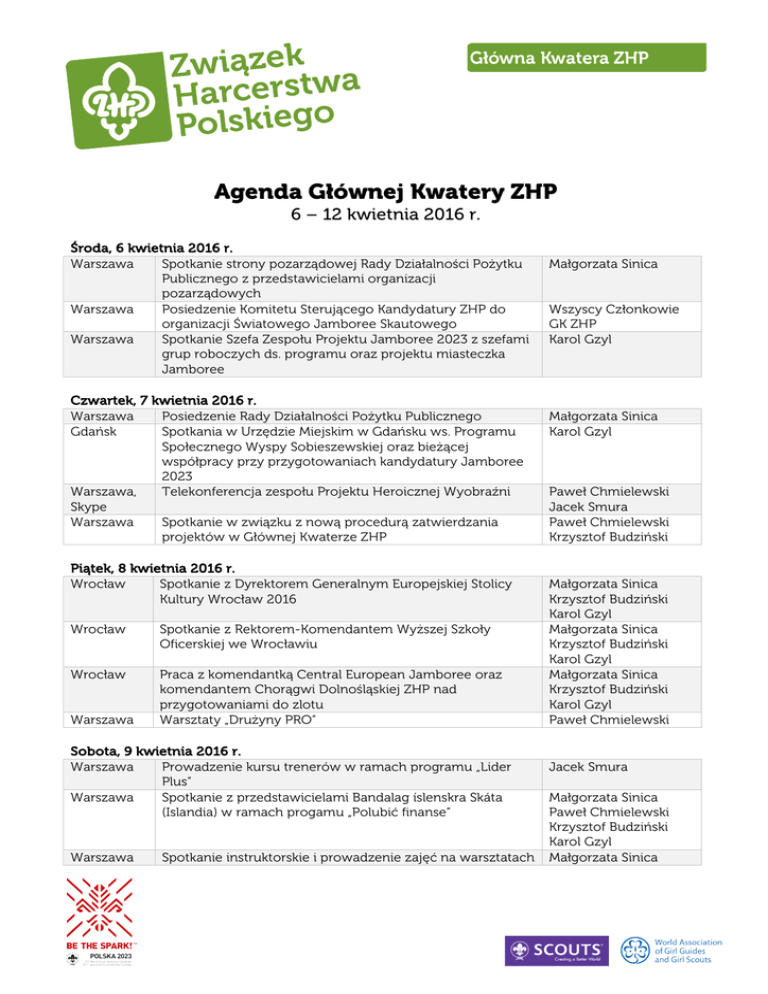 Agenda Głównej Kwatery ZHP 6 – 12 kwietnia 2016 r. Środa, 6 kwietnia 2016 r. Warszawa Spotkanie strony pozarządowej Rady Działalności Pożytku Publicznego z przedstawicielami organizacji pozarządowych Warszawa Posiedzenie Komitetu Sterującego Kandydatury ZHP do organizacji Światowego Jamboree Skautowego Warszawa Spotkanie Szefa Zespołu Projektu Jamboree 2023 z szefami grup roboczych ds. programu oraz projektu miasteczka Jamboree Czwartek, 7 kwietnia 2016 r. Warszawa Posiedzenie Rady Działalności Pożytku Publicznego Gdańsk Spotkania w Urzędzie Miejskim w Gdańsku ws. Programu Społecznego Wyspy Sobieszewskiej oraz bieżącej współpracy przy przygotowaniach kandydatury Jamboree 2023 Warszawa, Telekonferencja zespołu Projektu Heroicznej Wyobraźni Skype Warszawa Spotkanie w związku z nową procedurą zatwierdzania projektów w Głównej Kwaterze ZHP Piątek, 8 kwietnia 2016 r. Wrocław Spotkanie z Dyrektorem Generalnym Europejskiej Stolicy Kultury Wrocław 2016 Wrocław Spotkanie z Rektorem-Komendantem Wyższej Szkoły Oficerskiej we Wrocławiu Wrocław Praca z komendantką Central European Jamboree oraz komendantem Chorągwi Dolnośląskiej ZHP nad przygotowaniami do zlotu Warsztaty „Drużyny PRO” Warszawa Sobota, 9 kwietnia 2016 r. Warszawa Prowadzenie kursu trenerów w ramach programu „Lider Plus” Warszawa Spotkanie z przedstawicielami Bandalag íslenskra Skáta (Islandia) w ramach progamu „Polubić finanse” Warszawa Spotkanie instruktorskie i prowadzenie zajęć na warsztatach Małgorzata Sinica Wszyscy Członkowie GK ZHP Karol Gzyl Małgorzata Sinica Karol Gzyl Paweł Chmielewski Jacek Smura Paweł Chmielewski Krzysztof Budziński Małgorzata Sinica Krzysztof Budziński Karol Gzyl Małgorzata Sinica Krzysztof Budziński Karol Gzyl Małgorzata Sinica Krzysztof Budziński Karol Gzyl Paweł Chmielewski Jacek Smura Małgorzata Sinica Paweł Chmielewski Krzysztof Budziński Karol Gzyl Małgorzata Sinica „Drużyny Pro” Warszawa Warszawa Warszawa Warszawa Spotkanie instruktorskie z uczestnikami konferencji „Impuls” oraz „Inspirady” Spotkanie z szefami grup roboczych ds. programu, promocji oraz Międzynarodowej Grupy Kontaktowej w ramach przygotowań kandydatury ZHP Jamboree 2023 Spotkanie Naczelnik ZHP z szefową grupy roboczej ds. programu w ramach przygotowań kandydatury ZHP Jamboree 2023 Spotkanie komendy Letniej Akcji Szkoleniowej Niedziela, 10 kwietnia 2016 r. Warszawa Udział w uroczystościach związanych z 6. rocznicą katastrofy smoleńskiej Warszawa Spotkanie Naczelnika ZHP z kierowniczką Wydziału Inspiracji i Poradnictwa GK ZHP Poniedziałek, 11 kwietnia 2016 r. Warszawa Prowadzenie szkolenia dla szefów biur chorągwi Warszawa, Spotkanie zespołu ds. „opcji zero” – praca nad instrukcją Skype HALiZ w związku ze zmianą rozporządzenia MEN Warszawa Spotkanie z komendantem Chorągwi Mazowieckiej ZHP Wtorek, 12 kwietnia 2016 r. Warszawa Robocze spotkanie Głównej Kwatery ZHP Poznań Warszawa Spotkanie z szefową grupy roboczej ds. programu Spotkanie z biegłym rewidentem księgowym w związku z procesem rozdzielenia działalności gospodarczej od wychowawczej w ZHP Paweł Chmielewski Krzysztof Budziński Justyna Sikorska Małgorzata Sinica Krzysztof Budziński Karol Gzyl Małgorzata Sinica Paweł Chmielewski Małgorzata Sinica Krzysztof Budziński Wojciech Jurkowsk Małgorzata Sinica Krzysztof Budziński Justyna Sikorska Justyna Sikorska Paweł Chmielewski Wszyscy Członkowie GK ZHP Karol Gzyl Paweł Chmielewski 2016-04-13 12.00 KGZ