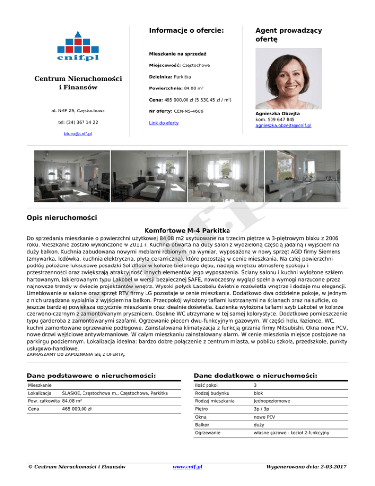 Agent prowadzący ofertę Opis nieruchomości Dane podstawowe o