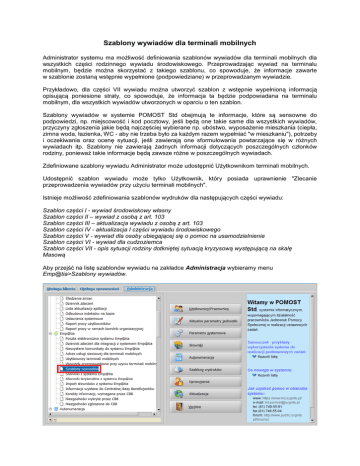 Szablony wywiadów dla terminali mobilnych Administrator systemu ma możliwość definiowania szablonów wywiadów dla terminali mobilnych dla wszystkich części rodzinnego wywiadu środowiskowego. Przeprowadzając wywiad na terminalu mobilnym, będzie można skorzystać z takiego szablonu, co spowoduje, że informacje zawarte w szablonie zostaną wstępnie wypełnione (podpowiedziane) w przeprowadzanym wywiadzie. Przykładowo, dla części VII wywiadu można utworzyć szablon z wstępnie wypełnioną informacją opisującą poniesione straty, co spowoduje, że informacja ta będzie podpowiadana na terminalu mobilnym, dla wszystkich wywiadów utworzonych w oparciu o ten szablon. Szablony wywiadów w systemie POMOST Std obejmują te informacje, które są sensowne do podpowiedzi, np. miejscowość i kod pocztowy, jeśli będą one takie same dla wszystkich wywiadów, przyczyny zgłoszenia jakie będą najczęściej wybierane np. ubóstwo, wyposażenie mieszkania (ciepła, zimna woda, łazienka, WC - aby nie trzeba było za każdym razem wypełniać "w mieszkaniu"), potrzeby i oczekiwania oraz ocenę sytuacji, jeśli zawierają one sformułowania powtarzające się w różnych wywiadach itp. Szablony nie zawierają żadnych informacji dotyczących poszczególnych członków rodziny, ponieważ takie informacje będą zawsze różne w poszczególnych wywiadach. Zdefiniowane szablony wywiadu Administrator może udostępnić Użytkownikom terminali mobilnych. Udostępnić szablon wywiadu może tylko Użytkownik, który posiada uprawnienie "Zlecanie przeprowadzenia wywiadów przy użyciu terminali mobilnych". Istnieje możliwość zdefiniowania szablonów wydruków dla następujących części wywiadu: Szablon części I - wywiad środowiskowy własny Szablon części II – wywiad z osobą z art. 103 Szablon części III – aktualizacja wywiadu z osobą z art. 103 Szablon części IV - aktualizacja I części wywiadu środowiskowego Szablon części V - wywiad dla osoby ubiegającej się o pomoc na usamodzielnienie Szablon części VI - wywiad dla cudzoziemca Szablon części VII - opis sytuacji rodziny dotkniętej sytuacją kryzysową występującą na skalę Masową Aby przejść na listę szablonów wywiadu na zakładce Administracja wybieramy menu Emp@tia>Szablony wywiadów. Zostanie otwarte okno "Szablony wywiadów dla terminali mobilnych", w którym mamy możliwość dodawania, modyfikowania, przeglądania szablonów wywiadów dla terminali mobilnych oraz udostępniania ich dla terminali mobilnych. Aby dodać nowy szablon wywiadu, wybieramy ikonę Dodaj. W oknie "Szablon wywiadu dla terminali mobilnych" określamy Część wywiadu, dla którego definiujemy szablon oraz Nazwę szablonu. W sekcji Informacje, które będą się podpowiadać dla wszystkich wywiadów utworzonych z tego szablonu na poszczególnych zakładkach uzupełniamy informacje, które mają się podpowiadać dla wszystkich wywiadów utworzonych na podstawie definiowanego szablonu, czyli wspólne informacje dla wszystkich wywiadów. Zakres i zawartość poszczególnych zakładek zależy od wybranej Części wywiadu. Uwaga: Należy wypełnić co najmniej jedną informację, która będzie się podpowiadać dla wywiadów utworzonych z tego szablonu. Wprowadzone dane szablonu zatwierdzamy ikoną Akceptuj. Dodany szablon pojawi się na liście szablonów, w górnej części okna. Gotowy szablon wywiadu możemy udostępnić dla terminali mobilnych. W tym celu zaznaczamy go na liście i wybieramy przycisk Udostępnij szablon. Uwaga: Udostępnienie szablonu dla terminali mobilnych spowoduje brak możliwości dalszej modyfikacji tego szablonu. Otworzy się okno "Udostępnienie szablonu wywiadu dla terminali mobilnych". W polu Użytkownik terminalu mobilnego, zaznaczając odpowiednią opcję, określamy czy chcemy udostępnić wskazany szablon wszystkim użytkownikom terminali mobilnych - wszyscy, czy tylko wybranemu - wybrany. Po zaznaczeni opcji wybrany, należy wskazać konkretnego Użytkownika terminalu mobilnego, któremu chcemy udostępnić szablon. W polu Wersja wywiadu obsługiwana przez terminal mobilny możemy wybrać, czy wywiad który udostępniamy, ma być wysłany na terminal zgodnie ze strukturą w wersji 1 (wprowadzonej Opisem systemu dla pomocy społecznej w wersji 1.03) czy w wersji 4 (wprowadzonej Opisem systemu dla pomocy społecznej w wersji 1.04, ogłoszonym 19 grudnia 2014 roku). System POMOST Std podpowiada wartość 1 lub 4 na podstawie wartości parametru systemowego o nazwie "Wersja wywiadów dla terminalu". Domyślnie parametr ustawiony jest na 1, a Administrator systemu POMOST powinien go zmienić na wartość 4 po upewnieniu się, że terminale mobilne używane w Jednostce zostały zaktualizowane do nowej wersji oprogramowania terminali, obsługującej wersję 4 struktury wywiadów. Po zmianie parametru na 4 wartość 4 będzie podpowiadana dla wszystkich nowych udostępnień szablonu. Jeżeli chcemy zrezygnować z udostępnienia szablonu wywiadu, wybieramy przycisk Rezygnuj. Po uzupełnieniu wszystkich danych udostępnienia wybieramy przycisk Udostępnij szablon wywiadu dla terminali mobilnych. Wskazany szablon wywiadu zostanie wysłany do Użytkowników terminali mobilnych. Udostępniony szablon pojawi się w sekcji Udostępnienia szablonu dla terminali mobilnych i będzie oczekiwał na odebranie przez użytkownika terminalu mobilnego. Za pomocą przycisku Prezentuj udostępniony szablon możemy udostępniony szablonu wywiadu, można tam zobaczyć, że szablon zawiera informacje, jakie ustaliliśmy do podpowiedzi. Kiedy udostępniony szablon wywiadu zostanie odebrany przez Użytkownika terminalu mobilnego, to po ponownym wejściu na okno "Szablony wywiadów dla terminali mobilnych", albo po wybraniu z menu Czynności pozycji Odśwież dane, szablon zostanie oznaczony w kolumnie "Czy odebrano". Uwaga: Nie można ponownie udostępnić tego samego szablonu do tego samego Użytkownika, korzystając z 