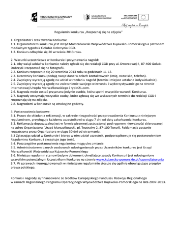 Regulamin konkursu „Rozpoznaj się na zdjęciu” 1. Organizator i czas trwania Konkursu: 1.1. Organizatorem konkursu jest Urząd Marszałkowski Województwa Kujawsko-Pomorskiego a patronem medialnym tygodnik Golubia Dobrzynia CGD. 1.2. Konkurs odbędzie się 20 września 2013 roku. 2. Warunki uczestnictwa w Konkursie i przyznawania nagród: 2.1. Aby wziąć udział w konkursie należy zgłosić się do redakcji CGD przy ul. Dworcowej 4, 87-400 GolubDobrzyń i rozpoznać się na fotografii. 2.2. Konkurs rozpocznie się 20 września 2013 roku w godzinach 11-13. 2.3. Uczestnicy konkursu podają swoje dane w celach kontaktowych (imię, nazwisko, telefon). 2.4. Zwycięzcy wyrażają zgodę na udział w rozdaniu nagród (termin i miejsce ustalane indywidualnie). 2.5. Zwycięzcy wyrażają zgodę na uwiecznienie swojego wizerunku i wykorzystywanie go na stronie internetowej Urzędu Marszałkowskiego i rypin21.com. 2.6. Nagroda może zostać przyznana jedynie osobie, która spełni wszystkie warunki Konkursu. 2.7. Nagrody otrzymają wszystkie osoby, które zgłoszą się we wskazanych terminie do redakcji CGD i rozpoznają się na zdjęciu. 2.8. Nagrodami w konkursie są atrakcyjne gadżety. 3. Postanowienia końcowe: 3.1. Prawo do składania reklamacji, w zakresie niezgodności przeprowadzenia Konkursu z niniejszym regulaminem, przysługuje każdemu uczestnikowi w ciągu 7 dni od daty zakończenia Konkursu. 3.2. Reklamacja dopuszczalna jest w formie pisemnej zastrzeżonej pod rygorem nieważności skierowanej na adres Organizatora (Urząd Marszałkowski, pl. Teatralny 2, 87-100 Toruń). Reklamacja zostanie rozpatrzona przez Organizatora w ciągu 30 dni od otrzymania. 3.3 Zgłaszając udział w Konkursie i biorąc w nim udział uczestnik, podporządkowuje się postanowieniom Regulaminu Konkursu i akceptuje jego treść. 3.4. Poszczególne postanowienia regulaminu mogą ulec zmianie. 3.5. Administratorem danych osobowych udostępnianych przez Uczestników konkursu jest Urząd Marszałkowski Województwa Kujawsko-Pomorskiego 3.6. Niniejszy regulamin stanowi jedyny dokument określający zasady Konkursu i jest udostępniony wszystkim potencjalnym Uczestnikom Konkursu na stronie www.kujawsko-pomorskie.pl/razemdlatorunia 3.7. W sprawach nieuregulowanych w niniejszym regulaminie stosuje się ogólnie obowiązujące przepisy prawa polskiego. Konkurs i nagrody są finansowane ze środków Europejskiego Funduszu Rozwoju Regionalnego w ramach Regionalnego Programu Operacyjnego Województwa Kujawsko-Pomorskiego na lata 2007-2013.