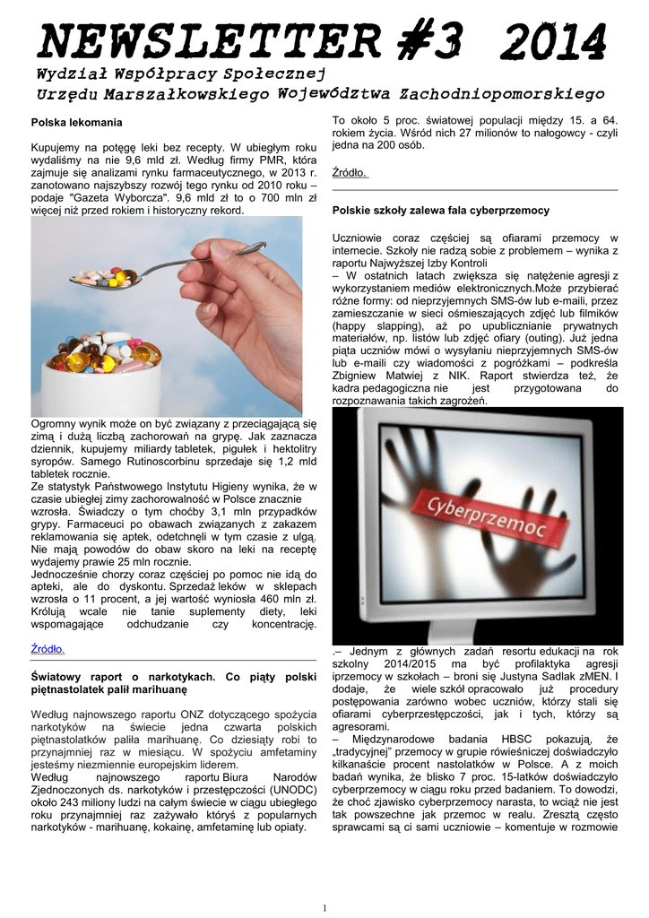To około 5 proc. światowej populacji między 15. a 64. rokiem życia. Wśród nich 27 milionów to nałogowcy - czyli jedna na 200 osób. Polska lekomania Kupujemy na potęgę leki bez recepty. W ubiegłym roku wydaliśmy na nie 9,6 mld zł. Według firmy PMR, która zajmuje się analizami rynku farmaceutycznego, w 2013 r. zanotowano najszybszy rozwój tego rynku od 2010 roku – podaje "Gazeta Wyborcza". 9,6 mld zł to o 700 mln zł więcej niż przed rokiem i historyczny rekord. Źródło. Polskie szkoły zalewa fala cyberprzemocy Uczniowie coraz częściej są ofiarami przemocy w internecie. Szkoły nie radzą sobie z problemem – wynika z raportu Najwyższej Izby Kontroli – W ostatnich latach zwiększa się natężenie agresji z wykorzystaniem mediów elektronicznych.Może przybierać różne formy: od nieprzyjemnych SMS-ów lub e-maili, przez zamieszczanie w sieci ośmieszających zdjęć lub filmików (happy slapping), aż po upublicznianie prywatnych materiałów, np. listów lub zdjęć ofiary (outing). Już jedna piąta uczniów mówi o wysyłaniu nieprzyjemnych SMS-ów lub e-maili czy wiadomości z pogróżkami – podkreśla Zbigniew Matwiej z NIK. Raport stwierdza też, że kadra pedagogiczna nie jest przygotowana do rozpoznawania takich zagrożeń. Ogromny wynik może on być związany z przeciągającą się zimą i dużą liczbą zachorowań na grypę. Jak zaznacza dziennik, kupujemy miliardy tabletek, pigułek i hektolitry syropów. Samego Rutinoscorbinu sprzedaje się 1,2 mld tabletek rocznie. Ze statystyk Państwowego Instytutu Higieny wynika, że w czasie ubiegłej zimy zachorowalność w Polsce znacznie wzrosła. Świadczy o tym choćby 3,1 mln przypadków grypy. Farmaceuci po obawach związanych z zakazem reklamowania się aptek, odetchnęli w tym czasie z ulgą. Nie mają powodów do obaw skoro na leki na receptę wydajemy prawie 25 mln rocznie. Jednocześnie chorzy coraz częściej po pomoc nie idą do apteki, ale do dyskontu. Sprzedaż leków w sklepach wzrosła o 11 procent, a jej wartość wyniosła 460 mln zł. Królują wcale nie tanie suplementy diety, leki wspomagające odchudzanie czy koncentrację. Źródło. .– Jednym z głównych zadań resortu edukacji na rok szkolny 2014/2015 ma być profilaktyka agresji iprzemocy w szkołach – broni się Justyna Sadlak zMEN. I dodaje, że wiele szkół opracowało już procedury postępowania zarówno wobec uczniów, którzy stali się ofiarami cyberprzestępczości, jak i tych, którzy są agresorami. – Międzynarodowe badania HBSC pokazują, że „tradycyjnej” przemocy w grupie rówieśniczej doświadczyło kilkanaście procent nastolatków w Polsce. A z moich badań wynika, że blisko 7 proc. 15-latków doświadczyło cyberprzemocy w ciągu roku przed badaniem. To dowodzi, że choć zjawisko cyberprzemocy narasta, to wciąż nie jest tak powszechne jak przemoc w realu. Zresztą często sprawcami są ci sami uczniowie – komentuje w rozmowie Światowy raport o narkotykach. Co piąty polski piętnastolatek palił marihuanę Według najnowszego raportu ONZ dotyczącego spożycia narkotyków na świecie jedna czwarta polskich piętnastolatków paliła marihuanę. Co dziesiąty robi to przynajmniej raz w miesiącu. W spożyciu amfetaminy jesteśmy niezmiennie europejskim liderem. Według najnowszego raportu Biura Narodów Zjednoczonych ds. narkotyków i przestępczości (UNODC) około 243 miliony ludzi na całym świecie w ciągu ubiegłego roku przynajmniej raz zażywało któryś z popularnych narkotyków - marihuanę, kokainę, amfetaminę lub opiaty. 1 z „Newsweekiem” prof. Jacek Pyżalski z Uniwersytetu im. Adama Mickiewicza w Poznaniu, który od lat analizuje to zjawisko. Ile warte są leki z telewizyjnych reklam Cudowna tabletka na impotencję, na zmęczenie, inna na kłopoty z wątrobą. Wystarczy je łyknąć, by żyć długo? Pytamy dr. Łukasza Łapińskiego z Uniwersytetu Medycznego we Wrocławiu. Większość reklam telewizyjnych dotyczy leków: mężczyźni to impotenci, kobiety cierpią na infekcje intymne, wszyscy mamy kłopoty z wzdęciami, a jak łykniemy pigułkę, dostaniemy jeszcze jedną, żeby nie chciało nam się jeść słodyczy. Żałuję, że nie jestem farmaceutą... Nie ma pan czego żałować, bo coraz gorzej zarabiają (śmiech). Ale kierując się reklamami, musimy dojść do wniosku, że wszyscy jesteśmy chorzy. Patrzę na to inaczej - lansowany jest taki styl życia: cały czas musimy być sprawni, aktywni, świetni w każdej dziedzinie, piękni itd. Proszę zwrócić uwagę, że to pokazuje nam każda reklama - mamy brudne domy, podłogi, toalety. Kupmy więc środki, które to zmienią. Ale też brzydko nam pachnie z ust, mamy niedomyte zęby, kłopoty z seksem - pigułka rozwiąże te kłopoty. A przecież powinniśmy żyć maksymalnie aktywnie, być doskonali. W tym miejscu trzeba podkreślić, że czym innym są leki, czym innym suplementy diety. Źródło. Polski system leczenia narkomanii utknął w latach 80 Społeczny rzecznik praw osób uzależnionych twierdzi, że polski system rehabilitacji osób uzależnionych od narkotyków utknął w latach 80. ub. wieku, gdy dominowało uzależnienie od domowych przetworów z maku. To system oparty na wymuszaniu abstynencji izolacją w ośrodku. Wskazuje on, że 60 proc. środków przeznaczanych przez NFZ na walkę z narkomania trafia na tego typu leczenie, podczas gdy nie ma form pomocy dla osób, które opuszczą ośrodki. Ponadto brakuje poradni, gdzie mogłyby się leczyć osoby, dla których pobyt w zamkniętym ośrodku nie jest odpowiedni. Źródło. Kampania Województwa realizowana przez Wodne Ratunkowe Województwa „Dmuchnij i sprawdź!” Cała rozmowa. Zachodniopomorskiego Ochotnicze Pogotowie Zachodniopomorskiego Marihuana wywołuje paranoję Negatywne odczucia i zmiany percepcji spowodowane paleniem marihuany mogą u niektórych osób prowokować wystąpienie krótkotrwałej paranoi - czytamy w czasopi