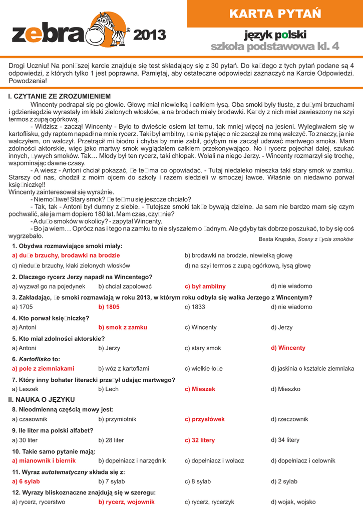 KARTA PYTAŃ ra 2013 szkoła podstawowa kl. 4 Drogi Uczniu! Na poniższej karcie znajduje się test składający się z 30 pytań. Do każdego z tych pytań podane są 4 odpowiedzi, z których tylko 1 jest poprawna. Pamiętaj, aby ostateczne odpowiedzi zaznaczyć na Karcie Odpowiedzi. Powodzenia! I. CZYTANIE ZE ZROZUMIENIEM Wincenty podrapał się po głowie. Głowę miał niewielką i całkiem łysą. Oba smoki były tłuste, z dużymi brzuchami i gdzieniegdzie wyrastały im kłaki zielonych włosków, a na brodach miały brodawki. Każdy z nich miał zawieszony na szyi termos z zupą ogórkową. - Widzisz - zaczął Wincenty - Było to dwieście osiem lat temu, tak mniej więcej na jesieni. Wylegiwałem się w kartoflisku, gdy raptem napadł na mnie rycerz. Taki był ambitny, że nie pytając o nic zaczął ze mną walczyć. To znaczy, ja nie walczyłem, on walczył. Przetrącił mi biodro i chyba by mnie zabił, gdybym nie zaczął udawać martwego smoka. Mam zdolności aktorskie, więc jako martwy smok wyglądałem całkiem przekonywająco. No i rycerz pojechał dalej, szukać innych, żywych smoków. Tak… Młody był ten rycerz, taki chłopak. Wołali na niego Jerzy. - Wincenty rozmarzył się trochę, wspominając dawne czasy. - A wiesz - Antoni chciał pokazać, że też ma co opowiadać. - Tutaj niedaleko mieszka taki stary smok w zamku. Starszy od nas, chodził z moim ojcem do szkoły i razem siedzieli w smoczej ławce. Właśnie on niedawno porwał księżniczkę!! Wincenty zainteresował się wyraźnie. - Niemożliwe! Stary smok? Że też mu się jeszcze chciało? - Tak, tak - Antoni był dumny z siebie. - Tutejsze smoki także bywają dzielne. Ja sam nie bardzo mam się czym pochwalić, ale ja mam dopiero 180 lat. Mam czas, czyż nie? - A dużo smoków w okolicy? - zapytał Wincenty. - Bo ja wiem… Oprócz nas i tego na zamku to nie słyszałem o żadnym. Ale gdyby tak dobrze poszukać, to by się coś wygrzebało. Beata Krupska, Sceny z życia smoków 1. Obydwa rozmawiające smoki miały: a) duże brzuchy, brodawki na brodzie b) brodawki na brodzie, niewielką głowę c) nieduże brzuchy, kłaki zielonych włosków d) na szyi termos z zupą ogórkową, łysą głowę 2. Dlaczego rycerz Jerzy napadł na Wincentego? a) wyzwał go na pojedynek b) chciał zapolować c) był ambitny d) nie wiadomo 3. Zakładając, że smoki rozmawiają w roku 2013, w którym roku odbyła się walka Jerzego z Wincentym? a) 1705 b) 1805 c) 1833 d) nie wiadomo b) smok z zamku c) Wincenty d) Jerzy b) Jerzy c) stary smok d) Wincenty b) wóz z kartoflami c) wielkie łoże d) jaskinia o kształcie ziemniaka c) Mieszek d) Mieszko b) przymiotnik c) przysłówek d) rzeczownik b) 28 liter c) 32 litery d) 34 litery b) dopełniacz i narzędnik c) dopełniacz i wołacz d) dopełniacz i celownik c) 8 sylab d) 2 sylab c) rycerz, rycerzyk d) wojak, wojsko 4. Kto porwał księżniczkę? a) Antoni 5. Kto miał zdolności aktorskie? a) Antoni 6. Kartoflisko to: a) pole z ziemniakami 7. Który inny bohater literacki przeżył udając martwego? a) Leszek b) Lech II. NAUKA O JĘZYKU 8. Nieodmienną częścią mowy jest: a) czasownik 9. Ile liter ma polski alfabet? a) 30 liter 10. Takie samo pytanie mają: a) mianownik i biernik 11. Wyraz autotematyczny składa się z: a) 6 sylab b) 7 sylab 12. Wyrazy bliskoznaczne znajdują się w szeregu: a) rycerz, rycerstwo b) rycerz, wojownik 13. Mieć węża w kieszeni oznacza: a) nie trzymać rąk w kieszeni c) mieć dziurę w kieszeni d) być skąpym b) półki, pułki c) czółka, czułki d) próchno, pruchno b) ożywienie c) porównanie d) uosobienie b) strofy c) wersy d) zwrotki b) zbierać różności 14. Niepoprawnie zapisane są wyrazy w szeregu: a) czółno, czółko III. TEORIA LITERATURY 15. Krzesło biegło to: a) epitet 16. Wiersz nie dzieli się na: a) rymy 17. Fikcyjność dotyczy: a) tylko utworów realistycznych b) tylko utworów fantastycznych c) utworów realistycznych i fantastycznych d) żadnych z nich IV. LEKTURY 18. Co zawierała SKRZYNIA MĘDRCÓW? a) szkło powiększające b) kompas c) trzy małe ząbki d) trzy srebrne monety 19. Kto, zgodnie z książką Dzieci z Bullerbyn, rozdaje w Szwecji prezenty w wieczór wigilijny? a) św. Mikołaj b) elf c) skrzat wigilijny d) krasnoludek wigilijny c) za trzecim d) Charlie go nie zdobył 20. Za którym razem Charlie zdobył Złoty Talon? a) za pierwszym b) za drugim 21. Kto znajdował się w rodzinie Bucket'ów? a) dwie babcie, dwaj dziadkowie, mama, tata i Charlie b) babcia, dwaj dziadkowie, tata i Charlie c) dwie babcie, dwaj dziadkowie, mama i Charlie d) dziadek, dwie babcie, tata, mama i Charlie 22. Jaką pracę wykonywał Pinokio za to, że próbował ukraść winogrona? a) żadną b) zrywał winogrona c) sprzątał obejście d) służył jako pies pilnujący gospodarstwa 23. Gadający Świerszcz powiedział Pinokiowi: a) że niegrzeczni chłopcy będą ukarani b) że Pinokio zamieni się kiedyś w świerszcza c) żeby ugotował sobie jajko d) że chce wyruszyć z pajacykiem w świat 24. Ile zapłaciła kobieta czarownicy za ziarenko, z którego wyrosła Calineczka? a) 12 groszy b) 12 złotych c) 3 grosze d) dostała ziarenko za darmo 25. Jeśli okruch lustra złego czarodzieja trafiał do ludzkiego serca: a) serce przestawało bić, człowiek nikogo nie mógł kochać b) serce stawało się kawałkiem lodu, człowiek nikogo nie mógł kochać, wszyscy byli dla niego obcy, obojętni c) serce pękało, wszyscy byli dla niego obcy, obojętni d) człowiek ten wszystko już widział zmienione i nie mógł dostrzec koło siebie nic dobrego, nic pięknego 26. Stara kaczka, z Brzydkiego kaczątka, podejrzewała, że jajko, z którego długo nie chce się wykluć pisklę jest: a) gęsie b) kacze c) strusie d) indycze 27. Dwie rodziny, z Brzydkiego kaczątka, pokłóciły się na podwórku o: a) głowę węgorza b) głowę węża c) głowę piskorza d) głowę kota c) Tsing pu! d) Tsing pe! 28. Marszałek na polece