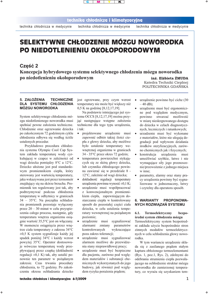 technika chłodnicza w medycynie technika chłodnicza w medycynie technika chłodnicza w medycynie SELEKTYWNE CHŁODZENIE MÓZGU NOWORODKA PO NIEDOTLENIENIU OKOŁOPORODOWYM Część 2 Koncepcja hybrydowego systemu selektywnego chłodzenia mózgu noworodka po niedotlenieniu okołoporodowym inż. Elżbieta ŻMUDA Katedra Techniki Cieplnej POLITECHNIKA GDAŃSKA 5. ZAŁOŻENIA TECHNICZNE DLA SYSTEMU CHŁODZENIA MÓZGU NOWORODKA System selektywnego chłodzenia mózgu niedotlenionego noworodka musi spełniać pewne założenia techniczne. Chłodzenie oraz ogrzewanie dziecka po zakończonym 72 godzinnym cyklu chłodzenia odbywa się według ściśle ustalonych procedur. Przykładowo procedura chłodzenia systemu Olympic Cool Cap System zakłada temperaturę wody cyrkulującej w czapce w zależności od wagi dziecka pomiędzy 8°C a 12°C. Dziecko ułożone jest pod standardowym promiennikiem ciepła, który sterowany jest wartością temperatury, jaka wskazywana jest przez termometr znajdujący się na skórze brzucha. Promiennik ten regulowany jest tak, aby podtrzymywać podczas chłodzenia temperaturę w odbytnicy w granicach 34 – 35°C. Na początku schładzania promiennik pozostaje wyłączony przez 20 – 30 minut w celu przyspieszenia całego procesu, następnie, gdy temperatura wnętrza organizmu osiągnie wartość 35,5°C jest on włączany. W momencie osiągnięcia przez wnętrze ciała temperatury z zakresu 34°C ±0,5 K system sygnalizuje każdy jej spadek poniżej 34°C i każdy wzrost powyżej 35°C. Operator dostosowuje wówczas temperaturę wody przepływającej przez czapkę (dokładność regulacji ±0,1 K) tak, aby ustalić ponownie ten parametr w pożądanym zakresie. Czas trwania procedury chłodzenia, to 72 godziny. Po zakończeniu okresu ochładzania dziecko jest ogrzewane, przy czym wzrost temperatury nie może być większy niż 0,5 K na godzinę [8,12,17,19]. Na podstawie istniejącego już systemu OCCS [8,12,17,19] można przyjąć następujące wstępne założenia techniczne dla tego typu urządzenia, i tak: • projektowane urządzenie musi zapewnić odbiór takiej ilości ciepła z głowy dziecka, aby możliwe było ustalenie temperatury wewnętrznej organizmu w granicach 34 - 35°C przez okres 72 godzin; • temperatura powierzchni stykających się ze skórą głowy dziecka, lub czynnika chłodzącego powinna zawierać się w przedziale 8 12°C, zależnie od wagi dziecka; • dokładność regulacji temperatury urządzenia powinna wynosić ±0,1 K; • urządzenie musi współpracować z konwencjonalnym promiennikiem ciepła, zapewniającym dostarczanie ciepła w kontrolowany sposób do pozostałej części ciała dziecka, w celu ustalenia temperatury wewnętrznej na pożądanym poziomie; • urządzenie musi sygnalizować alarmami zmiany parametrów kontrolowanych wykraczające poza zakres tolerancji; • urządzenie musi sygnalizować alarmem możliwe do przewidzenia stany nieprawidłowej pracy; • urządzenie musi być bezpieczne dla pacjenta, zarówno pod względem materiałów i substancji chemicznych wykorzystanych do jego budowy, jak również pod względem ryzyka porażenia prądem; technika chłodnicza i klimatyzacyjna 6-7/2009 • urządzenie powinno być ciche (30 – 40 dB); • urządzenie musi być ergonomiczne pod względem medycznym, powinno stwarzać możliwość w miarę nieskrępowanego dostępu do dziecka w celach diagnostycznych, leczniczych i ratunkowych; • urzadzenie musi być wykonane z materiałów, które nie ulegają degradacji pod wpływem działania środków sterylizacyjnych, zarówno chemicznych jak i fizycznych; • konstrukcja urządzenia musi umożliwiać szybkie, łatwe i nie wymagające siły jego przenoszenie/przewożenie z jednego miejsca w inne; • parametry, alarmy oraz stany pracy urządzenia powinny być sygnalizowane w jednoznaczny, łatwy i czytelny dla operatora sposób. 6. WARIANTY PROPONOWANYCH ROZWIĄZAŃ SYSTEMU 6.1. Termoelektryczny bezpośredni system chłodzenia mózgu Termoelektryczny system bezpośredni zakłada użycie bezpośrednio stron zimnych modułów termoelektrycznych w celu schłodzenia głowy noworodka. W tym wariancie urządzenie składa się z zasilanego prądem stałym kaptura obłożonego termoelementami (Rys. 1, poz.1, Rys. 2), zdolnymi do odebrania strumienia ciepła pozwalającego na ochłodzenie struktur mózgu noworodka do zamierzonej temperatury, co wyraża się uzyskaniem tem- 1 technika chłodnicza w medycynie technika chłodnicza w medycynie Rys. 1 Schemat blokowy bezpośredniego termoelektrycznego systemu selektywnego chłodzenia mózgu noworodka Rys. 2 Schemat ideowy termoelektrycznego kaptura chłodzącego Rys. 3 Schemat blokowy pośredniego termoelektrycznego systemu selektywnego chłodzenia mózgu noworodka peratury wnętrza ciała (poz.6) mierzonej w odbycie w granicach 34,5°C ±0,5 K. Od strony gorącej termoelementów ciepło odbierane jest w przypadku tej koncepcji przez płyn chłodzący np. wodę, która następnie oddaje to ciepło w konwencjonalnej chłodnicy 2 wentylatorowej (poz.2). Sterowanie urządzeniem odbywa się przy pomocy sterownika elektronicznego, lub komputera (poz.3), dla którego parametrem kontrolowanym jest temperatura mierzona w odbycie (poz.6), a układ sterujący (poz.5) reguluje przepływ prądu przez termoelementy. Możliwe technika chłodnicza w medycynie do zastosowania jest także sterowanie ręczne. Źródłem ciepła potrzebnym do ogrzewania pozostałych części ciała dziecka jest w założeniu konwencjonalny promiennik podczerwieni (poz.4), z wbudowaną funkcją kontroli ogrzewania. Parametrem kontrolowanym w przypadku takiego urządzenia jest temperatura skóry na brzuchu dziecka Termoelektryczny system bezpośredni zakłada bezpośredni kontakt termoelementów z powierzchnią chłodzoną. Wadą takiego rozwiązania jest punktowy odbiór ciepła oraz fakt styku termomodułów bezpośrednio ze skórą, lub środkiem zapewniającym przyle