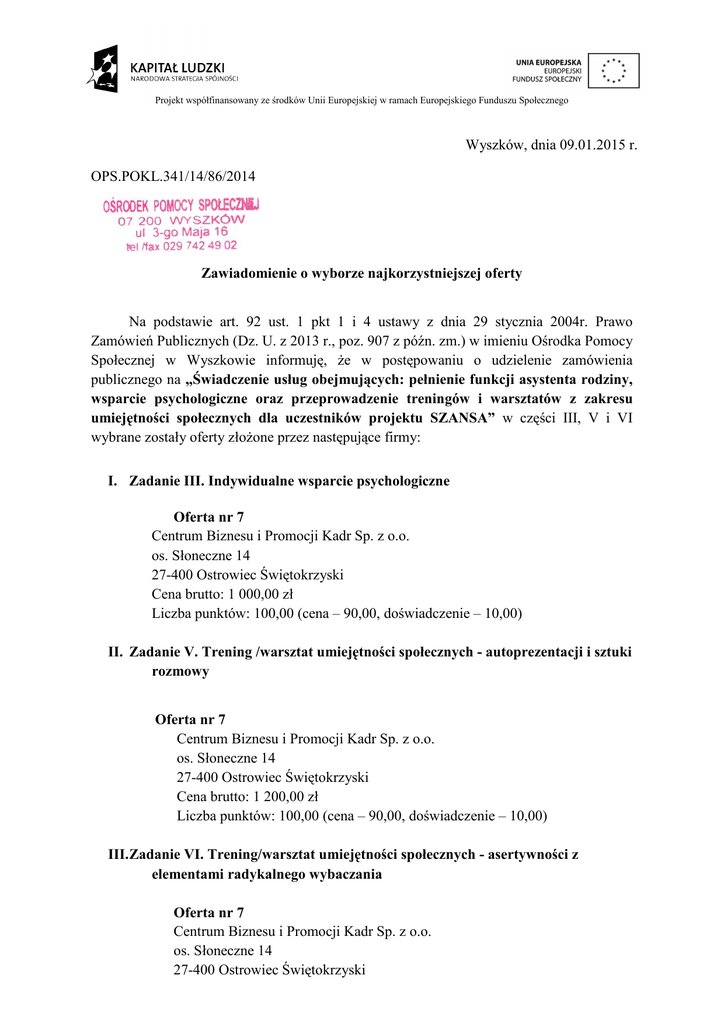 Projekt współfinansowany ze środków Unii Europejskiej w ramach Europejskiego Funduszu Społecznego Wyszków, dnia 09.01.2015 r. OPS.POKL.341/14/86/2014 Zawiadomienie o wyborze najkorzystniejszej oferty Na podstawie art. 92 ust. 1 pkt 1 i 4 ustawy z dnia 29 stycznia 2004r. Prawo Zamówień Publicznych (Dz. U. z 2013 r., poz. 907 z późn. zm.) w imieniu Ośrodka Pomocy Społecznej w Wyszkowie informuję, że w postępowaniu o udzielenie zamówienia publicznego na „Świadczenie usług obejmujących: pełnienie funkcji asystenta rodziny, wsparcie psychologiczne oraz przeprowadzenie treningów i warsztatów z zakresu umiejętności społecznych dla uczestników projektu SZANSA” w części III, V i VI wybrane zostały oferty złożone przez następujące firmy: I. Zadanie III. Indywidualne wsparcie psychologiczne Oferta nr 7 Centrum Biznesu i Promocji Kadr Sp. z o.o. os. Słoneczne 14 27-400 Ostrowiec Świętokrzyski Cena brutto: 1 000,00 zł Liczba punktów: 100,00 (cena – 90,00, doświadczenie – 10,00) II. Zadanie V. Trening /warsztat umiejętności społecznych - autoprezentacji i sztuki rozmowy Oferta nr 7 Centrum Biznesu i Promocji Kadr Sp. z o.o. os. Słoneczne 14 27-400 Ostrowiec Świętokrzyski Cena brutto: 1 200,00 zł Liczba punktów: 100,00 (cena – 90,00, doświadczenie – 10,00) III. Zadanie VI. Trening/warsztat umiejętności społecznych - asertywności z elementami radykalnego wybaczania Oferta nr 7 Centrum Biznesu i Promocji Kadr Sp. z o.o. os. Słoneczne 14 27-400 Ostrowiec Świętokrzyski Projekt współfinansowany ze środków Unii Europejskiej w ramach Europejskiego Funduszu Społecznego Cena brutto: 1 000,00 zł Liczba punktów: 100,00 (cena – 90,00, doświadczenie – 10,00) Uzasadnienie wyboru: Powyższe oferty spełniają wymagania określone w ustawie i w SIWZ oraz mają najniższą cenę spośród ofert niepodlegających odrzuceniu. Wykonawcy, których oferty w postępowaniu o udzielenie zamówienia publicznego na „Świadczenie usług obejmujących: pełnienie funkcji asystenta rodziny, wsparcie psychologiczne oraz przeprowadzenie treningów i warsztatów z zakresu umiejętności społecznych dla uczestników projektu SZANSA” nie podlegały odrzuceniu wraz z przyznaną punktacją: I. Zadanie III. Indywidualne wsparcie psychologiczne 1. Oferta nr 3 CEDR Martin Walczak ul. Kraszewskiego 4 lok. 28 05-840 Brwinów Cena brutto: 2 999,75 zł Liczba punktów: 40,00 (cena – 30,00, doświadczenie – 10,00) 2. Oferta nr 4 Happiness Marlena Chodkowska-Peła ul. Wąska 82 07-200 Wyszków Cena brutto: 1 250,00 zł Liczba punktów: 82,00 (cena – 72,00, doświadczenie – 10,00) 3. Oferta nr 6 Usługi Psychologiczne LOGOS Zbigniew Zatoński ul. Narutowicza 16/18/5, 20-004 Lublin Cena brutto: 1 850,00 zł Liczba punktów: 58,65 (cena – 48,65, doświadczenie – 10,00) 4. Oferta nr 7 Centrum Biznesu i Promocji Kadr Sp. z o.o. os. Słoneczne 14 27-400 Ostrowiec Świętokrzyski Projekt współfinansowany ze środków Unii Europejskiej w ramach Europejskiego Funduszu Społecznego Cena brutto: 1 000,00 zł Liczba punktów: 100,00 (cena – 90,00, doświadczenie – 10,00) 5. Oferta nr 9 STUDIO PROFILAKTYKI SPOŁECZNEJ Adam Rynkiewicz ul. Karmelicka 28/9a 31-128 Kraków Cena brutto: 4 200,00 zł Liczba punktów: 31,43 (cena – 21,43, doświadczenie – 10,00) 6. Oferta nr 10 ILLUSTRO SZKOLENIA DORADZTWO Grzegorz Rippel ul. Cygana 4, 45-131 Opole Cena brutto: 1 560,00 zł Liczba punktów: 62,69 (cena – 57,69, doświadczenie – 5,00) 7. Oferta nr 12 Enere Sp. z o.o. ul. Jagodowa 6 05-230 Kobyłka Cena brutto: 2 183,00 zł Liczba punktów: 51,23 (cena – 41,23, doświadczenie – 10,00) II. Zadanie V. Trening /warsztat umiejętności społecznych - autoprezentacji i sztuki rozmowy 1. Oferta nr 1 Centrum Edukacyjne „Omnibus” ul. Bolesława Chrobrego 8A/23 73-110 Stargard Szczeciński Cena brutto: 2 700,00 zł Liczba punktów: 50,00 (cena – 40,00, doświadczenie – 10,00) 2. Oferta nr 3 CEDR Martin Walczak ul. Kraszewskiego 4 lok. 28 05-840 Brwinów Cena brutto: 2 697,00 zł Liczba punktów: 50,05 (cena – 40,05, doświadczenie – 10,00) 3. Oferta nr 4 Projekt współfinansowany ze środków Unii Europejskiej w ramach Europejskiego Funduszu Społecznego Happiness Marlena Chodkowska-Peła ul. Wąska 82 07-200 Wyszków Cena brutto: 1 500,00 zł Liczba punktów: 82,00 (cena – 72,00, doświadczenie – 10,00) 4. Oferta nr 6 Usługi Psychologiczne LOGOS Zbigniew Zatoński ul. Narutowicza 16/18/5, 20-004 Lublin Cena brutto: 2 460,00 zł Liczba punktów: 53,90 (cena – 43,90, doświadczenie – 10,00) 5. Oferta nr 7 Centrum Biznesu i Promocji Kadr Sp. z o.o. os. Słoneczne 14 27-400 Ostrowiec Świętokrzyski Cena brutto: 1 200,00 zł Liczba punktów: 100,00 (cena – 90,00, doświadczenie – 10,00) 6. Oferta nr 9 STUDIO PROFILAKTYKI SPOŁECZNEJ Adam Rynkiewicz ul. Karmelicka 28/9a 31-128 Kraków Cena brutto: 3 800,00 zł Liczba punktów: 38,42 (cena – 28,42, doświadczenie – 10,00) 7. Oferta nr 10 ILLUSTRO SZKOLENIA DORADZTWO Grzegorz Rippel ul. Cygana 4, 45-131 Opole Cena brutto: 1 872,00 zł Liczba punktów: 62,69 (cena – 57,69, doświadczenie – 5,00) 8. Oferta nr 11 Marek Troc ul. Kazimierzowska 10/3 17-100 Bielsk Podlaski Cena brutto: 2 400,00 zł Projekt współfinansowany ze środków Unii Europejskiej w ramach Europejskiego Funduszu Społecznego Liczba punktów: 55,00 (cena – 45,00, doświadczenie – 10,00) 9. Oferta nr 12 Enere Sp. z o.o. ul. Jagodowa 6 05-230 Kobyłka Cena brutto: 2 619,60 zł Liczba punktów: 51,23 (cena – 41,23, doświadczenie – 10,00) 10. Oferta nr 14 Centrum Edukacji i Rozwoju TUTOR Hanna Szyszkowska Postoliska, ul. Stylowa 48 05-240 Tłuszcz Cena brutto: 1 215,00 zł Liczba punktów: 98,89 (cena – 88,89, doświadczenie – 10,00) 11. Oferta nr 15 Szkolenia, Psychoterapia, Coaching Tomasz Sikora ul. Kredytowa 8/5 40-562 Katowice Cena brutto: 3 300,00 zł Liczba punktów: 42,73 (cena – 32,73, doświadczenie 