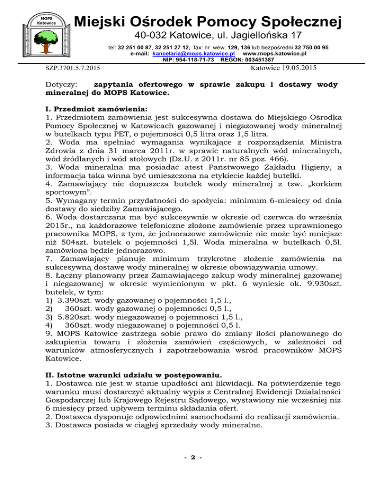 Miejski Ośrodek Pomocy Społecznej 40-032 Katowice, ul. Jagiellońska 17 tel: 32 251 00 87, 32 251 27 12, fax: nr wew. 129, 136 lub bezpośredni 32 750 00 95 e-mail: [email protected] www.mops.katowice.pl NIP: 954-118-71-73 REGON: 003451387 Katowice 19.05.2015 SZP.3701.5.7.2015 Dotyczy: zapytania ofertowego w sprawie zakupu i dostawy wody mineralnej do MOPS Katowice. I. Przedmiot zamówienia: 1. Przedmiotem zamówienia jest sukcesywna dostawa do Miejskiego Ośrodka Pomocy Społecznej w Katowicach gazowanej i niegazowanej wody mineralnej w butelkach typu PET, o pojemności 0,5 litra oraz 1,5 litra. 2. Woda ma spełniać wymagania wynikające z rozporządzenia Ministra Zdrowia z dnia 31 marca 2011r. w sprawie naturalnych wód mineralnych, wód źródlanych i wód stołowych (Dz.U. z 2011r. nr 85 poz. 466). 3. Woda mineralna ma posiadać atest Państwowego Zakładu Higieny, a informacja taka winna być umieszczona na etykiecie każdej butelki. 4. Zamawiający nie dopuszcza butelek wody mineralnej z tzw. „korkiem sportowym”. 5. Wymagany termin przydatności do spożycia: minimum 6-miesięcy od dnia dostawy do siedziby Zamawiającego. 6. Woda dostarczana ma być sukcesywnie w okresie od czerwca do września 2015r., na każdorazowe telefoniczne złożone zamówienie przez uprawnionego pracownika MOPS, z tym, że jednorazowe zamówienie nie może być mniejsze niż 504szt. butelek o pojemności 1,5l. Woda mineralna w butelkach 0,5l. zamówiona będzie jednorazowo. 7. Zamawiający planuje minimum trzykrotne złożenie zamówienia na sukcesywną dostawę wody mineralnej w okresie obowiązywania umowy. 8. Łączny planowany przez Zamawiającego zakup wody mineralnej gazowanej i niegazowanej w okresie wymienionym w pkt. 6 wyniesie ok. 9.930szt. butelek, w tym: 1) 3.390szt. wody gazowanej o pojemności 1,5 l., 2) 360szt. wody gazowanej o pojemności 0,5 l., 3) 5.820szt. wody niegazowanej o pojemności 1,5 l., 4) 360szt. wody niegazowanej o pojemności 0,5 l. 9. MOPS Katowice zastrzega sobie prawo do zmiany ilości planowanego do zakupienia towaru i złożenia zamówień częściowych, w zależności od warunków atmosferycznych i zapotrzebowania wśród pracowników MOPS Katowice. II. Istotne warunki udziału w postępowaniu. 1. Dostawca nie jest w stanie upadłości ani likwidacji. Na potwierdzenie tego warunku musi dostarczyć aktualny wypis z Centralnej Ewidencji Działalności Gospodarczej lub Krajowego Rejestru Sądowego, wystawiony nie wcześniej niż 6 miesięcy przed upływem terminu składania ofert. 2. Dostawca dysponuje odpowiednimi samochodami do realizacji zamówienia. 3. Dostawca posiada w ciągłej sprzedaży wody mineralne. - 2 - III. Istotne warunki realizacji zamówienia. 1. Koszt każdorazowej dostawy zamawianego towaru zostanie pokryty przez Dostawcę. IV. Do obowiązków Dostawcy będzie należało: 1. Dostawa, wniesienie i złożenie wody we wskazanym przez Zamawiającego miejscu, najpóźniej w dniu następnym po złożeniu zamówienia. 2. Miejsce dostawy wody mineralnej: MOPS Katowice, ul. Jagiellońska 17, przyziemie. 3. W przypadku stwierdzenia, że termin przydatności do spożycia dostarczonej wody mineralnej jest krótszy niż 6-miesięcy, Dostawca na własny koszt wymieni wodę mineralną na inną, spełniającą wymagania Zamawiającego. III. Miejsce, termin oraz sposób składania ofert. Jeżeli jesteście Państwo zainteresowani realizacją zamówienia prosimy przesłać do dnia 25 maja 2015r. na adres: [email protected] uzupełnioną - stanowiącą Załącznik nr 1 do niniejszego zapytania - ofertę ilościowo-cenową – brutto wraz z załączeniem aktualnego wypisu z Centralnej Ewidencji Działalności Gospodarczej lub Krajowego Rejestru Sądowego, o których mowa w pkt. II ppkt 1 zapytania. IV. Kryteria wyboru oferty. 1. Jedynym kryterium wyboru oferty będzie najniższa cena sumy oferty cenowej. 2. Oferta stanowi Załącznik nr 1 do niniejszego zapytania ofertowego. V. Informacje dodatkowe. 1. MOPS zastrzega sobie prawo do niedokonania wyboru, szczególnie jeśli przedstawione oferty nie będą spełniały oczekiwań merytorycznych lub możliwości finansowych określonych przez MOPS Katowice. 2. Cenę oferty należy podać w złotych polskich, cyfrowo i słownie wraz ze wszystkimi składnikami wpływającymi na ostateczną cenę, uwzględniając podatek. 3. Realizacja zlecenia wymagać będzie pisemnej umowy pomiędzy Miejskim Ośrodkiem Pomocy Społecznej w Katowicach a Dostawcą (projekt umowy stanowi Załącznik Nr 2). 4. Przedstawiając ofertę, Dostawca wyraża zgodę, aby płatność za każdą dostawę dokonana została przelewem na konto Dostawcy za dostarczony towar po przedstawieniu faktury VAT, w terminie 14-dni od daty dostarczenia zamówionego towaru. 5. Ceny podane w ofercie są cenami stałymi w okresie obowiązywania umowy i nie będą podlegać rewaloryzacji. 6. Informację o wyborze najkorzystniejszej oferty lub unieważnieniu postępowania, Zamawiający zamieści na stronie internetowej MOPS www.mops.katowice.pl. 7. Osoba do kontaktu w sprawie oferty: P. Beata Roszczenko – Dział Obsługi Administracyjnej MOPS tel. 32/416-22-59. Kierownik Działu Obsługi Administracyjnej mgr inż. Sebastian Holewik