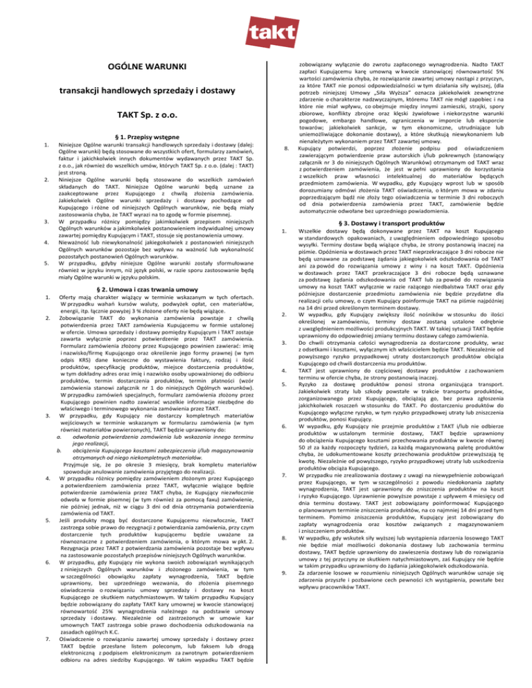 OGÓLNE WARUNKI transakcji handlowych sprzedaży i dostawy TAKT Sp. z o.o. § 1. Przepisy wstępne 1. 2. 3. 4. 5. Niniejsze Ogólne warunki transakcji handlowych sprzedaży i dostawy (dalej: Ogólne warunki) będą stosowane do wszystkich ofert, formularzy zamówień, faktur i jakichkolwiek innych dokumentów wydawanych przez TAKT Sp. z o.o., jak również do wszelkich umów, których TAKT Sp. z o.o. (dalej : TAKT) jest stroną. Niniejsze Ogólne warunki będą stosowane do wszelkich zamówień składanych do TAKT. Niniejsze Ogólne warunki będą uznane za zaakceptowane przez Kupującego z chwilą złożenia zamówienia. Jakiekolwiek Ogólne warunki sprzedaży i dostawy pochodzące od Kupującego i różne od niniejszych Ogólnych warunków, nie będą miały zastosowania chyba, że TAKT wyrazi na to zgodę w formie pisemnej. W przypadku różnicy pomiędzy jakimkolwiek przepisem niniejszych Ogólnych warunków a jakimkolwiek postanowieniem indywidualnej umowy zawartej pomiędzy Kupującym i TAKT, stosuje się postanowienia umowy. Nieważność lub niewykonalność jakiegokolwiek z postanowień niniejszych Ogólnych warunków pozostaje bez wpływu na ważność lub wykonalność pozostałych postanowień Ogólnych warunków. W przypadku, gdyby niniejsze Ogólne warunki zostały sformułowane również w języku innym, niż język polski, w razie sporu zastosowanie będą miały Ogólne warunki w języku polskim. 8. § 3. Dostawy i transport produktów 1. § 2. Umowa i czas trwania umowy 1. 2. 3. 4. 5. 6. 7. Oferty mają charakter wiążący w terminie wskazanym w tych ofertach. W przypadku wahań kursów waluty, podwyżek opłat, cen materiałów, energii, itp. łącznie powyżej 3 % złożone oferty nie będą wiążące. Zobowiązanie TAKT do wykonania zamówienia powstaje z chwilą potwierdzenia przez TAKT zamówienia Kupującemu w formie ustalonej w ofercie. Umowa sprzedaży i dostawy pomiędzy Kupującym i TAKT zostaje zawarta wyłącznie poprzez potwierdzenie przez TAKT zamówienia. Formularz zamówienia złożony przez Kupującego powinien zawierać: imię i nazwisko/firmę Kupującego oraz określenie jego formy prawnej (w tym odpis KRS) dane konieczne do wystawienia faktury, rodzaj i ilość produktów, specyfikację produktów, miejsce dostarczenia produktów, w tym dokładny adres oraz imię i nazwisko osoby upoważnionej do odbioru produktów, termin dostarczenia produktów, termin płatności (wzór zamówienia stanowi załącznik nr 1 do niniejszych Ogólnych warunków). W przypadku zamówień specjalnych, formularz zamówienia złożony przez Kupującego powinien nadto zawierać wszelkie informacje niezbędne do właściwego i terminowego wykonania zamówienia przez TAKT. W przypadku, gdy Kupujący nie dostarczy kompletnych materiałów wejściowych w terminie wskazanym w formularzu zamówienia (w tym również materiałów powierzonych), TAKT będzie uprawniony do: a. odwołania potwierdzenia zamówienia lub wskazania innego terminu jego realizacji, b. obciążenia Kupującego kosztami zabezpieczenia i/lub magazynowania otrzymanych od niego niekompletnych materiałów. Przyjmuje się, że po okresie 3 miesięcy, brak kompletu materiałów spowoduje anulowanie zamówienia przyjętego do realizacji. W przypadku różnicy pomiędzy zamówieniem złożonym przez Kupującego a potwierdzeniem zamówienia przez TAKT, wyłącznie wiążące będzie potwierdzenie zamówienia przez TAKT chyba, że Kupujący niezwłocznie odwoła w formie pisemnej (w tym również za pomocą faxu) zamówienie, nie później jednak, niż w ciągu 3 dni od dnia otrzymania potwierdzenia zamówienia od TAKT. Jeśli produkty mogą być dostarczone Kupującemu niezwłocznie, TAKT zastrzega sobie prawo do rezygnacji z potwierdzania zamówienia, przy czym dostarczenie tych produktów kupującemu będzie uważane za równoznaczne z potwierdzeniem zamówienia, o którym mowa w pkt. 2. Rezygnacja przez TAKT z potwierdzania zamówienia pozostaje bez wpływu na zastosowanie pozostałych przepisów niniejszych Ogólnych warunków. W przypadku, gdy Kupujący nie wykona swoich zobowiązań wynikających z niniejszych Ogólnych warunków i złożonego zamówienia, w tym w szczególności obowiązku zapłaty wynagrodzenia, TAKT będzie uprawniony, bez uprzedniego wezwania, do złożenia pisemnego oświadczenia o rozwiązaniu umowy sprzedaży i dostawy na koszt Kupującego ze skutkiem natychmiastowym. W takim przypadku Kupujący będzie zobowiązany do zapłaty TAKT kary umownej w kwocie stanowiącej równowartość 25% wynagrodzenia należnego na podstawie umowy sprzedaży i dostawy. Niezależnie od zastrzeżonych w umowie kar umownych TAKT zastrzega sobie prawo dochodzenia odszkodowania na zasadach ogólnych K.C. Oświadczenie o rozwiązaniu zawartej umowy sprzedaży i dostawy przez TAKT będzie przesłane listem poleconym, lub faksem lub drogą elektroniczną z podpisem elektronicznym za zwrotnym potwierdzeniem odbioru na adres siedziby Kupującego. W takim wypadku TAKT będzie zobowiązany wyłącznie do zwrotu zapłaconego wynagrodzenia. Nadto TAKT zapłaci Kupującemu karę umowną w kwocie stanowiącej równowartość 5% wartości zamówienia chyba, że rozwiązanie zawartej umowy nastąpi z przyczyn, za które TAKT nie ponosi odpowiedzialności w tym działania siły wyższej, (dla potrzeb niniejszej Umowy „Siła Wyższa” oznacza jakiekolwiek zewnętrzne zdarzenie o charakterze nadzwyczajnym, któremu TAKT nie mógł zapobiec i na które nie miał wpływu, co obejmuje między innymi zamieszki, strajki, spory zbiorowe, konflikty zbrojne oraz klęski żywiołowe i niekorzystne warunki pogodowe, embargo handlowe, ograniczenia w imporcie lub eksporcie towarów; jakiekolwiek sankcje, w tym ekonomiczne, utrudniające lub uniemożliwiające dokonanie dostawy), a które skutkują niewykonaniem lub nienależytym wykonaniem przez TAKT zawartej umowy. Kupujący potwierdzi, poprzez złożenie podpisu pod oświadczeni