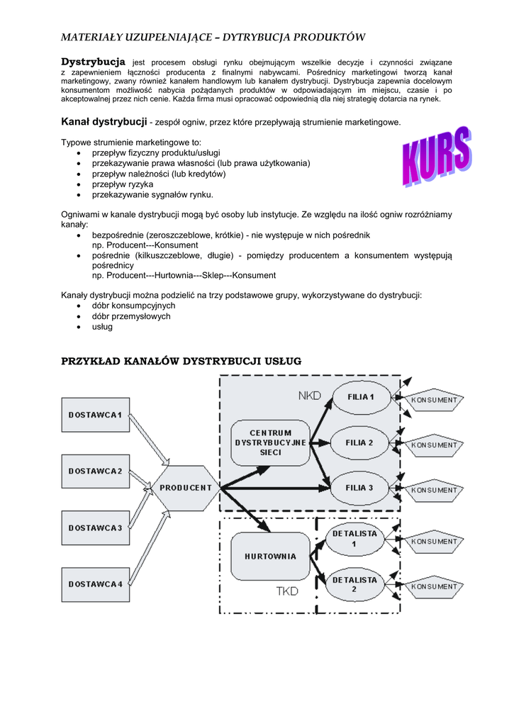 MATERIAŁY UZUPEŁNIAJĄCE – DYTRYBUCJA PRODUKTÓW Dystrybucja jest procesem obsługi rynku obejmującym wszelkie decyzje i czynności związane z zapewnieniem łączności producenta z finalnymi nabywcami. Pośrednicy marketingowi tworzą kanał marketingowy, zwany również kanałem handlowym lub kanałem dystrybucji. Dystrybucja zapewnia docelowym konsumentom możliwość nabycia pożądanych produktów w odpowiadającym im miejscu, czasie i po akceptowalnej przez nich cenie. Każda firma musi opracować odpowiednią dla niej strategię dotarcia na rynek. Kanał dystrybucji - zespół ogniw, przez które przepływają strumienie marketingowe. Typowe strumienie marketingowe to: przepływ fizyczny produktu/usługi przekazywanie prawa własności (lub prawa użytkowania) przepływ należności (lub kredytów) przepływ ryzyka przekazywanie sygnałów rynku. Ogniwami w kanale dystrybucji mogą być osoby lub instytucje. Ze względu na ilość ogniw rozróżniamy kanały: bezpośrednie (zeroszczeblowe, krótkie) - nie występuje w nich pośrednik np. Producent---Konsument pośrednie (kilkuszczeblowe, długie) - pomiędzy producentem a konsumentem występują pośrednicy np. Producent---Hurtownia---Sklep---Konsument Kanały dystrybucji można podzielić na trzy podstawowe grupy, wykorzystywane do dystrybucji: dóbr konsumpcyjnych dóbr przemysłowych usług PRZYKŁAD KANAŁÓW DYSTRYBUCJI USŁUG Związek pomiędzy długością kanału dystrybucji a możliwą do osiągnięcia wielkością rynku PRZYKŁADOWA DYSTRYBUCJA USŁUG BANKOWYCH Objaśnienia: Home banking – rozwiązanie, które umożliwia obsługę rachunków bankowych bez konieczności wychodzenia z domu. Obsługa rachunku bankowego odbywa się przy użyciu publicznej sieci telefonicznej, telefonii komórkowej lub innego łącza dostępowego oraz komputera wyposażonego w odpowiednie oprogramowanie. Bezpieczeństwo systemu zapewniają m.in. generowane hasła, a transmitowane dane są kodowane. Wadą home bankingu jest to, że dostęp do konta jest możliwy tylko z komputera, na którym jest zainstalowany program. Direct banking - to dosłownie “bankowość bezpośrednia”, inaczej “home banking”, albo “bankowość elektroniczna”. ZAGIĄĆ I WKLEIĆ DO ZESZYTU
