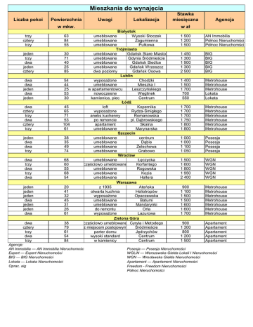 Mieszkania do wynajęcia Liczba pokoi Powierzchnia Uwagi Lokalizacja 63 84 55 jeden trzy dwa jeden cztery 30 71 40 25 85 dwa dwa jeden dwa jeden 54 44 25 53 30 dwa cztery trzy dwa cztery trzy 45 65 71 53 104 61 jeden dwa dwa trzy 38 35 49 74 dwa trzy dwa trzy dwa 68 60 55 68 54 jeden jeden jeden dwa jeden jeden dwa 20 41 32 45 31 26 61 dwa cztery trzy dwa trzy 38 79 61 54 84 Agencja w zł w mkw. trzy cztery trzy Stawka miesięczna Białystok umeblowane Wysoki Stoczek umeblowane Zagumienna umeblowane Pułkowa Trójmiasto umeblowane Gdańsk Stare Miasto umeblowane Gdynia Śródmieście umeblowane Gdańsk Siedlce umeblowane Gdańsk Wrzeszcz dwa poziomy Gdańsk Osowa Lublin wyposażone Chodźki umeblowane Mieszka I w apartamentowcu Leszczyńskiego nowoczesne Węglinek kamienica, piec Centrum Łódź loft Kopernika wyposażone Rydza-Śmigłego aneks kuchenny Romanowska po remoncie pl. Dąbrowskiego apartament Skalna umeblowane Marynarska Szczecin umeblowane centrum umeblowane Dąbie umeblowane Żelechowa umeblowane Grabowo Wrocław umeblowane Łęczycka częściowo umeblowane Korfantego umeblowane Rogowska umeblowane Kozia umeblowane Hallera Warszawa z 1935 Ateńska otwarta kuchnia Heliotropów wyposażone Opaczewska umeblowane Batumi umeblowane Mandarynki do remontu Orla wyposażone Lazurowa Zielona Góra częściowo umeblowane Cyryla i Metodego z miejscem postojowym Śródmieście parter domu Jędrzychów wysoki standard Centrum w kamienicy Centrum Agencje: AN Immobilia — AN Immobilia Nieruchomości Expert — Expert Nieruchomości BIG — BIG Nieruchomości Lokata — Lokata Nieruchomości Oprac. aig 1 500 1 200 1 500 AN Immobilia Północ Nieruchomści Północ Nieruchomści 1 450 1 300 1 900 1 300 2 500 BIG BIG BIG BIG BIG 1 400 1 500 1 700 700 550 Metrohouse Metrohouse Metrohouse Lokata Lokata 1 700 1 700 1 700 1 750 1 800 1 800 Metrohouse Metrohouse Metrohouse Metrohouse Metrohouse Metrohouse 1 000 1 000 1 100 1 050 Posesja Posesja Posesja Posesja 1 500 1 600 1 800 1 950 2 400 WGN WGN WGN WGN WGN 900 1 100 1 500 1 500 1 600 1 600 1 700 Metrohouse Metrohouse Metrohouse Metrohouse Metrohouse Metrohouse Metrohouse 900 1 300 800 1 200 1 500 Apartament Apartament Apartament Apartament Apartament Posesja — Posesja Nieruchomości WGLiN — Warszawska Giełda Lokali I Nieruchomości WGN — Wrocławska Giełda Nieruchomości Apartament — Apartament Nieruchomości Freedom - Freedom Nieruchomości Północ Nieruchomości