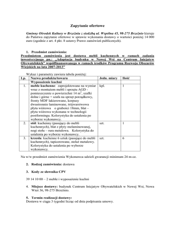 Zapytanie ofertowe Gminny Ośrodek Kultury w Brzeźniu z siedzibą ul. Wspólna 45, 98-275 Brzeźnio kieruje do Państwa zapytanie ofertowe w sprawie wykonania dostawy o wartości poniŜej 14 000 euro (zgodnie z art. 4 pkt. 8 ustawy Prawo zamówień publicznych). 1. Przedmiot zamówienia: Przedmiotem zamówienia jest dostawa mebli kuchennych w ramach zadania inwestycyjnego pn.: „Adaptacja budynku w Nowej Wsi na Centrum Inicjatyw Obywatelskich” współfinansowanego w ramach środków Programu Rozwoju Obszarów Wiejskich na lata 2007-2013” Wykaz i parametry zawiera tabela poniŜej: Lp. Nazwa produktu/towaru WyposaŜenie kuchni 1. meble kuchenne: zaprojektowane na wymiar wraz z montaŜem mebli i sprzętu AGD pomieszczenie o powierzchni 14 m2, szafki dolne i górne + szafa na sprzęt porządkowy, fronty MDF lakierowane, korpusy dwustronnie laminowane, trójwarstwowa płyta wiórowa o grubości 18mm, blat – płyta wiórowa wykonana w technologii postformingu. Kolorystyka do ustalenia po wyborze wykonawcy. 2. stół: kuchenny (pasujący do mebli kuchennych), blat z płyty melaminowanej, nogi stołu – rura metalowa. Kolorystyka do ustalenia po wyborze wykonawcy. 3. krzesła: kuchenne 6 sztuk (pasujące do mebli kuchennych), tapicerowane, stelaŜ metalowy. Kolorystyka do ustalenia po wyborze wykonawcy. Jedn. miary Ilość kpl. 1 szt. 1 szt. 6 Na w/w przedmiot zamówienia Wykonawca udzieli gwarancji minimum 24 m-ce. 2. Rodzaj zamówienia: dostawa 3. Kody ze słownika CPV 39 14 10 00 – 2 meble i wyposaŜenie kuchni 4. Miejsce dostawy: budynek Centrum Inicjatyw Obywatelskich w Nowej Wsi, Nowa Wieś 36, 98-275 Brzeźnio. 5. Termin realizacji dostawy: Dostawa w ciągu 3 tygodni licząc od dnia podpisania umowy. 6. Warunki płatności: Przelew na rachunek bankowy dostawcy wskazany w fakturze w terminie do 30 dni od daty otrzymania prawidłowo wystawionej faktury. 7. Kryteria oceny ofert Przy wyborze najkorzystniejszej oferty Zamawiający będzie się kierował kryterium: Cena – 100% 8. Informacje dodatkowe: 1) Wykonawca udziela gwarancji ………………………………………….. 2) Dostawca w formularzu ofertowym określi cenę jednostkową brutto i cenę brutto ogółem za całość zamówienia. 3) Zamawiający wybierze ofertę cenową dostawcy odpowiadającą wszystkim wymogom postawionym przez niego dla prawidłowej realizacji zamówienia i o najniŜszej cenie brutto za całość dostawy. 4) W sprawach dotyczących zapytania ofertowego informacji udziela GraŜyna Dziedzic w dni robocze od poniedziałku do piątku w godz. 7:30 – 15.30, tel. (43) 820-31-87, Pytania moŜna kierować równieŜ pisemnie na adres: Gminny Ośrodek Kultury w Brzeźniu, ul. Wspólna 45, 98-275 Brzeźnio lub e-mailem: [email protected] Ofertę cenową (formularz ofertowy) naleŜy złoŜyć w Sekretariacie Urzędu Gminy w Brzeźniu, ul. Wspólna 44, 98-275 Brzeźnio, I piętro, pok. 17 w formie pisemnej, w zamkniętej kopercie oznaczonej danymi dostawcy (pieczęć firmowa) oraz napisem: dostawa mebli kuchennych w ramach zadania inwestycyjnego pn.: „Adaptacja budynku w Nowej Wsi na Centrum Inicjatyw Obywatelskich” współfinansowanego w ramach środków Programu Rozwoju Obszarów Wiejskich na lata 2007-2013” 5) Termin składania ofert: do dnia 10.09.2010r. godz. 15.00 (piątek) 6) Oferta cenowa złoŜona po terminie składania ofert podanym powyŜej nie będzie brana pod uwagę przy wyborze oferty najkorzystniejszej. 7) Dostawca moŜe wprowadzić zmiany lub wycofać złoŜoną ofertę cenową przed upływem terminu składania ofert. 8) Z dostawcą, którego oferta cenowa zostanie uznana za najkorzystniejszą w terminie do 5 dni od daty powiadomienia o wyborze oferty zostanie podpisana umowa. 9) Termin związania ofertą cenową wynosi 15 dni od dnia otwarcia ofert przez Zamawiającego. 10) PowyŜsze zapytanie ofertowe wraz z formularzem ofertowym zostało zamieszczone na stronie internetowej: www.brzeznio.finn.pl 11) W sprawach związanych z zapytaniem ofertowym dopuszcza się porozumiewanie drogą: - pisemną, telefoniczną lub faxem – nr (43) 820-31-87. W przypadku korzystania z innych niŜ pisemna form porozumiewania, Strony mogą Ŝądać potwierdzenia otrzymania informacji bądź dokumentu. 12) Rozstrzygniecie postępowania i zlecenie realizacji zamówienia O wynikach postępowania jego uczestnicy zostaną poinformowani drogą faxową lub e-mailową w ciągu dwóch dni od dnia rozstrzygnięcia, następnie w ciągu 5 dni od przesłania informacji o wyborze oferty najkorzystniejszej zostanie podpisana umowa z wybranym Wykonawcom. 14) Załączniki: - formularz ofertowy Brzeźnio, dn. 03.08.2010r. …………………………………… (podpis Kierownika Zamawiającego) Załącznik nr 1 do zapytania cenowego FORMULARZ OFERTOWY dla zamówień o wartości poniŜej 14 000 euro (zgodnie z art. 4 pkt. 8 ustawy Prawo zamówień publicznych) Dane dotyczące Dostawcy : Nazwa .................................................................................................................................... Siedziba ................................................................................................................................. Nr telefonu ............................................................................................................................. Fax……………………………………………………………………………………………………. Nr NIP .................................................................................................................................... Nr REGON ............................................................................................................................. Nazwa banku i numer rachunku bankowego ……………………………………………………… ………………………………………………………………………………………………………….. e-mail …