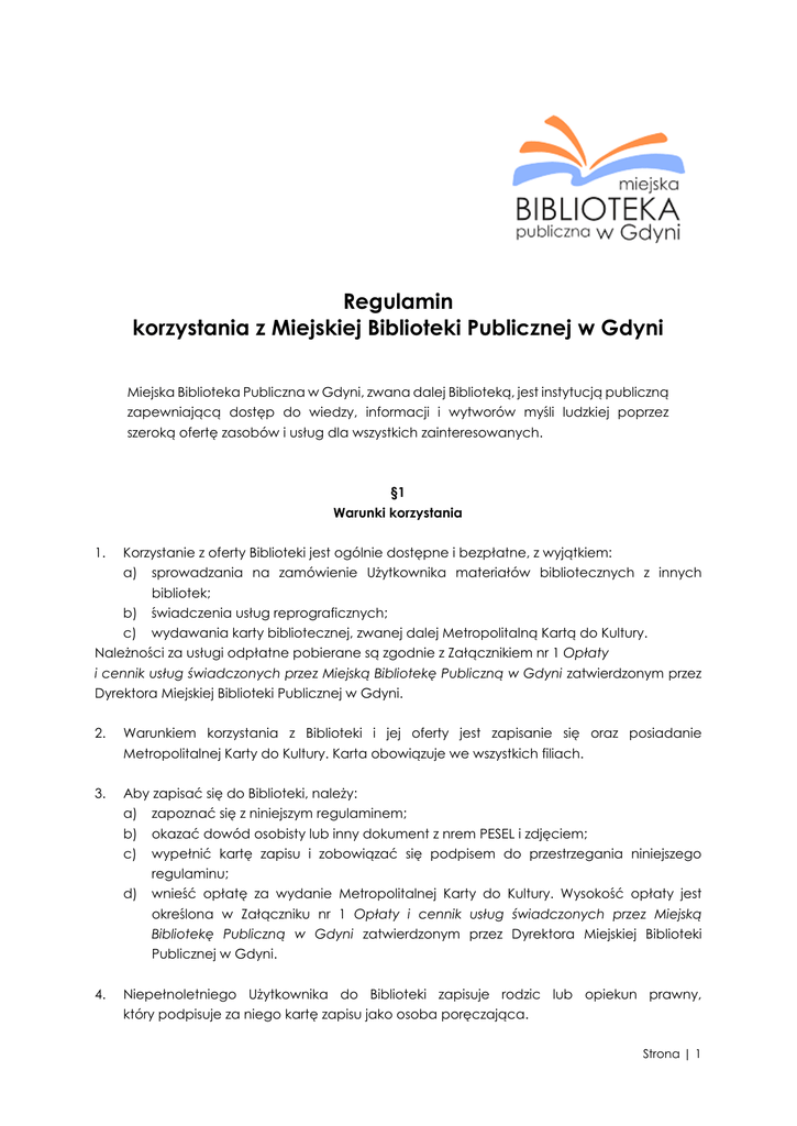 Regulamin korzystania z Miejskiej Biblioteki Publicznej w Gdyni Miejska Biblioteka Publiczna w Gdyni, zwana dalej Biblioteką, jest instytucją publiczną zapewniającą dostęp do wiedzy, informacji i wytworów myśli ludzkiej poprzez szeroką ofertę zasobów i usług dla wszystkich zainteresowanych. §1 Warunki korzystania 1. Korzystanie z oferty Biblioteki jest ogólnie dostępne i bezpłatne, z wyjątkiem: a) sprowadzania na zamówienie Użytkownika materiałów bibliotecznych z innych bibliotek; b) świadczenia usług reprograficznych; c) wydawania karty bibliotecznej, zwanej dalej Metropolitalną Kartą do Kultury. Należności za usługi odpłatne pobierane są zgodnie z Załącznikiem nr 1 Opłaty i cennik usług świadczonych przez Miejską Bibliotekę Publiczną w Gdyni zatwierdzonym przez Dyrektora Miejskiej Biblioteki Publicznej w Gdyni. 2. Warunkiem korzystania z Biblioteki i jej oferty jest zapisanie się oraz posiadanie Metropolitalnej Karty do Kultury. Karta obowiązuje we wszystkich filiach. 3. Aby zapisać się do Biblioteki, należy: a) zapoznać się z niniejszym regulaminem; b) okazać dowód osobisty lub inny dokument z nrem PESEL i zdjęciem; c) wypełnić kartę zapisu i zobowiązać się podpisem do przestrzegania niniejszego regulaminu; d) wnieść opłatę za wydanie Metropolitalnej Karty do Kultury. Wysokość opłaty jest określona w Załączniku nr 1 Opłaty i cennik usług świadczonych przez Miejską Bibliotekę Publiczną w Gdyni zatwierdzonym przez Dyrektora Miejskiej Biblioteki Publicznej w Gdyni. 4. Niepełnoletniego Użytkownika do Biblioteki zapisuje rodzic lub opiekun prawny, który podpisuje za niego kartę zapisu jako osoba poręczająca. Strona | 1 5. Użytkownicy nieposiadający polskiego obywatelstwa zobowiązani są przedstawić ważny dokument ze zdjęciem. 6. Podanie danych osobowych jest dobrowolne, jednak niezbędne do zapisania się do Biblioteki i korzystania z jej oferty. Podane dane osobowe będą podlegały rejestracji w bibliotecznym systemie komputerowym oraz przetwarzaniu w celach statystycznych, korespondencyjnych i windykacyjnych. Użytkownikowi przysługuje prawo wglądu do danych osobowych oraz ich poprawienia na warunkach określonych w Ustawie z dnia 29 sierpnia 1997 r. o ochronie danych osobowych (tekst jedn.: Dz.U. 2014 poz. 1182). Użytkownik rezygnujący z usług Biblioteki ma prawo zażądać usunięcia swoich danych osobowych z ewidencji Czytelników, a Biblioteka ma obowiązek usunąć te dane pod warunkiem, że Użytkownik zwrócił wszystkie wypożyczone materiały i nie ma żadnych innych zobowiązań wobec Biblioteki. 7. Jeśli Użytkownik ma uregulowane wszystkie zobowiązania wobec Biblioteki, a nie korzysta z jej usług przez okres 3 lat, jego dane zostaną trwale usunięte z bazy Czytelników. Aby ponownie korzystać z usług Biblioteki, Użytkownik musi dokonać powtórnego zapisu. 8. Dane Użytkownika podlegają ochronie zgodnie z Ustawą z dnia 29 sierpnia 1997 r. o ochronie danych osobowych (tekst jedn.: Dz.U. 2014 poz. 1182). 9. Użytkownik Biblioteki w przypadku jakiejkolwiek zmiany danych osobowych zobowiązany jest do każdorazowej ich aktualizacji.. 10. Metropolitalna Karta do Kultury ważna jest jedynie w danym roku kalendarzowym. Bezpłatnego przedłużenia ważności karty wraz z aktualizacją danych osobowych można dokonać w dowolnej filii. 11. O zagubieniu Metropolitalnej Karty do Kultury należy bezzwłocznie poinformować Bibliotekę (dowolną filię). Szkody powstałe w wyniku niezgłoszenia zagubionej karty obciążają jej Właściciela. Koszt wydania nowej karty jest określony w Załączniku nr 1 Opłaty i cennik usług świadczonych przez Miejską Bibliotekę Publiczną w Gdyni zatwierdzonym przez Dyrektora Miejskiej Biblioteki Publicznej w Gdyni. 12. Biblioteka nie ponosi odpowiedzialności za konsekwencje wynikłe z posługiwania się Metropolitalną Kartą do Kultury przez osoby trzecie. §2 Korzystanie ze zbiorów i usług 1. Prawo do korzystania z Biblioteki i jej oferty uwarunkowane jest okazaniem Metropolitalnej Karty do Kultury. Strona | 2 2. Użytkownik ma prawo do bezpłatnego korzystania ze zbiorów i następujących usług Biblioteki: a) wypożyczania zbiorów; b) korzystania ze zbiorów na miejscu; c) korzystania ze stanowisk komputerowych, Internetu oraz innego sprzętu przeznaczonego dla Użytkowników; d) pomocy bibliotekarzy przy korzystaniu ze zbiorów Biblioteki; e) informacji bibliotecznej, bibliograficznej, rzeczowej i innej; f) zgłaszania zapotrzebowania na poszukiwane książki i inne zbiory, które Biblioteka w miarę możliwości będzie się starała realizować przy ich zakupie; g) udziału w spotkaniach i wydarzeniach kulturalno-edukacyjnych. 3. Użytkownik korzystający ze zbiorów Biblioteki zobowiązany jest do przestrzegania zasad określonych w Ustawie o prawie autorskim i prawach pokrewnych z dnia 4 lutego 1994 r. (tekst jedn.: Dz.U. 2016 poz. 666). 4. Zbiory Miejskiej Biblioteki Publicznej w Gdyni są dobrem użyteczności publicznej i wymagają poszanowania. Wynoszenie ich bez dopełnienia formalności poza teren Biblioteki lub niszczenie jest zabronione i podlega sankcjom. 5. Użytkownik przed wypożyczeniem materiałów bibliotecznych powinien zwrócić uwagę na ich stan, a zauważone uszkodzenia zgłosić bibliotekarzowi. Za braki i uszkodzenia stwierdzone przy zwrocie, które nie zostały uprzednio zgłoszone, odpowiada Użytkownik dokonujący zwrotu. 6. Użytkownik może wypożyczyć jednocześnie z każdej filii Miejskiej Biblioteki Publicznej w Gdyni 4 materiały biblioteczne, w tym jedną grę planszową. Łączna liczba wypożyczonych materiałów nie może przekraczać 12 sztuk we wszystkich filiach. 7. Książki, audiobooki oraz inne multimedia można wypożyczyć na okres nie dłuższy niż 30 dni kalendarzowych, a gry planszowe na okres do 7 dni kalendarzowych. 8. Na prośbę Użytkownika jest możliwe przedłużenie terminu (prolongat