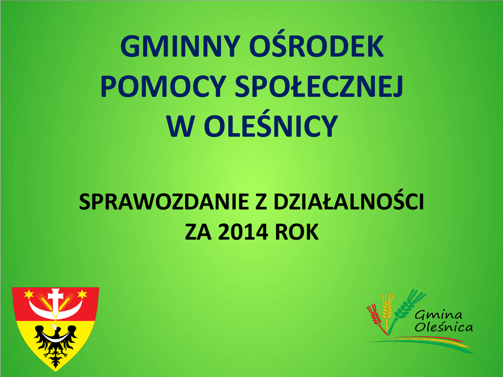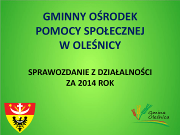 GMINNY OŚRODEK POMOCY SPOŁECZNEJ W OLEŚNICY SPRAWOZDANIE Z DZIAŁALNOŚCI ZA 2014 ROK Pomoc społeczna Umożliwia przezwyciężanie trudnych sytuacji życiowych tym, którzy nie są w stanie sami ich pokonać, wykorzystując własne uprawnienia, zasoby i możliwości. Wspiera osoby w wysiłkach zmierzających do zaspokojenia niezbędnych potrzeb i umożliwia im życie w warunkach odpowiadających godności człowieka. Zadaniem pomocy społecznej jest także zapobieganie trudnym sytuacjom życiowym przez podejmowanie działań profilaktycznych, w tym działań środowiskowych, ukierunkowanych na zmianę postawy klientów, poprzez zwiększenie ich aktywności w rozwiązywaniu swoich trudnych problemów życiowych. Odbiorcy pomocy społecznej = Mieszkańcy Gminy Oleśnica Grupy odbiorców Rodziny, Osoby starsze, samotne, Osoby z niepełnosprawnością, Młodzież, Dzieci. Grupy odbiorców wymagające szczególnego wsparcia Osoby i rodziny zagrożone marginalizacją i wykluczeniem społecznym, Rodziny z problemami opiekuńczo – wychowawczymi, Osoby z niepełnosprawnością, w tym osoby chore psychicznie, Osoby starsze, niesamodzielne, samotne. Zakres działań i formy pomocy udzielanej przez GOPS w Oleśnicy Praca socjalna Praca socjalna to działalność zawodowa mająca na celu pomoc osobom i rodzinom we wzmacnianiu lub odzyskiwaniu zdolności do funkcjonowania w społeczeństwie poprzez pełnienie odpowiednich ról społecznych oraz tworzenie warunków sprzyjających temu celowi oraz rozwinięcia lub wzmocnienia aktywności i samodzielności życiowej. Świadczenia w zakresie pomocy społecznej zasiłki stałe, zasiłki celowe i celowe specjalne w tym: zasiłki na zakup żywności lub posiłku, zasiłki okresowe, posiłek dla dzieci i młodzieży w szkołach, odpłatność gminy za pobyt w domach pomocy społecznej. Pomoc w zakresie dożywiania realizowana jest poprzez: zasiłki celowe na zakup posiłku lub żywności, finansowanie dożywiania w szkołach dzieci i młodzieży, udzielanie świadczenia rzeczowego w postaci produktów żywnościowych. Liczba osób, którym Liczba przyznano decyzją świadczeń świadczenie Rodzaj świadczenia Zasiłki stałe w tym: - osoby samotnie gospodarujące - osoby pozostające w rodzinie 47 39 8 486 407 79 47 39 8 Liczba osób, którym Liczba przyznano decyzją świadczeń świadczenie Rodzaj świadczenia Liczba rodzin Liczba rodzin Liczba osób w rodzinie 58 9 19 Liczba osób w rodzinie Pomoc dofinansowywana Zasiłki okresowe 85 272 82 261 Posiłek - dla dzieci w szkołach, przedszkolach , ośrodkach 180 19.616 105 466 x 235 88 Pomoc ze środków własnych Zasiłki celowe i w naturze w tym: - zasiłki celowe specjalne Odpłatność gminy za pobyt w Domu Pomocy Społecznej 235 88 7 149 84 7 653 225 7 W 2014r. na „dożywianie” wydatkowano 160.838,54zł, z czego Ośrodek pozyskał dofinansowanie w kwocie 89.000,00zł, w ramach wieloletniego programu wspierania finansowego gmin w zakresie dożywiania, „Pomoc państwa w zakresie dożywiania na lata 2014-2020”. Na zasiłki i pomoc w naturze oraz zasiłki stałe w 2014r. wydatkowano 449.690,30zł, w tym 302.242,98zł otrzymano z budżetu Wojewody. Usługi opiekuńcze Usługi opiekuńcze obejmują: podstawową opiekę higieniczną, utrzymanie w czystości pomieszczeń, w którym przebywa podopieczny, pomoc w przygotowywaniu posiłków, załatwianie spraw urzędowych i rodzinnych podopiecznego, zapewnienie kontaktów z otoczeniem. Domy pomocy społecznej Osobie wymagającej całodobowej opieki z powodu wieku, choroby lub niepełnosprawności, niemogącej samodzielnie funkcjonować w codziennym życiu, której nie można zapewnić niezbędnej pomocy w formie usług opiekuńczych, przysługuje prawo do umieszczenia w domu pomocy społecznej. Osobie wymagającej tej formy wsparcia kieruje się do domu pomocy społecznej odpowiedniego typu, zlokalizowanego jak najbliżej miejsca zamieszkania osoby kierowanej, chyba że okoliczności sprawy wskazują inaczej, po uzyskaniu zgody tej osoby lub jej przedstawiciela ustawowego na umieszczenie w domu pomocy społecznej. W 2014r. Ośrodek ponosił częściową odpłatność za pobyt 7 osób w domach pomocy społecznej. W obliczu starzenia się społeczeństwa i wydłużania długości życia, coraz więcej osób wymaga pomocy w formie umieszczenia w domach pomocy społecznej, co wiąże się również ze zwiększającymi się wydatkami gminy na pokrycie kosztów odpłatności za pobyt. Na w/w zadanie Gmina Oleśnica wydatkowała: 2011r. - 72.432 zł 2012r. - 105.260 zł 2013r. - 168.443 zł 2014r. - 188.952 zł Przewidywane potrzeby na odpłatność za pobyt w domach pomocy społecznej w 2015r. wynoszą 300.000 zł. Pomoc osobom bezdomnym Powody bezdomności: rozpad rodziny, eksmisja, powrót z zakładu karnego, przemoc w rodzinie, opuszczenie placówki opiekuńczo wychowawczej, powrót ze szpitala psychiatrycznego. - Pomoc osobom bezdomnym udzielana jest najczęściej w formie rzeczowej poprzez zapewnienie: schronienia, posiłku, odzieży. Wspieranie rodziny Wsparcie asystentów rodziny, czyli osób, które towarzyszą rodzinie w pokonywaniu jej trudności. Pracują, wykorzystując mocne strony rodziny, motywując do zmiany i wyjścia z trudnej sytuacji życiowej. Udzielają wsparcia, stymulują klienta do konstruktywnego korzystania z własnych zasobów, umiejętności i możliwości. W GOPS w Oleśnicy jest zatrudnionych na umowę zlecenia 2 asystentów rodziny. Obejmują wsparciem 14 rodzin z problemami opiekuńczo – wychowawczymi z terenu Gminy Oleśnica. Dla 3 rodzin przyznano asystenta na podstawie Postanowień Sądu Rejonowego w Oleśnicy III Wydział Rodzinny i Nieletnich, pozostałym rodzinom przyznano asystenta na wniosek pracowników socjalnych. Zadaniem własnym gminy zgodnie z zapisami ustawy o wspieraniu rodziny i systemie pieczy zastępczej, jest ponoszenie odpłatności, w przypadku umieszczenia dzieci w rodzinie zastępczej, placówce opi