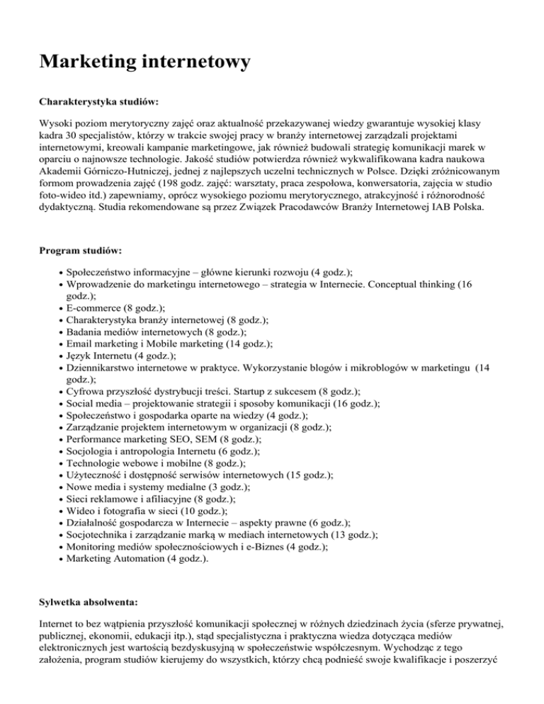 Marketing internetowy Charakterystyka studiów: Wysoki poziom merytoryczny zajęć oraz aktualność przekazywanej wiedzy gwarantuje wysokiej klasy kadra 30 specjalistów, którzy w trakcie swojej pracy w branży internetowej zarządzali projektami internetowymi, kreowali kampanie marketingowe, jak również budowali strategię komunikacji marek w oparciu o najnowsze technologie. Jakość studiów potwierdza również wykwalifikowana kadra naukowa Akademii Górniczo-Hutniczej, jednej z najlepszych uczelni technicznych w Polsce. Dzięki zróżnicowanym formom prowadzenia zajęć (198 godz. zajęć: warsztaty, praca zespołowa, konwersatoria, zajęcia w studio foto-wideo itd.) zapewniamy, oprócz wysokiego poziomu merytorycznego, atrakcyjność i różnorodność dydaktyczną. Studia rekomendowane są przez Związek Pracodawców Branży Internetowej IAB Polska. Program studiów: Społeczeństwo informacyjne – główne kierunki rozwoju (4 godz.); Wprowadzenie do marketingu internetowego – strategia w Internecie. Conceptual thinking (16 godz.); E-commerce (8 godz.); Charakterystyka branży internetowej (8 godz.); Badania mediów internetowych (8 godz.); Email marketing i Mobile marketing (14 godz.); Język Internetu (4 godz.); Dziennikarstwo internetowe w praktyce. Wykorzystanie blogów i mikroblogów w marketingu (14 godz.); Cyfrowa przyszłość dystrybucji treści. Startup z sukcesem (8 godz.); Social media – projektowanie strategii i sposoby komunikacji (16 godz.); Społeczeństwo i gospodarka oparte na wiedzy (4 godz.); Zarządzanie projektem internetowym w organizacji (8 godz.); Performance marketing SEO, SEM (8 godz.); Socjologia i antropologia Internetu (6 godz.); Technologie webowe i mobilne (8 godz.); Użyteczność i dostępność serwisów internetowych (15 godz.); Nowe media i systemy medialne (3 godz.); Sieci reklamowe i afiliacyjne (8 godz.); Wideo i fotografia w sieci (10 godz.); Działalność gospodarcza w Internecie – aspekty prawne (6 godz.); Socjotechnika i zarządzanie marką w mediach internetowych (13 godz.); Monitoring mediów społecznościowych i e-Biznes (4 godz.); Marketing Automation (4 godz.). Sylwetka absolwenta: Internet to bez wątpienia przyszłość komunikacji społecznej w różnych dziedzinach życia (sferze prywatnej, publicznej, ekonomii, edukacji itp.), stąd specjalistyczna i praktyczna wiedza dotycząca mediów elektronicznych jest wartością bezdyskusyjną w społeczeństwie współczesnym. Wychodząc z tego założenia, program studiów kierujemy do wszystkich, którzy chcą podnieść swoje kwalifikacje i poszerzyć publicznej, ekonomii, edukacji itp.), stąd specjalistyczna i praktyczna wiedza dotycząca mediów elektronicznych jest wartością bezdyskusyjną w społeczeństwie współczesnym. Wychodząc z tego założenia, program studiów kierujemy do wszystkich, którzy chcą podnieść swoje kwalifikacje i poszerzyć swoją wiedzę z zakresu marketingu internetowego oraz znaleźć zatrudnienie w różnych działach marketingu, agencjach interaktywnych, portalach i innych firmach działających w sieci. Studia kierujemy przede wszystkim do osób interesujących się Internetem, związanych lub planujących związać się z nim zawodowo (menadżerów, grafików, programistów, informatyków, badaczy społecznych). Absolwenci studiów zdobędą wiedzę umożliwiającą im zaprojektowanie, przygotowanie i realizację profesjonalnej strategii obecności marki w sieci. Będą w stanie dobrać narzędzia do zaplanowanych celów marketingowych i zrealizować kampanie. Rozwiną swoją kreatywność i umiejętności niezbędne do prowadzenie biznesu w Internecie. Oprócz wiedzy z zakresu marketingu absolwenci nauczą się efektywnie pracować w grupie z wykorzystaniem nowoczesnych technologii internetowych oraz poznają tajniki wyszukiwania informacji w sieci. Zdobyte umiejętności w zakresie prowadzenia badań internetowych pozwolą absolwentom sprawnie i kompleksowo rozumieć społeczności w Internecie zarówno pod względem analizy socjologicznej, jak również na poziomie doboru grupy docelowej dla określonych usług internetowych. Przyjaźnie omówione najnowsze technologie webowe sprawią, że niezależnie od rodzaju dotychczasowego wykształcenia uczestnika studiów będzie on w stanie łatwo poruszać się w nowoczesnych rozwiązaniach, znać ich określone zalety i wady zarówno pod kątem opłacalności ekonomicznej, jak również odpowiedniego ich doboru w zależności od projektu czy też działań marketingowych. Znajomość narzędzi i trendów związanych z email i mobile marketingiem udoskonali warsztat absolwentów w działaniach z zakresu alternatywnych, często najbardziej opłacalnych form promocji i reklamy w Internecie. Umiejętność tworzenia interfejsów aplikacji i serwisów internetowych, przygotowania funkcjonalności narzędzi internetowych pozwoli uczestnikom studiów w łatwy sposób rozumieć zasady i standardy stosowane podczas tworzenia narzędzi i projektów internetowych. Praktyczna wiedza dotycząca zarządzania projektem internetowym wraz z wiedzą z zakresu prawa w Internecie pozwoli absolwentom na nieskrępowaną aktywność w wielu interesujących przedsięwzięciach interaktywnych. Czas trwania: 2 semestry (od II 2017 r. do I 2018 r.) Termin zgłoszeń: do 15 II 2017 r. Wymagane dokumenty: podanie, kwestionariusz, odpis dyplomu ukończenia studiów, dowód uiszczenia opłaty za I semestr lub za całość studiów. W przypadku rezygnacji ze studiów przed rozpoczęciem zajęć zwracamy w pełni wpłaconą kwotę. Tryb zgłoszeń: kolejność zgłoszeń Liczba miejsc: 36 Miejsce zgłoszeń: AGH, Wydział Humanistyczny ul. Gramatyka 8a, 30-071 Kraków lub pocztą elektroniczną (wraz z załącznikami) na adres [email protected] i [email protected] . Po przesłaniu wiadomości uczestnicy otrzymają potwierdzenie. Osoba przyjmująca zgłoszenia: Katarzyna Leszczyńska (Tel. 508 078 632, [email protecte